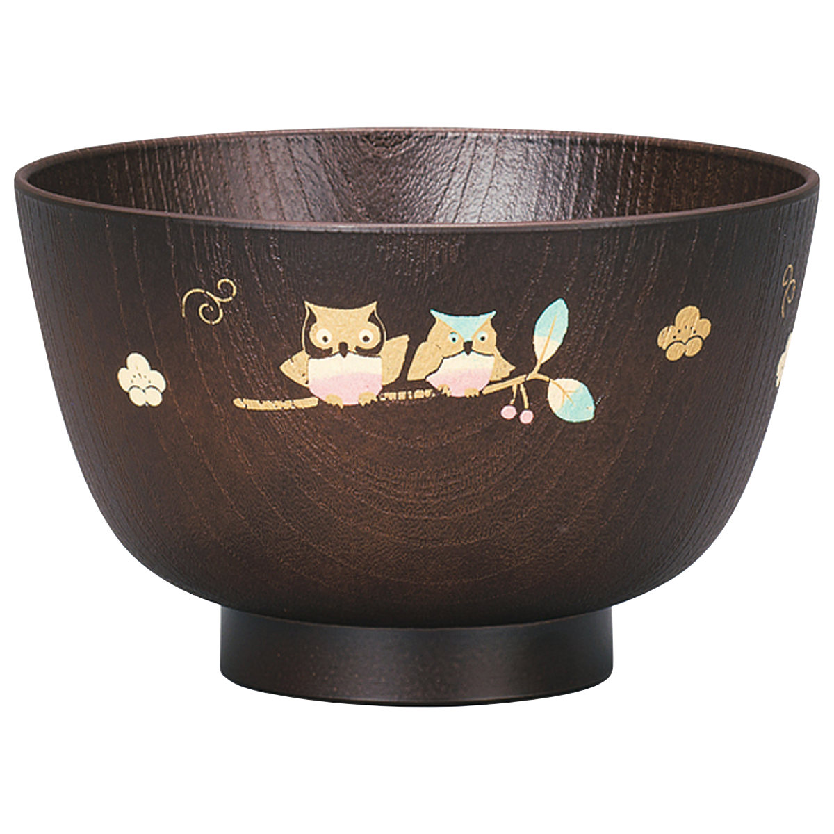 あたたかみのある木目調に、仲良く並んだふくろうの絵柄をあしらった汁椀です。落ち着いた色合いと上品なデザインで、毎日の食卓にはもちろん、お正月やお祝いの席にもぴったりです。