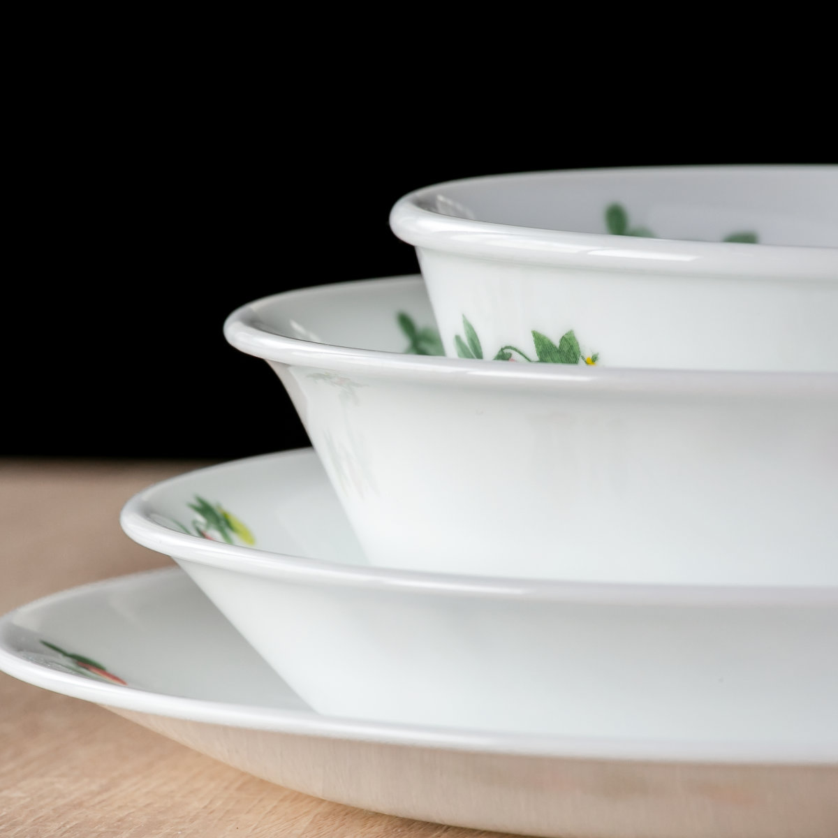 薄く収納できる高台のないシンプルなデザインです。フチがわずかに反り返ることでより割れにくくなっています。