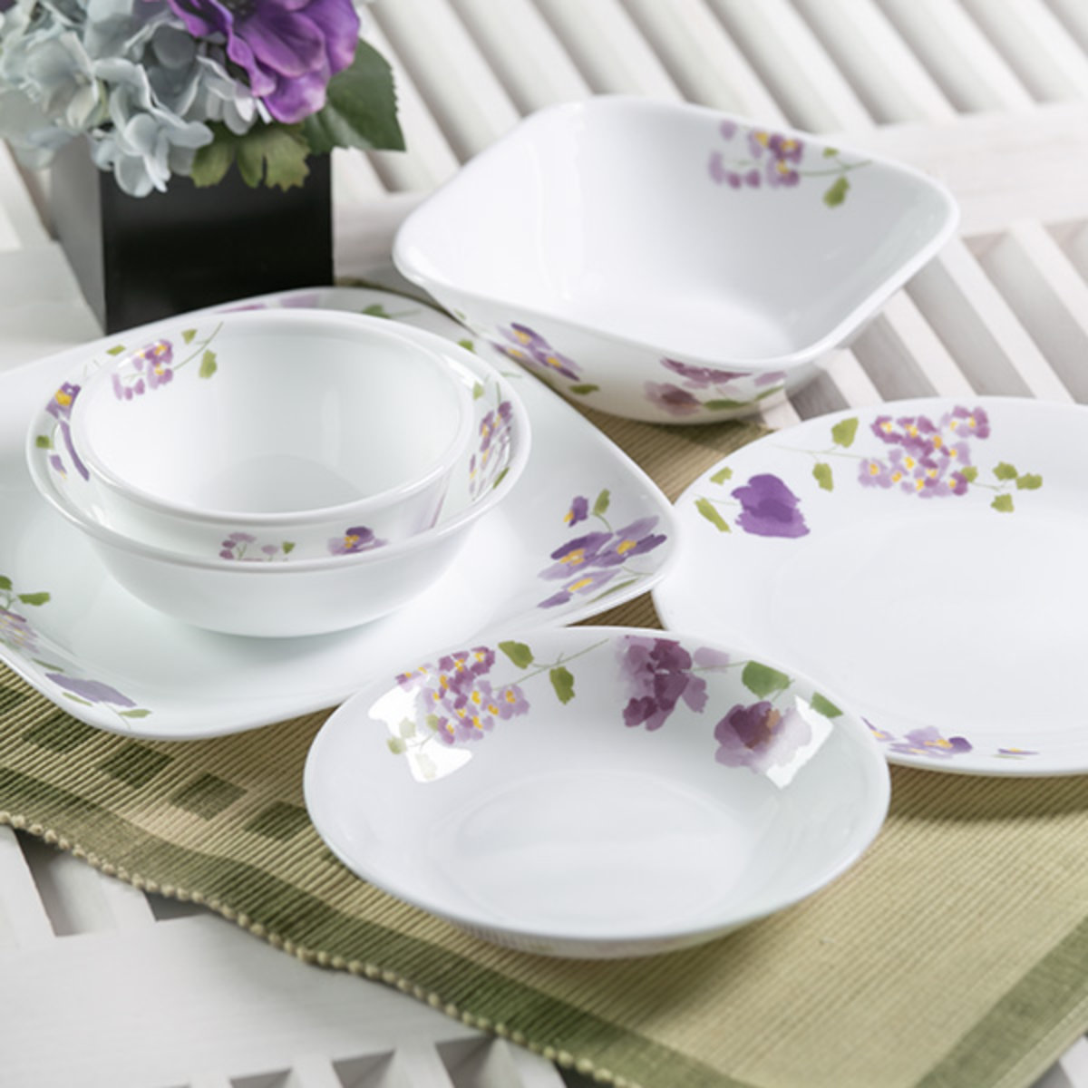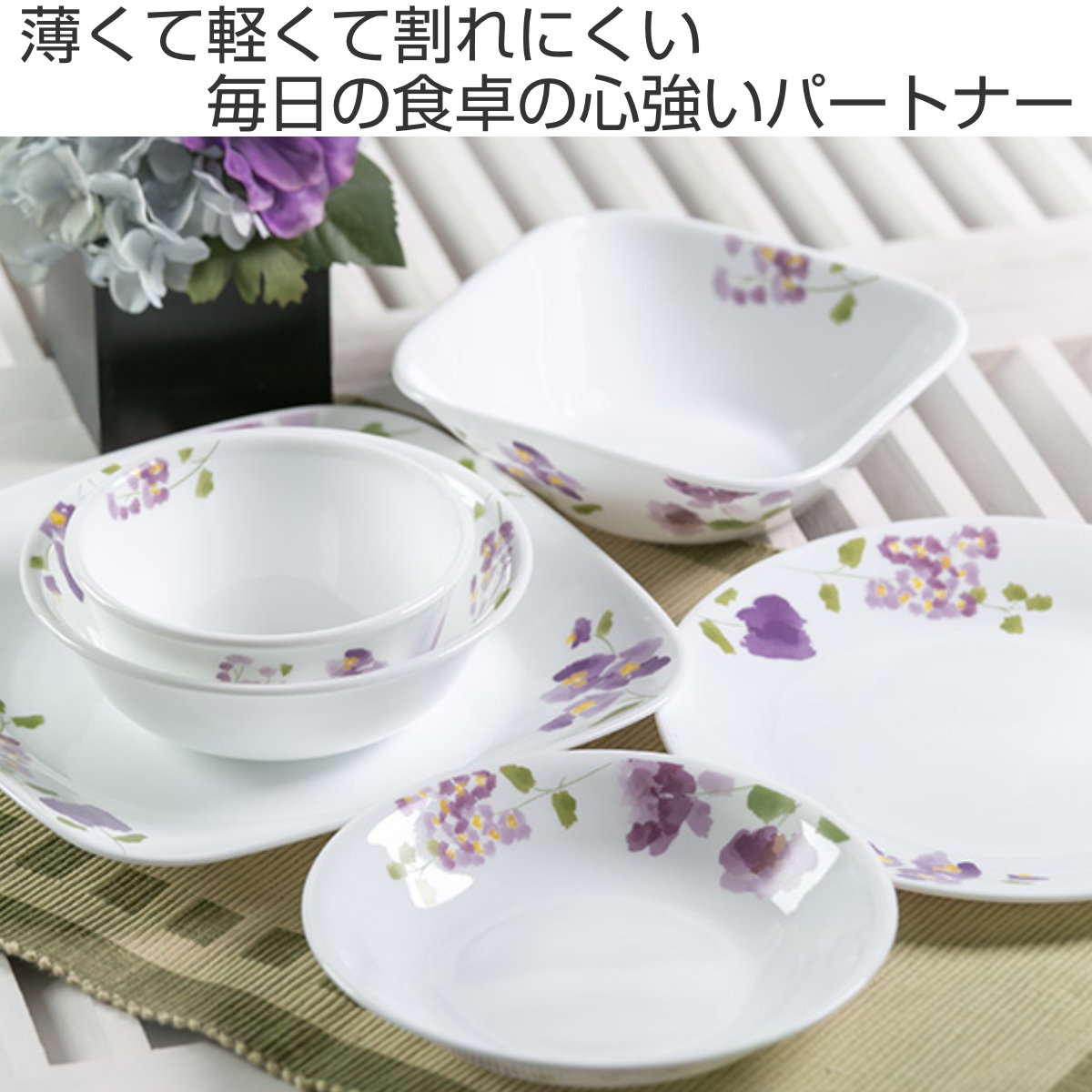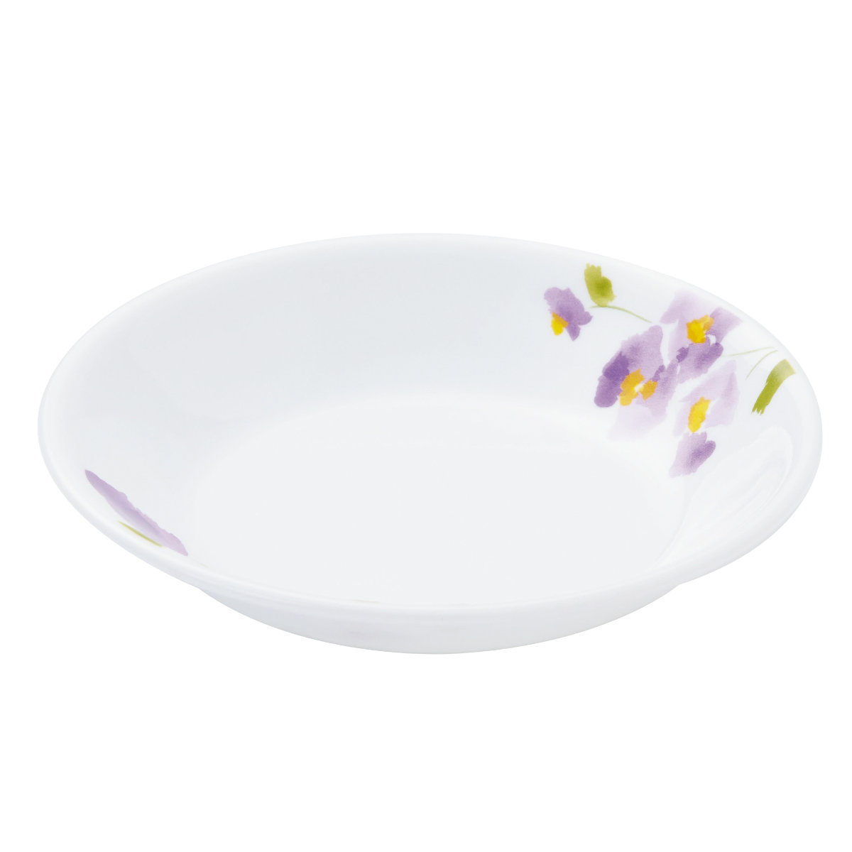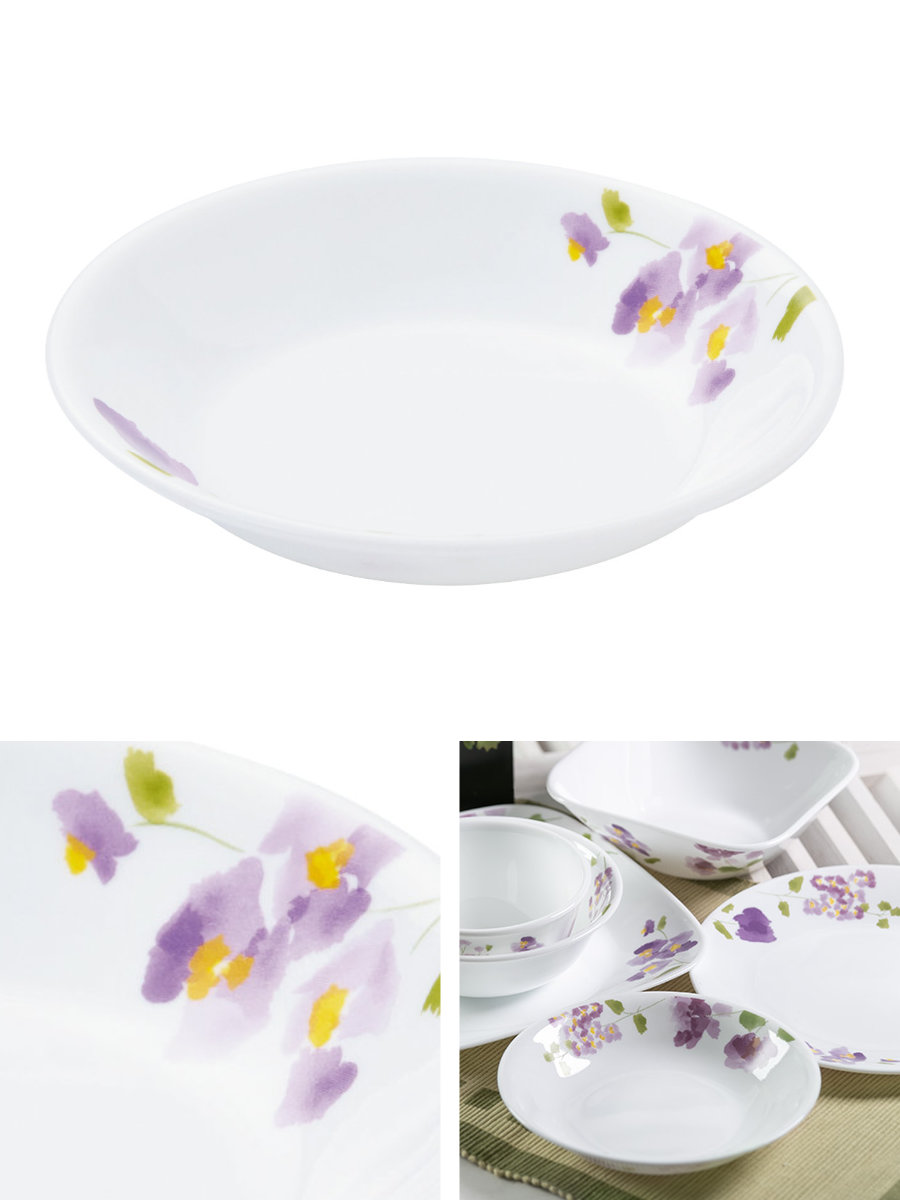 1970年アメリカで誕生したコレールは、世界初の欠け・破損に耐性がある全面積層強化ガラスの食器として、50か国以上のご家庭で愛用されているブランドです。「バイオレットミスト」シリーズは、まるで水彩画のような紫のスミレ柄。主張しすぎずお料理をより一層引き立てます。