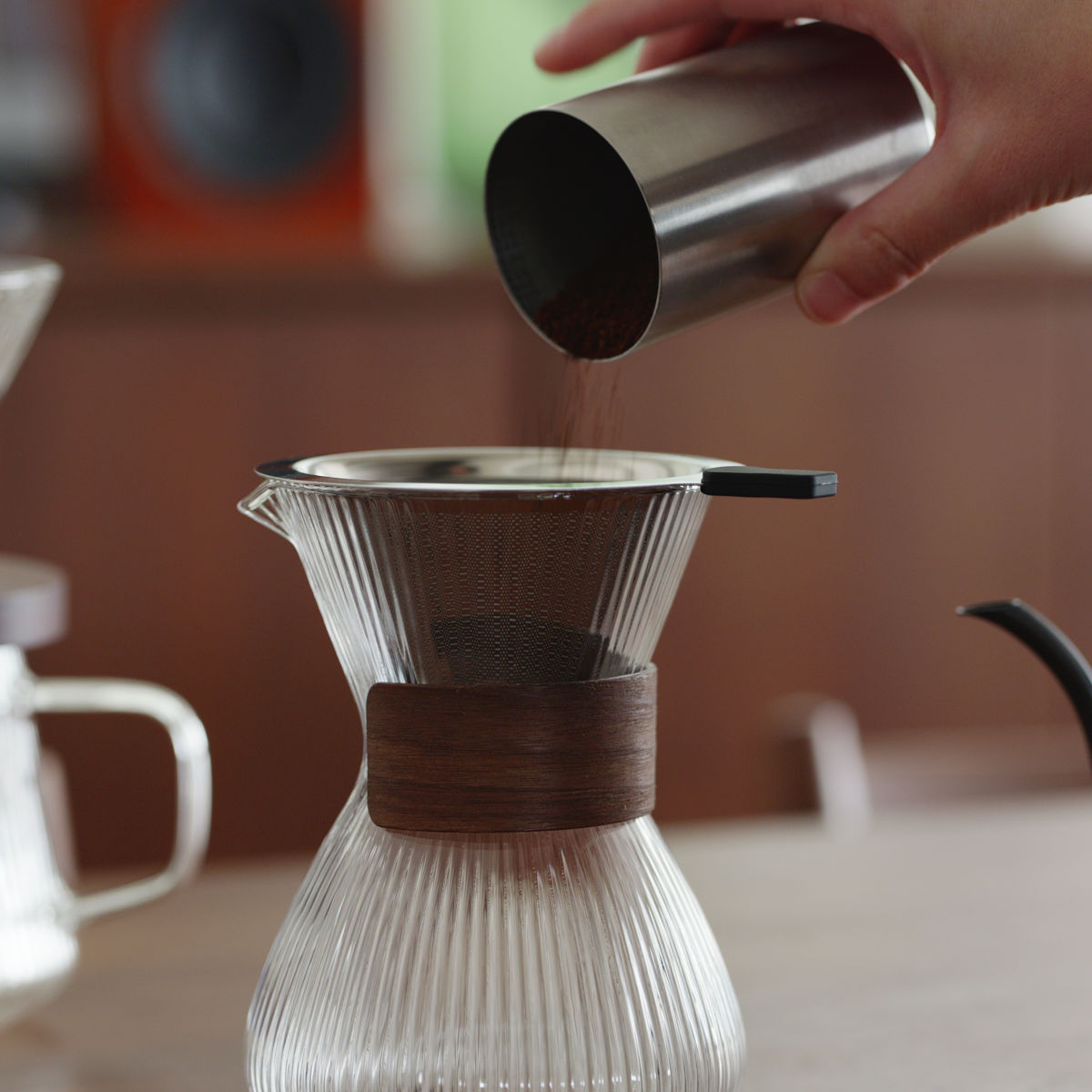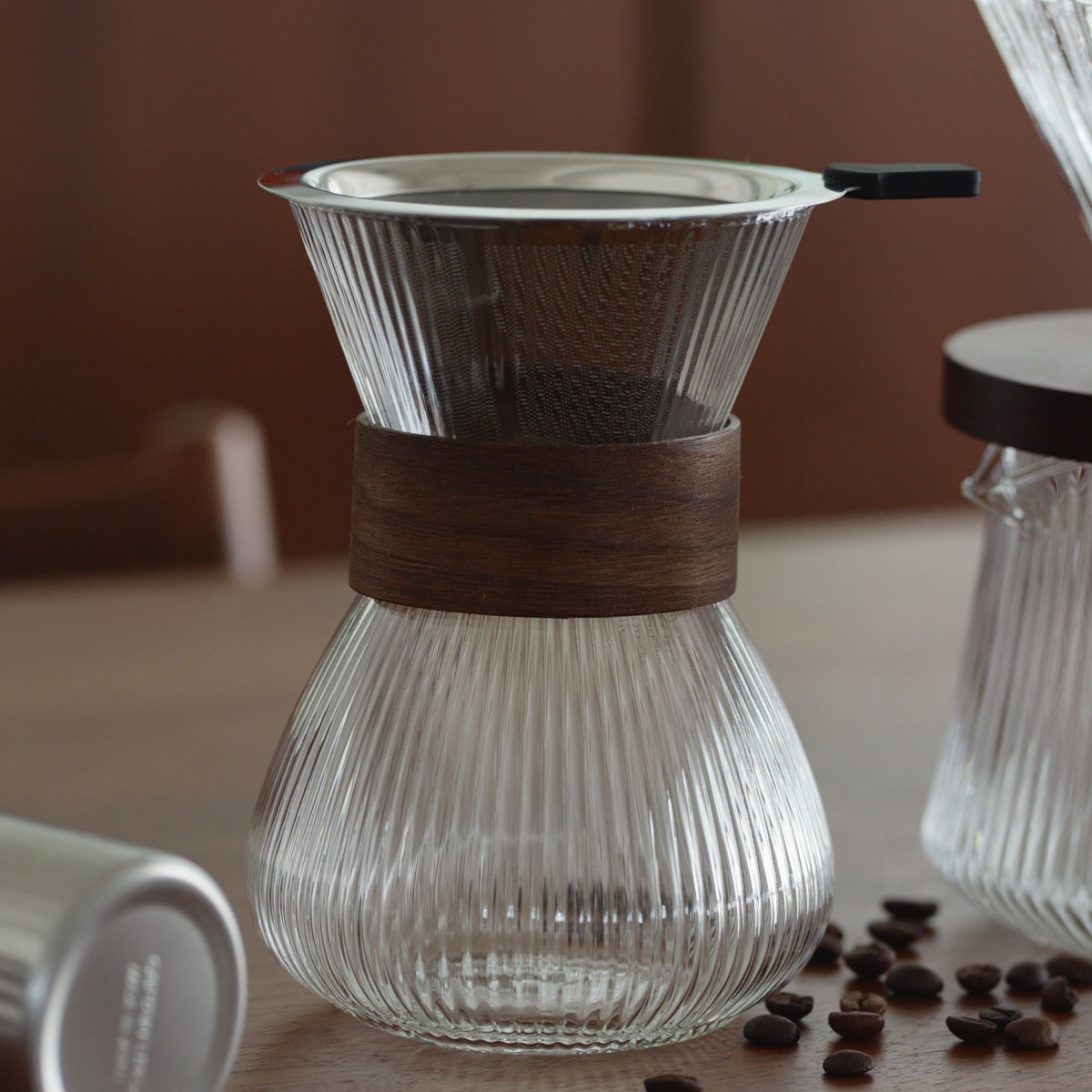 リブラインデザインガラスに、温かみのある木のアクセントを組み合わせた「PYREX CAFE」シリーズ。テーブルに置くだけで絵になる、上質なコーヒータイムを演出します。シリーズで揃えて、お気に入りの豆を挽き、丁寧にドリップ。立ち上る香りとともに、心を満たす贅沢なひとときをお楽しみください。