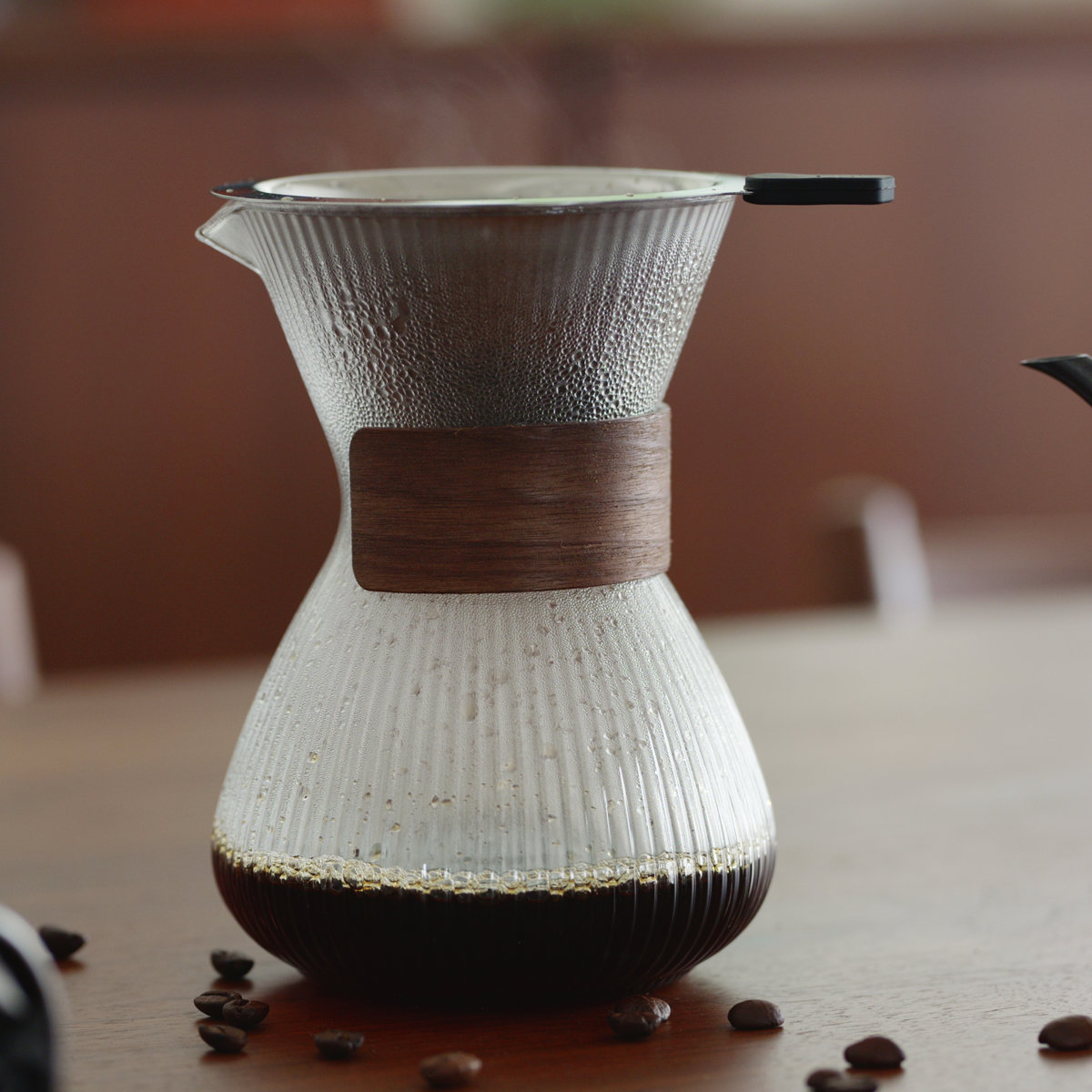 木製ハンドル付きなので、淹れたてのコーヒーを注ぐ際も手が熱くなりにくく、安心して持つことができます。