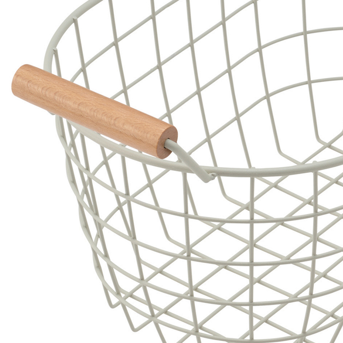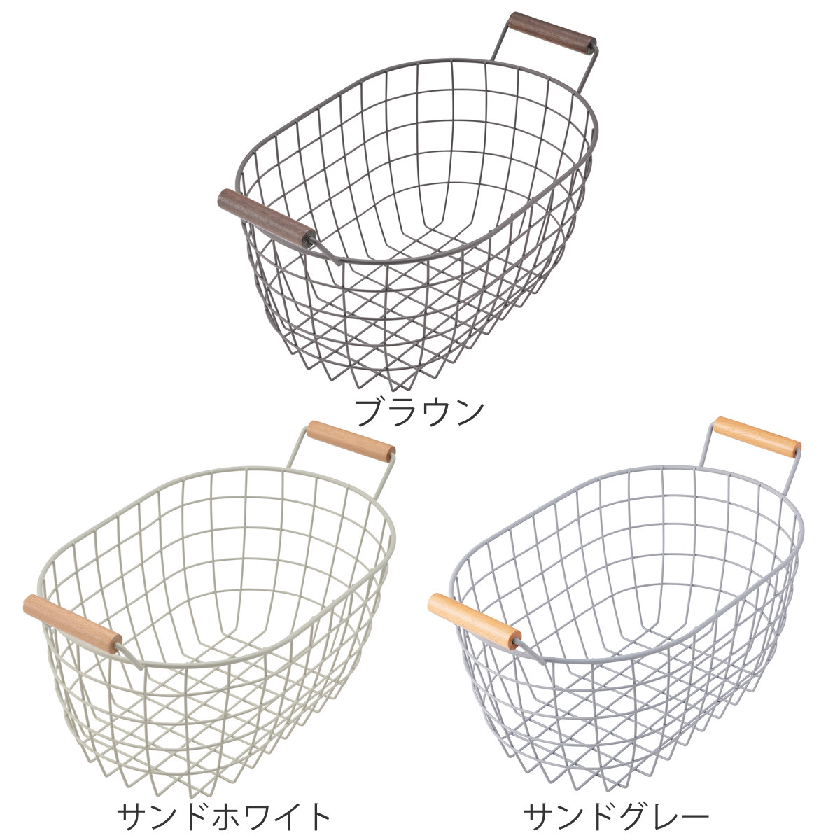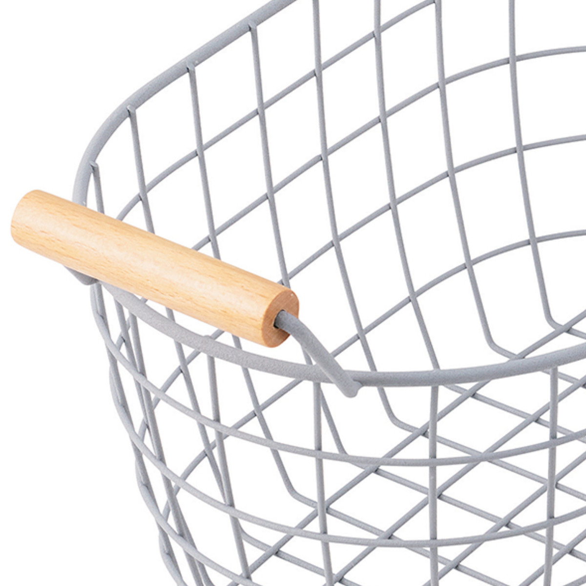 ナチュラルな天然木の持ち手が、シンプルなワイヤーバスケットに上質なニュアンスを加え、暮らしの中に柔らかい木のぬくもりをプラスします。カラーごとに持ち手の天然木の色味を変えており、バスケット本体との組み合わせを美しく見せるこだわりのデザインです。