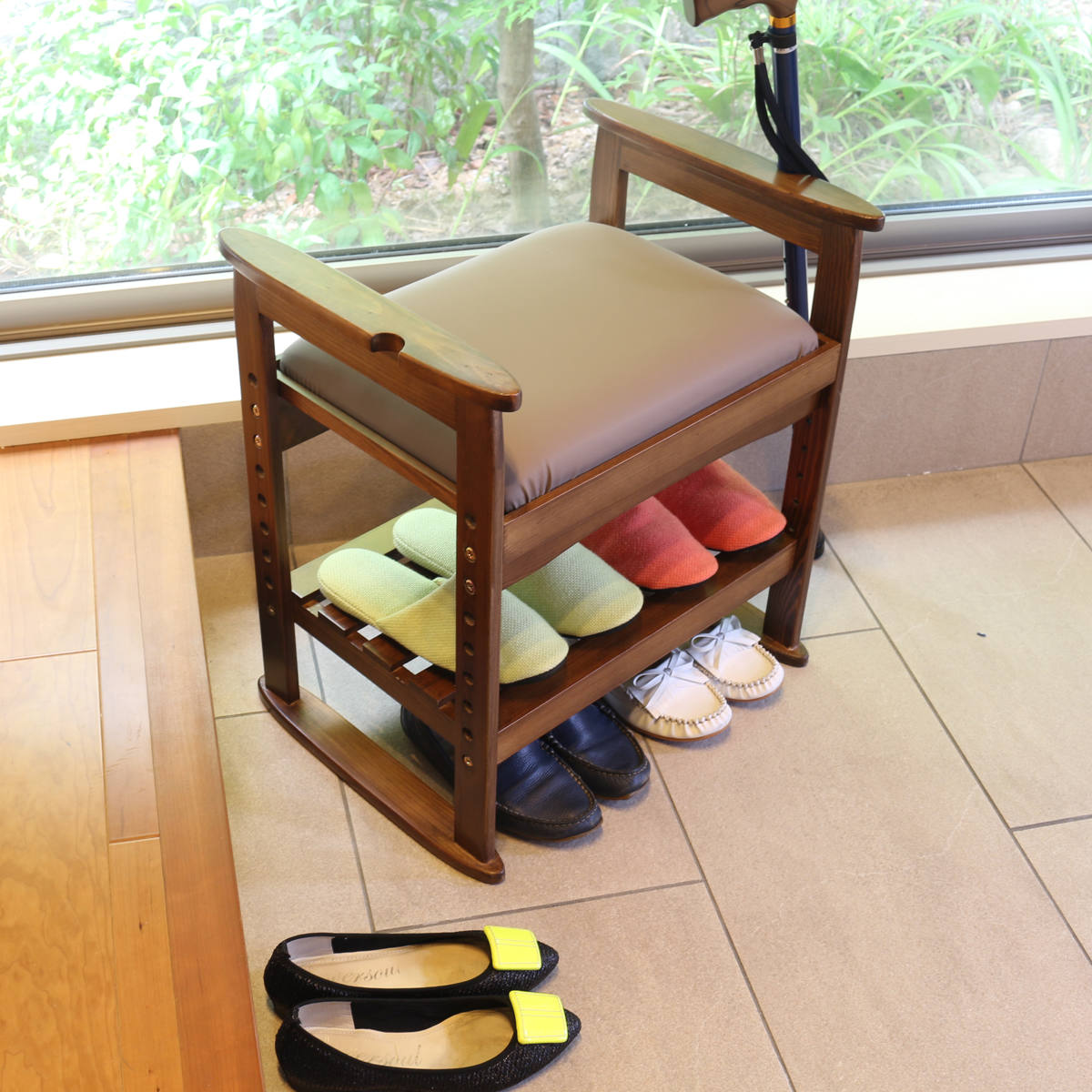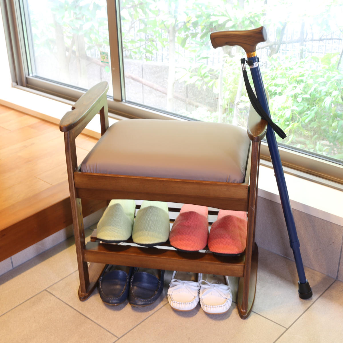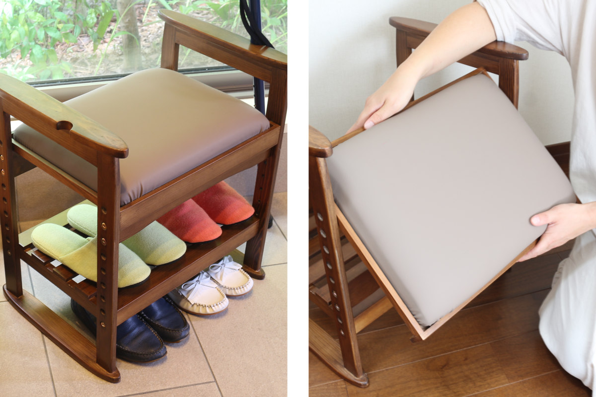高齢の方がいらっしゃるご家庭では、玄関での靴の脱ぎ履き・立ち座りの補助椅子としてのご使用がおすすめです。また、荷物のちょっと置きスペースとしても活用できて便利です。
