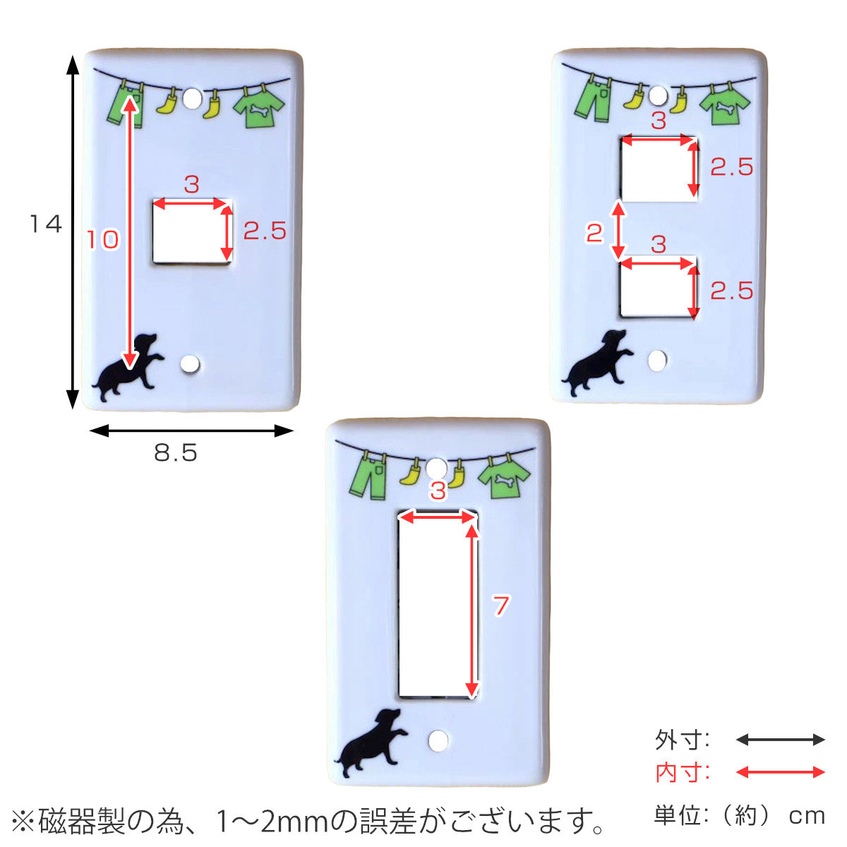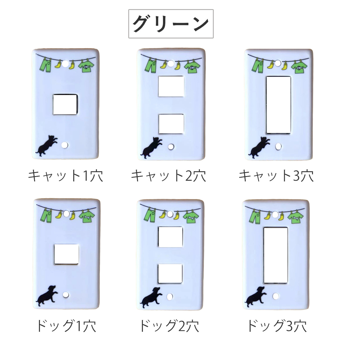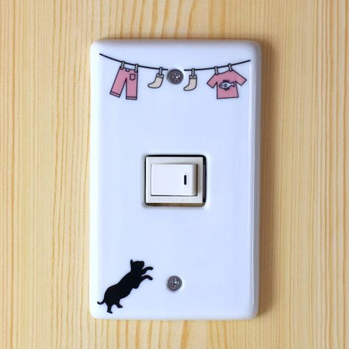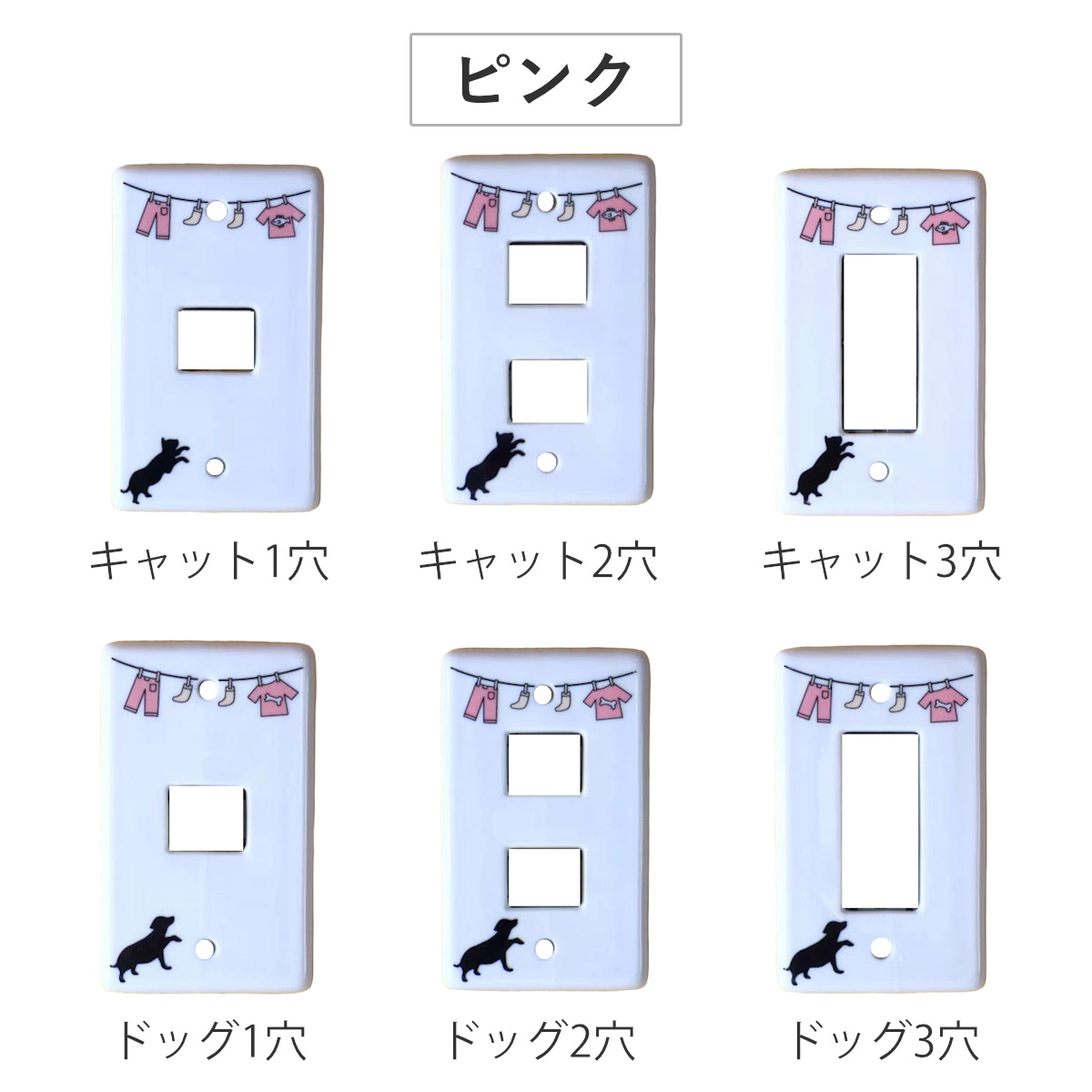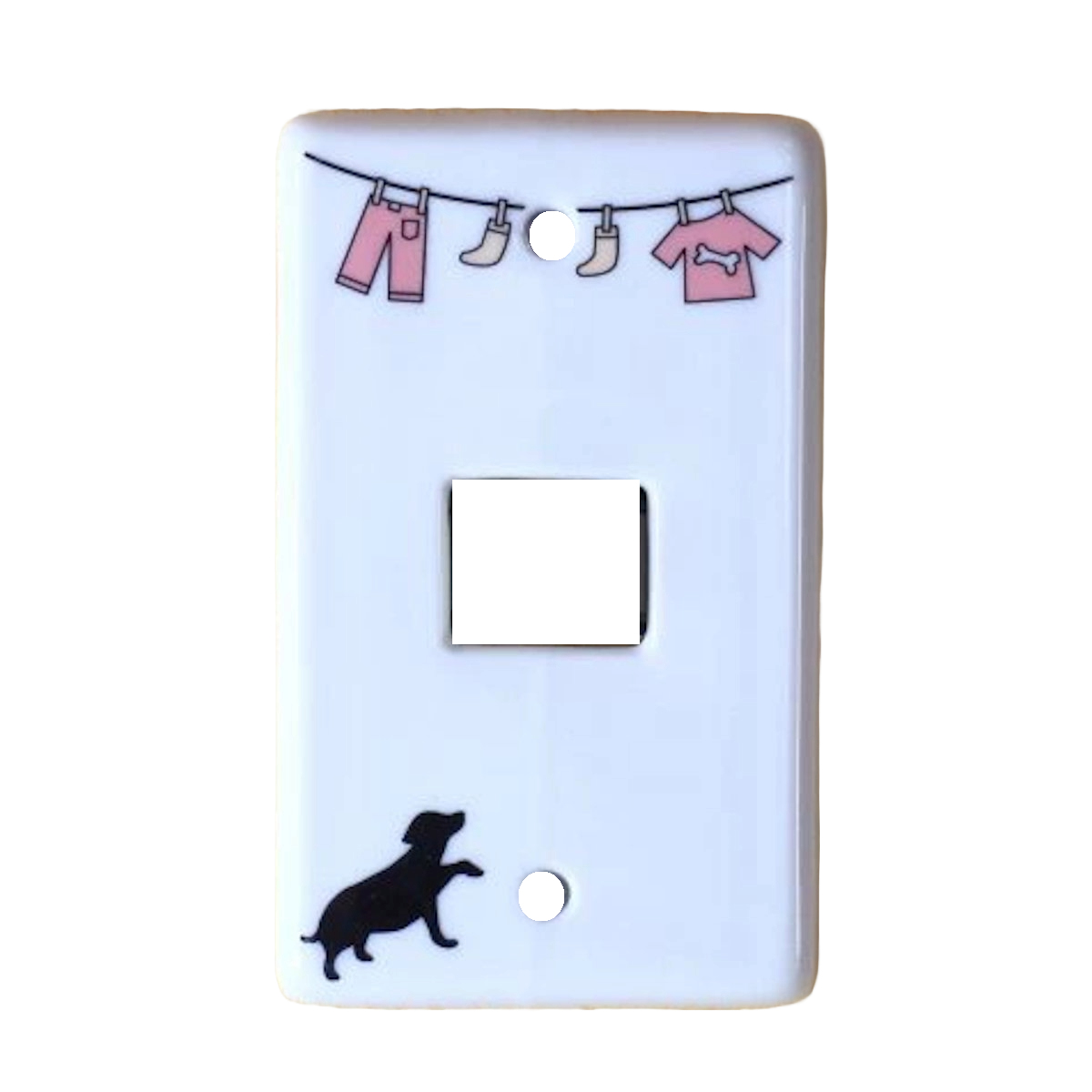 洗濯物干しと動物のほのぼのとした可愛いイラスト入りスイッチプレートです。穴の形は3タイプよりお選びいただけます。汚れが落ちやすい磁器製なのでお手入れも簡単です。