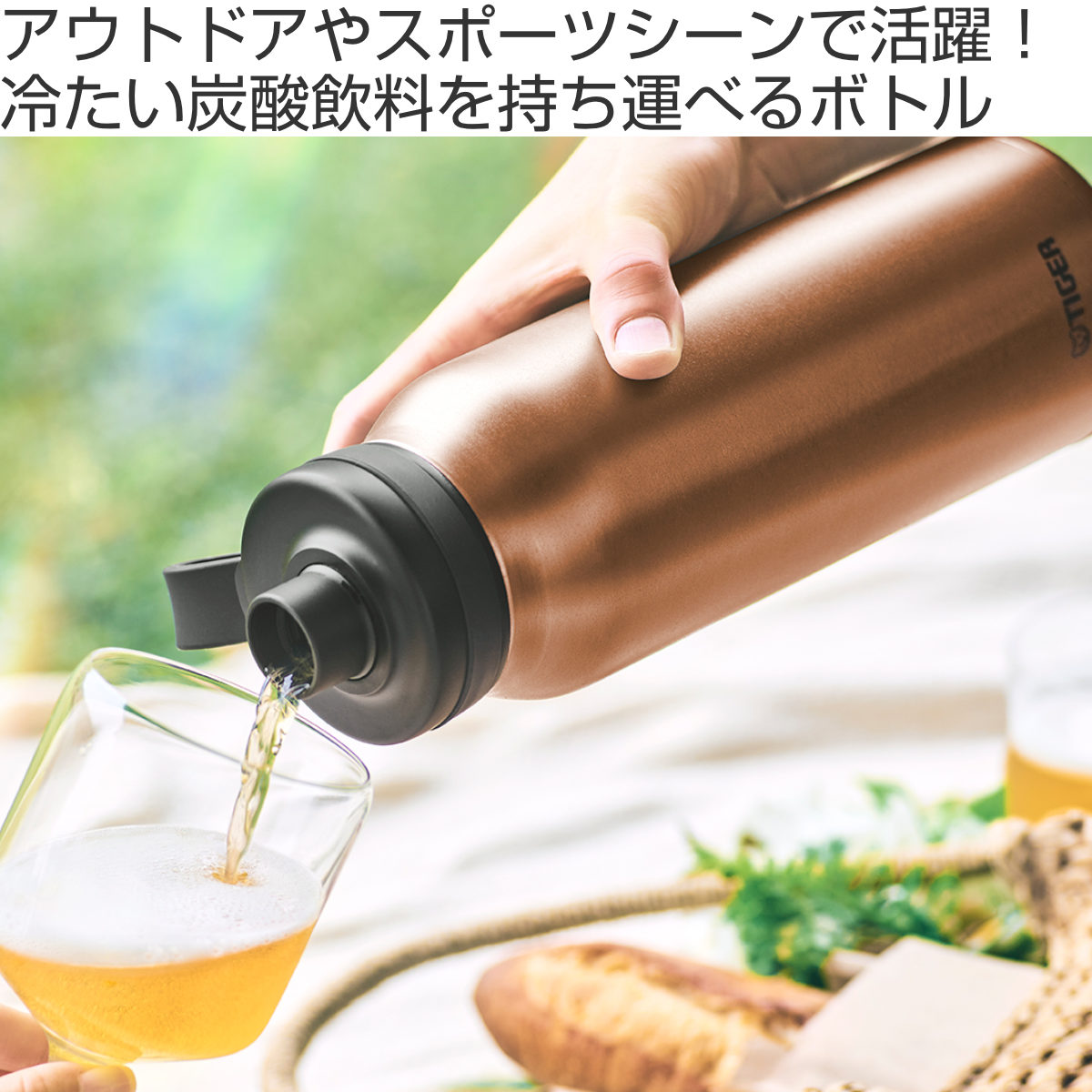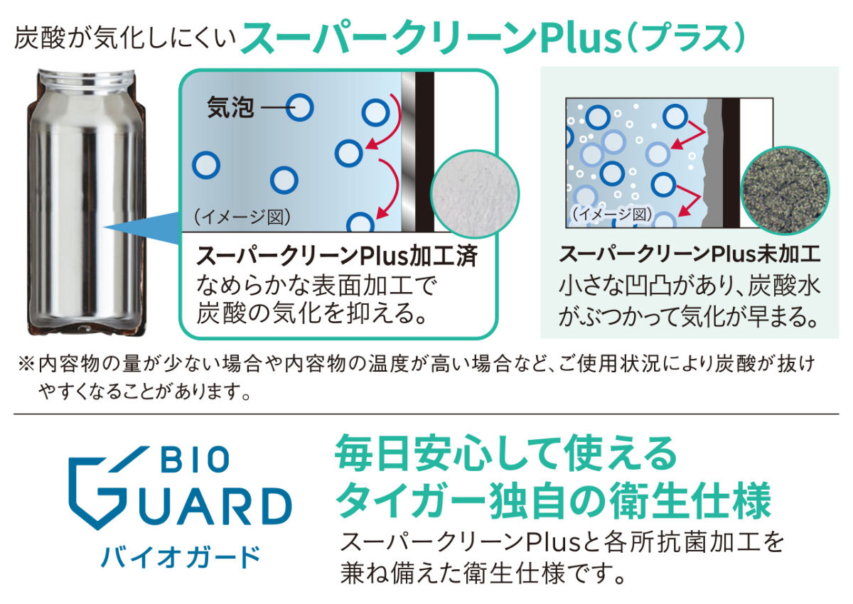 タイガー魔法瓶が独自に開発したBubbleLogic(バブルロジック)を採用しています。炭酸ガスの噴き出しを防ぐため、キャップ開栓時に作動する「炭酸ガス抜き機構」と、万が一、ボトル内の圧力が高まった異常時に作動する「安全弁」を備えています。
