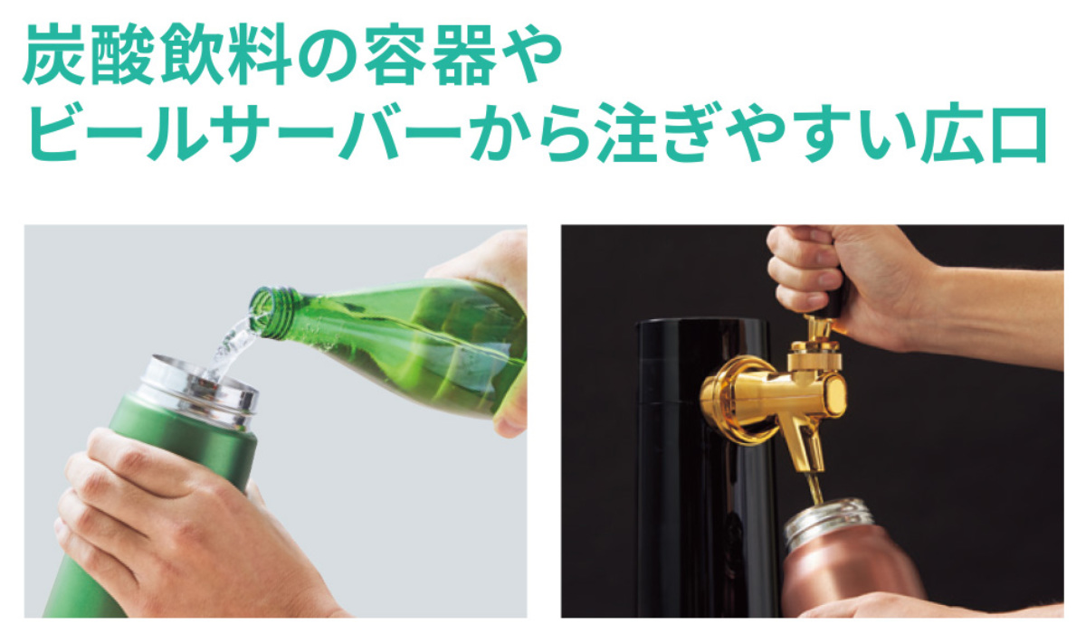 口径はビールサーバーからも炭酸飲料ボトルからも注ぎやすい広口設計です。