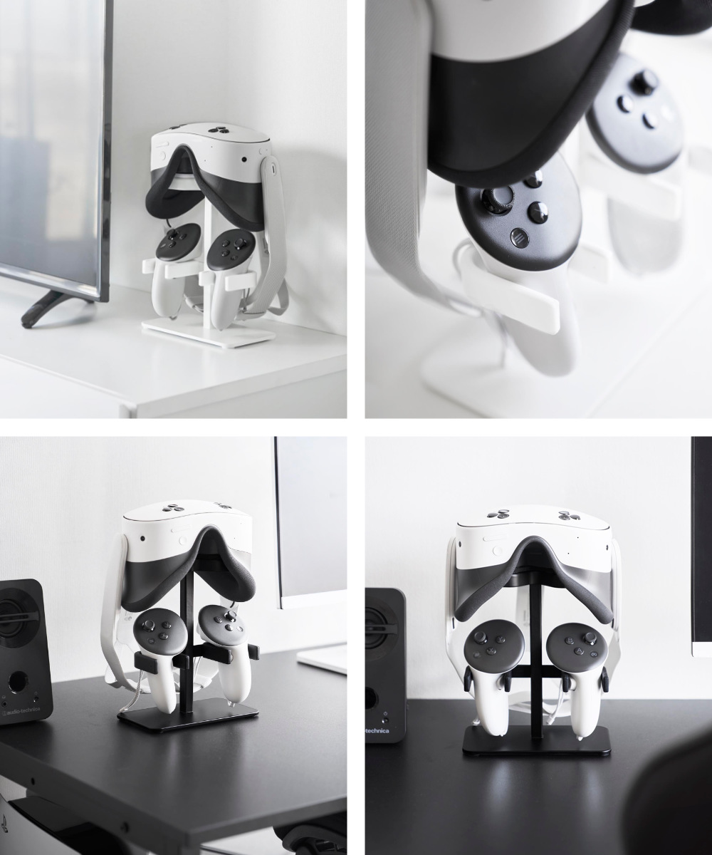 置き場所に困るVRゴーグルとコントローラーをまとめて収納できるラックです。充電しながら縦置きでスッキリ収納できます。