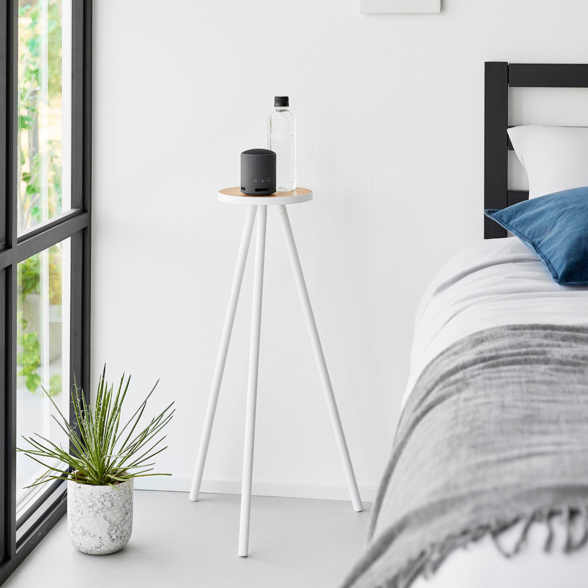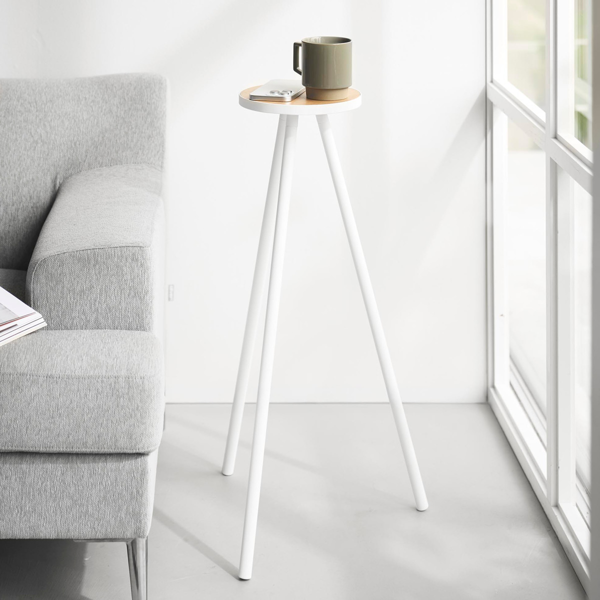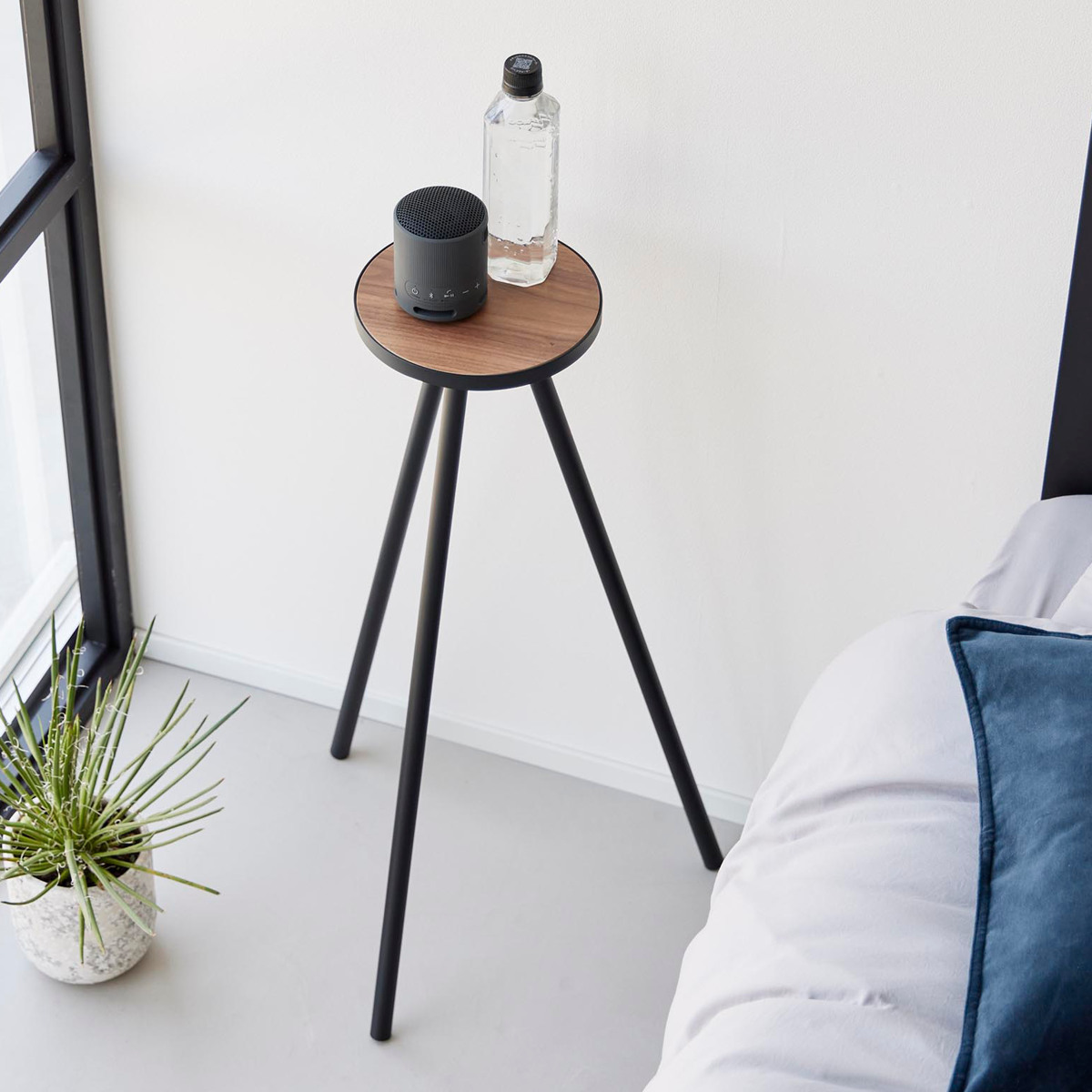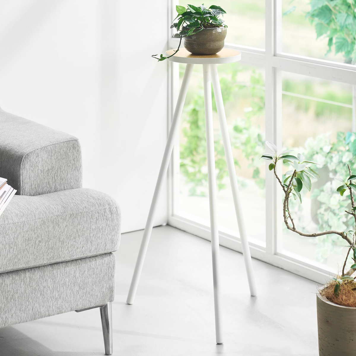 飲み物やスマートフォン、ノートパソコンなどを手元に置ける省スペース設計です。小さな植物のディスプレイにも便利です。