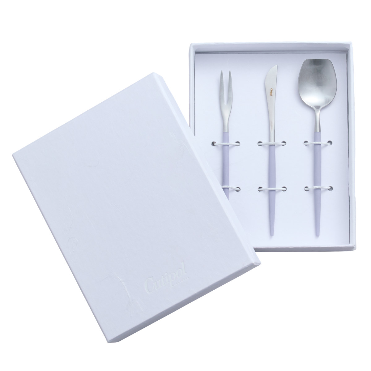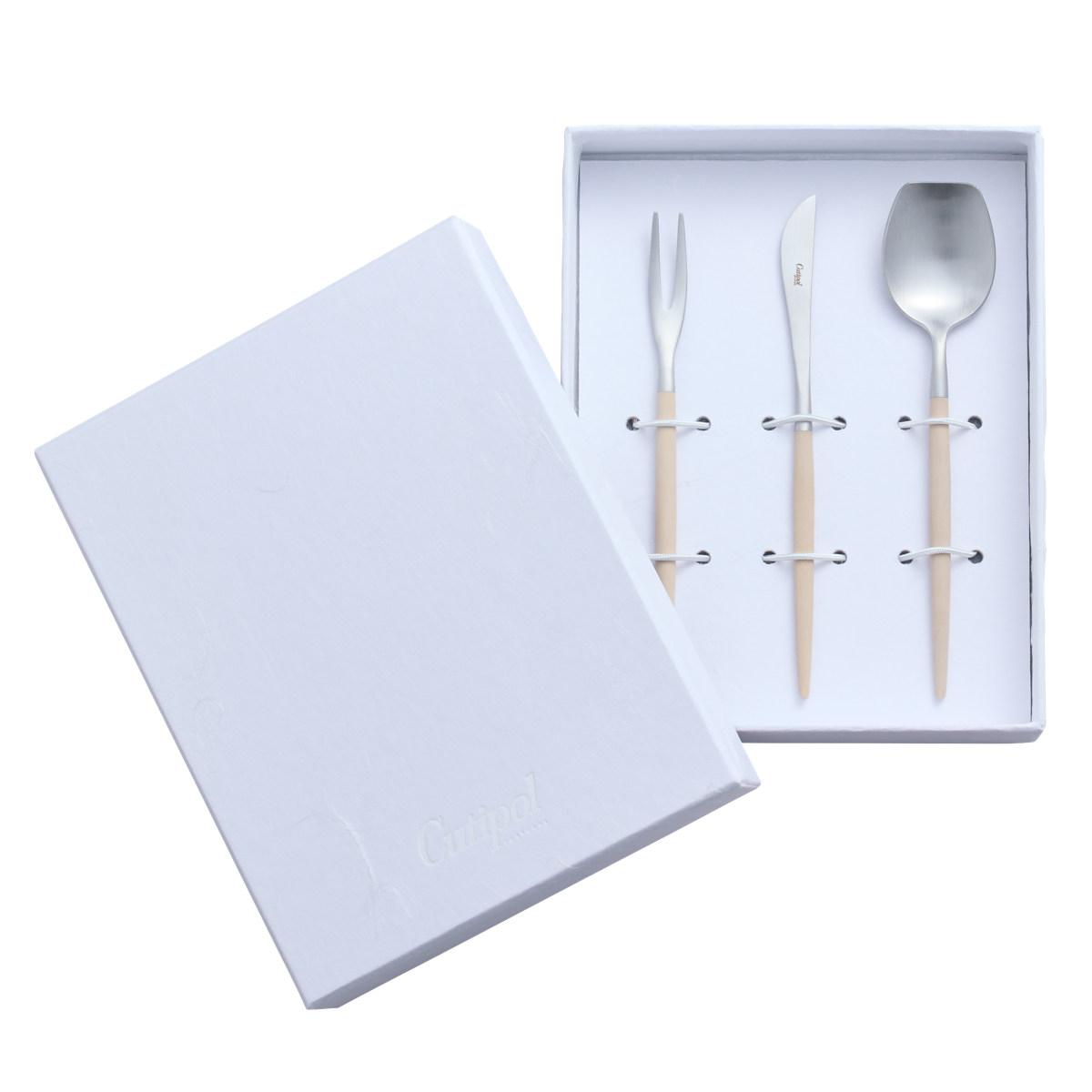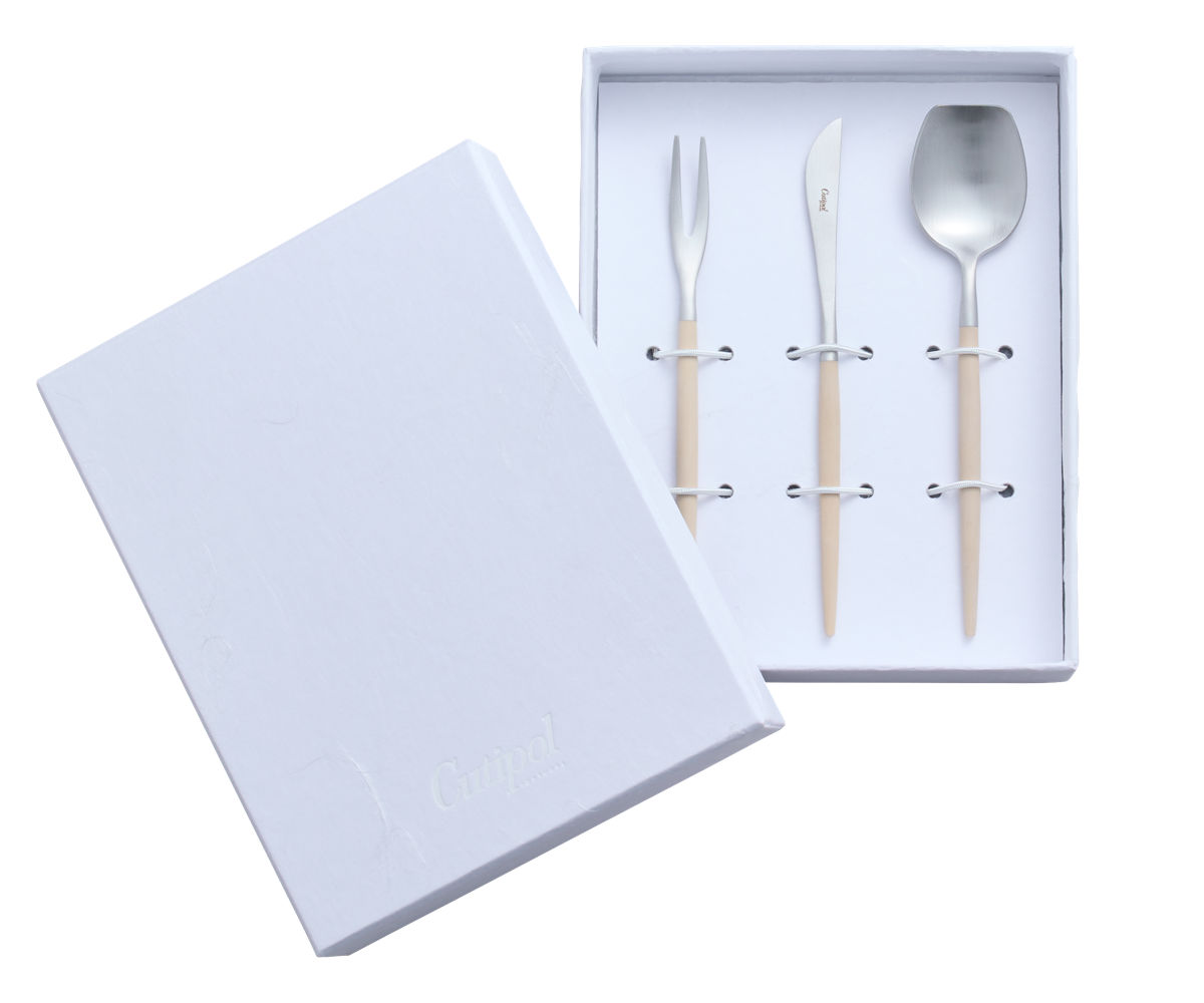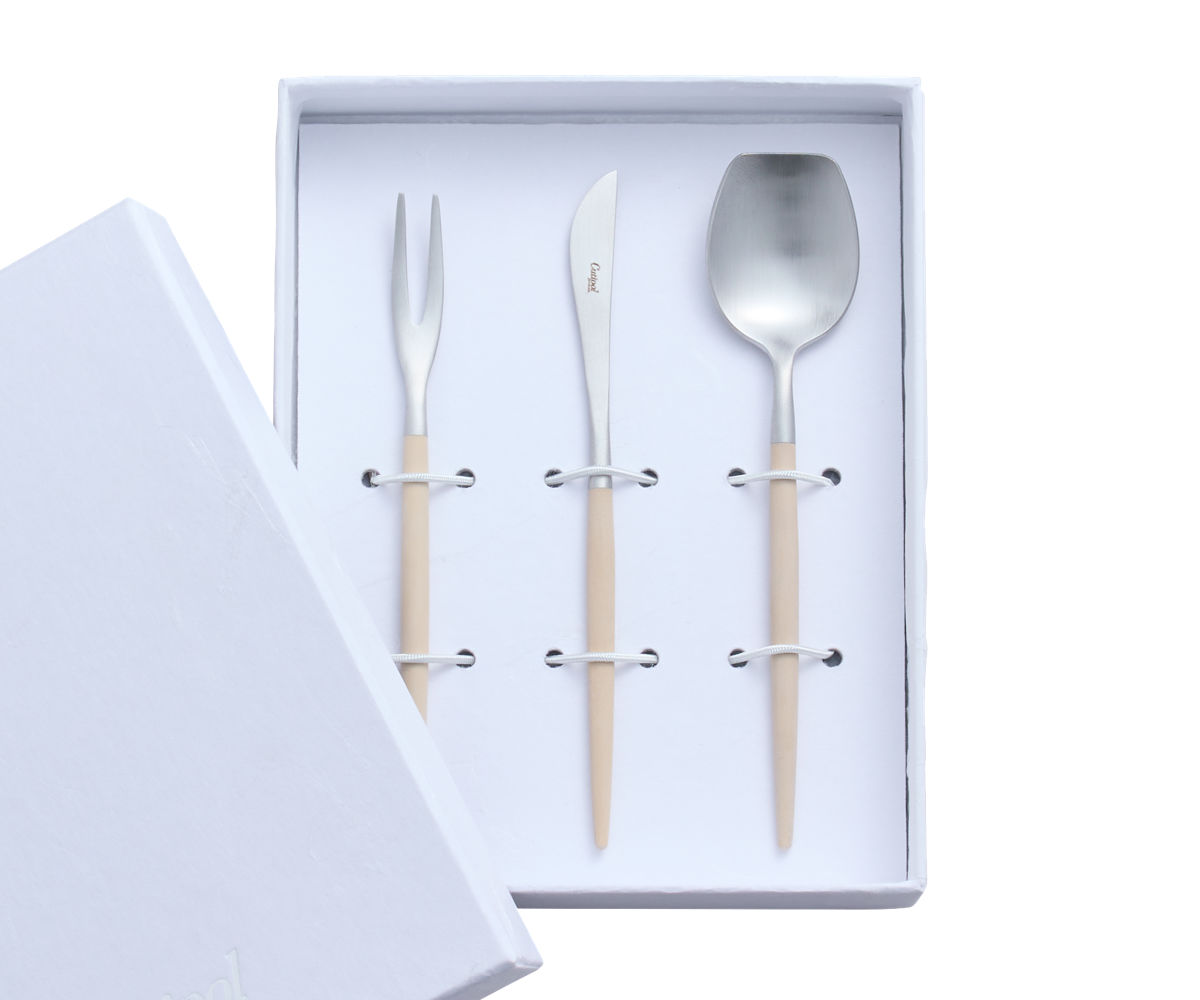 クチポールの和菓子専用のカトラリーセットです。クチポールのシャープで特徴的なナイフの形状をそのまま生かした菓子切り、先端が平らで容器の底をすくいやすいアイスクリームスプーン、繊細な和菓子も楽しめるようにデザインされたフォークの3本セットで贅沢なひとときを。