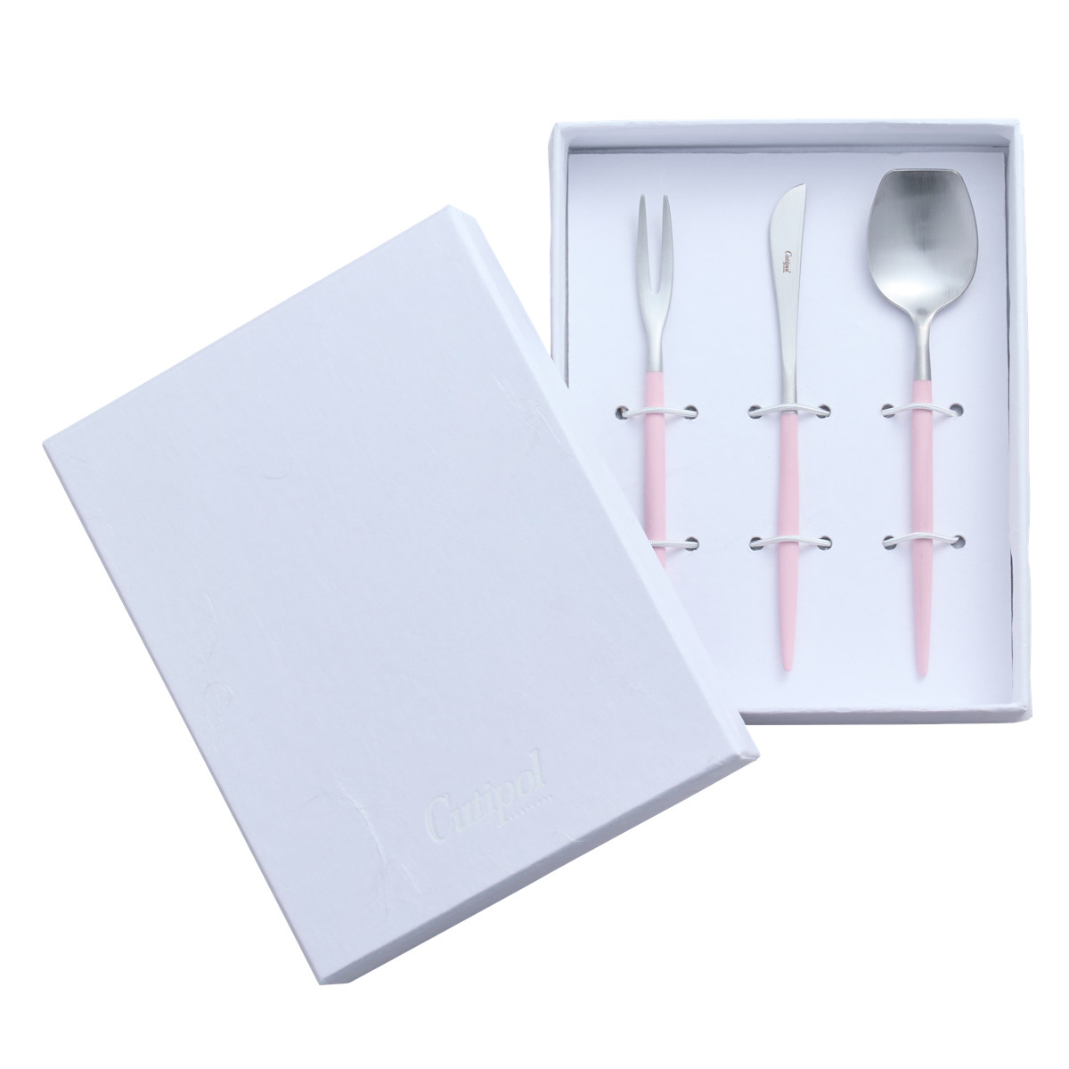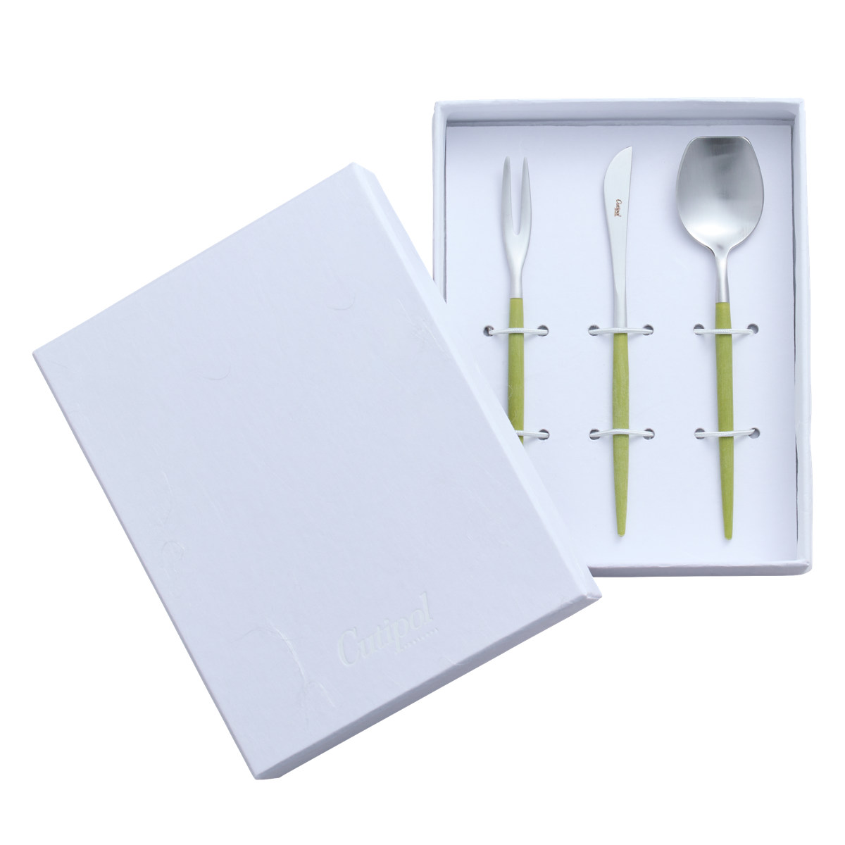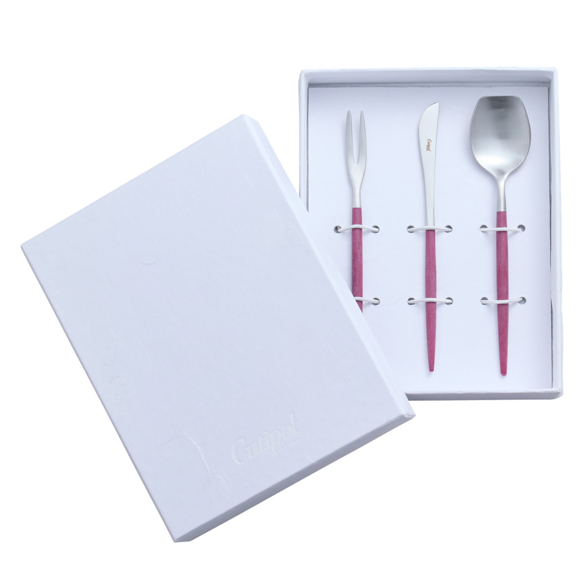クチポールの和菓子専用のカトラリーセットです。クチポールのシャープで特徴的なナイフの形状をそのまま生かした菓子切り、先端が平らで容器の底をすくいやすいアイスクリームスプーン、繊細な和菓子も楽しめるようにデザインされたフォークの3本セットで贅沢なひとときを。