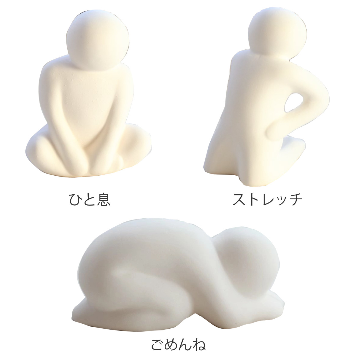 | サイズ | ひと息 約 幅6.5×高さ4.8cm ストレッチ 約 幅5.8×高さ5.5cm ごめんね 約 幅9.4×高さ4.7cm |