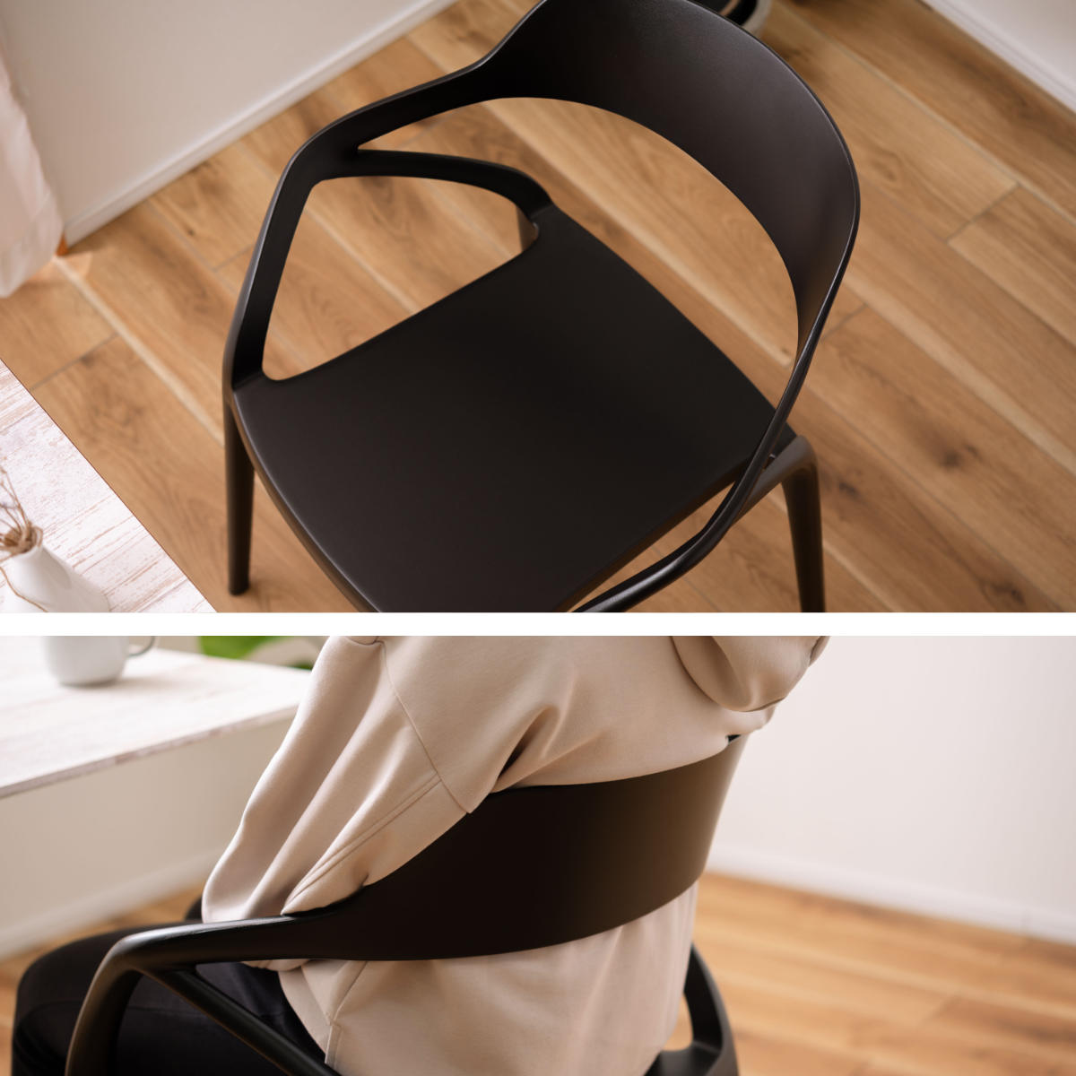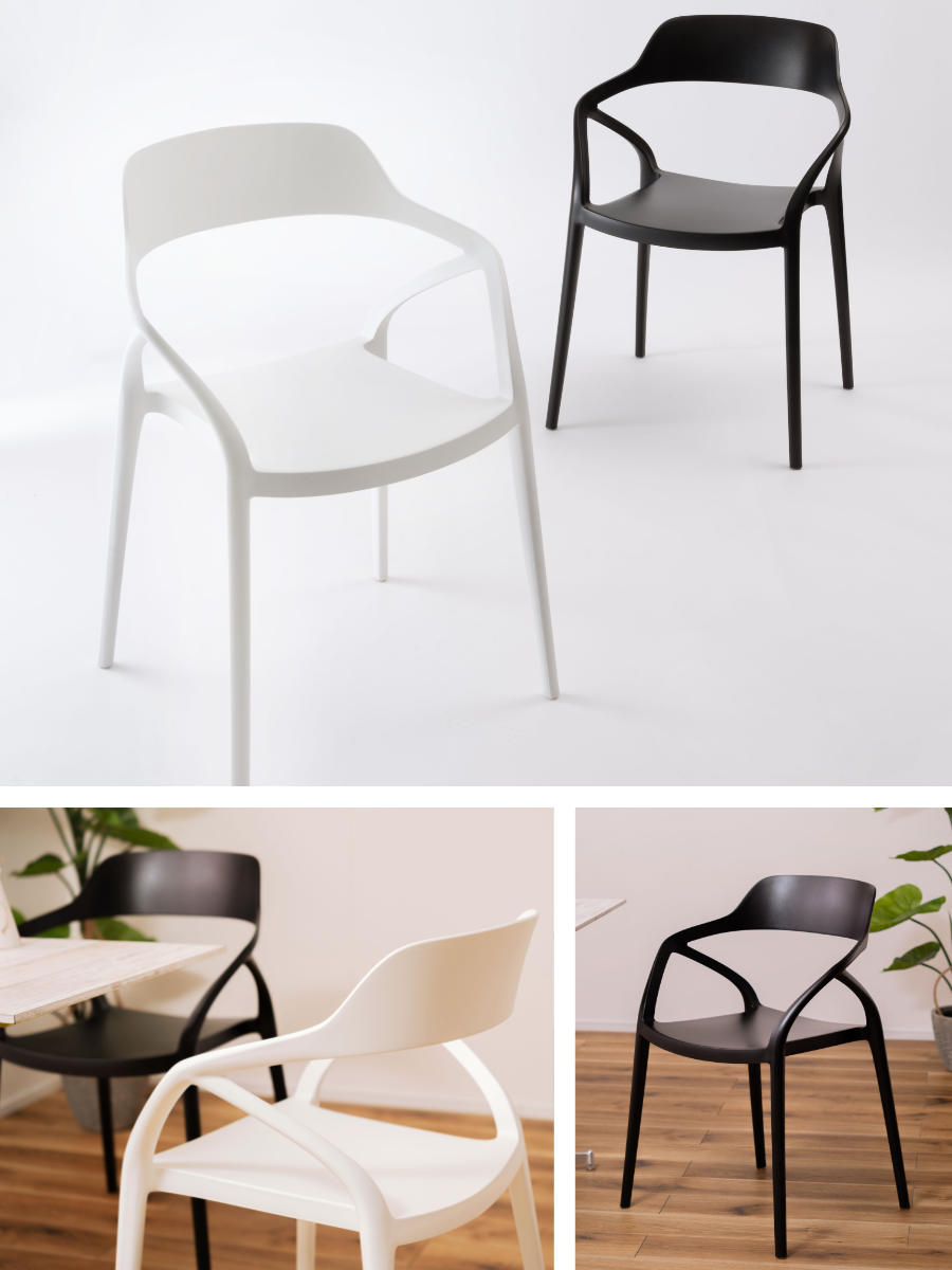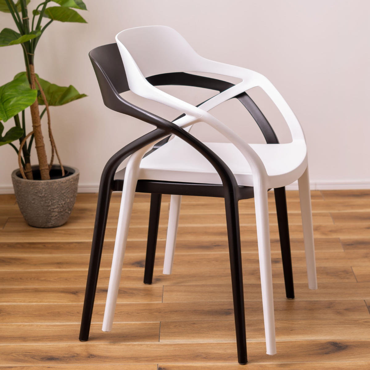 無駄のないスタイリッシュなフォルムが魅力のアーム付きチェア。曲線を活かしたデザインとポリプロピレン製の軽やかさで、どんな空間にもすっと馴染む使いやすい一脚です。