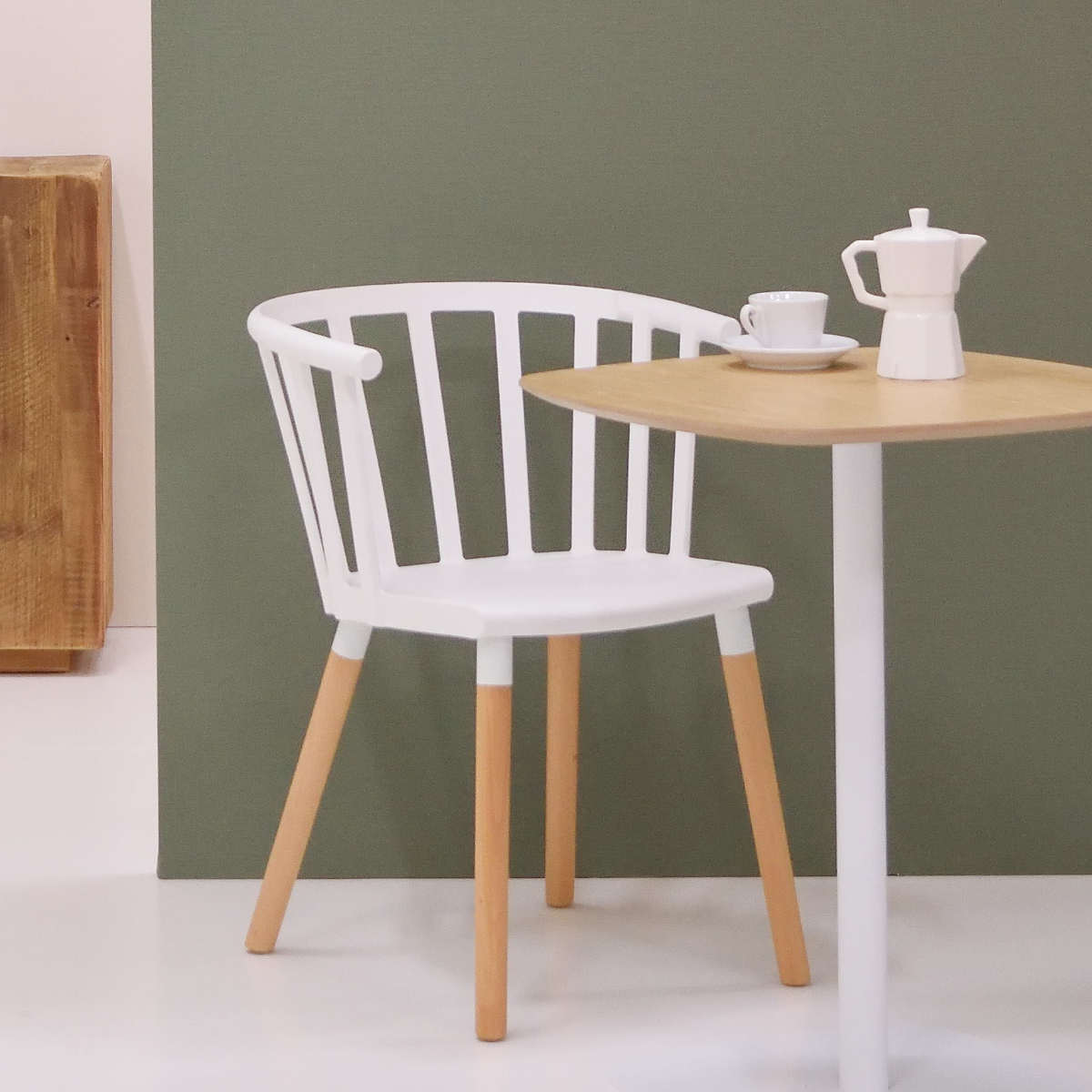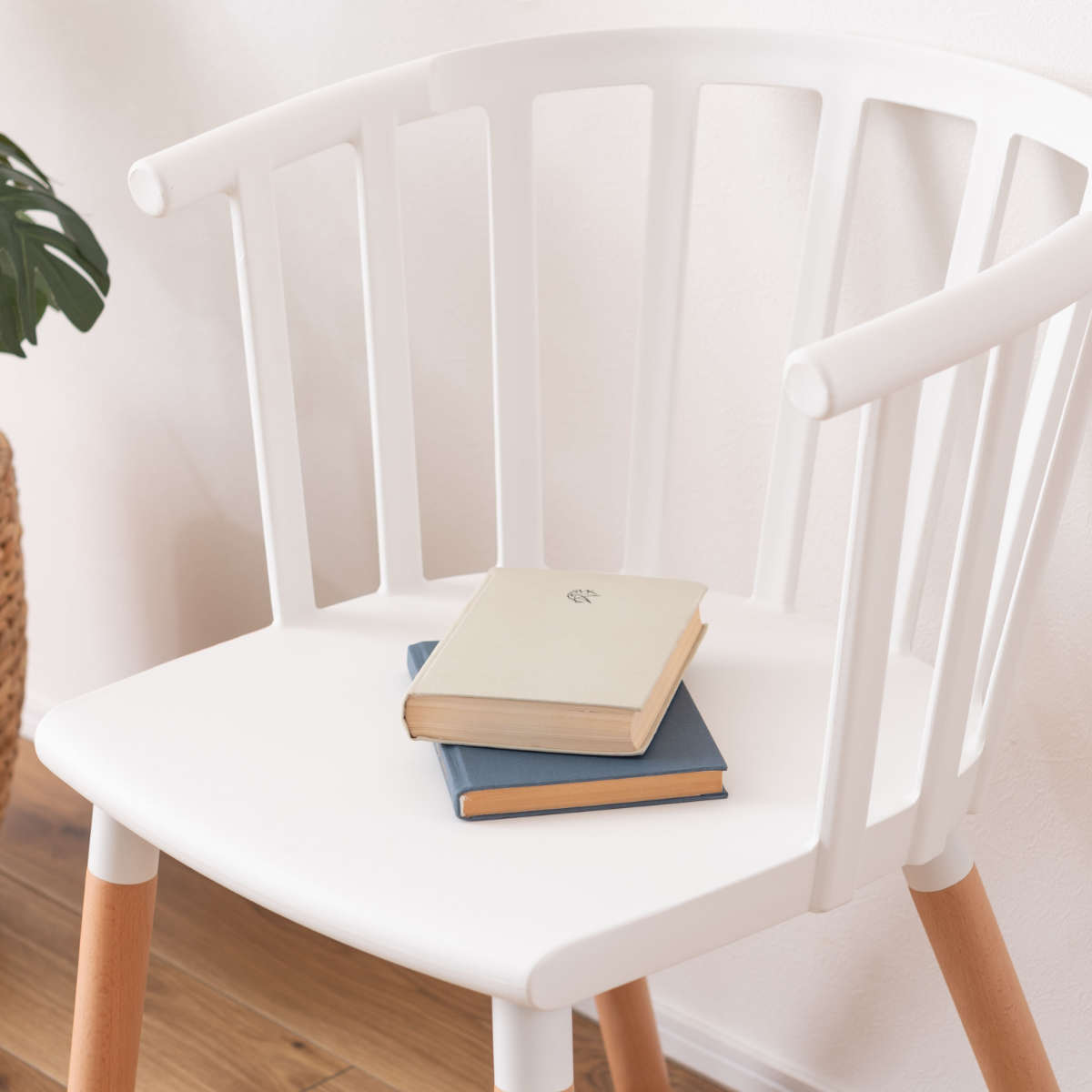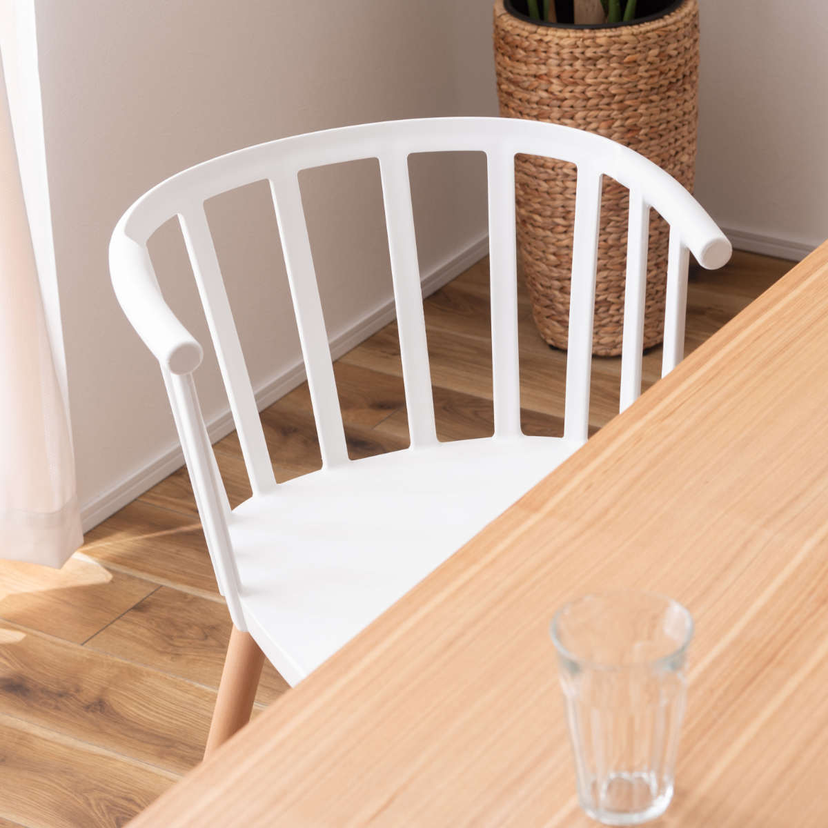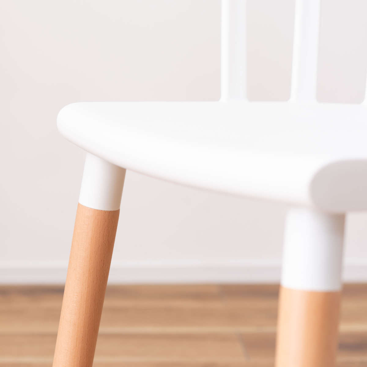 明るいホワイトの座面と、あたたかみのある天然木脚を組み合わせた北欧風デザイン。空間をぱっと明るく見せ、どんなインテリアにも自然と調和します。