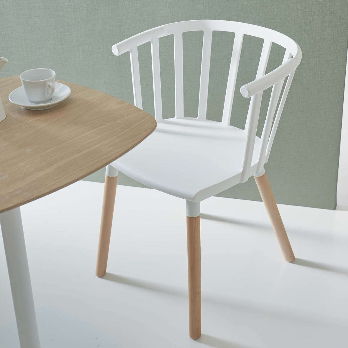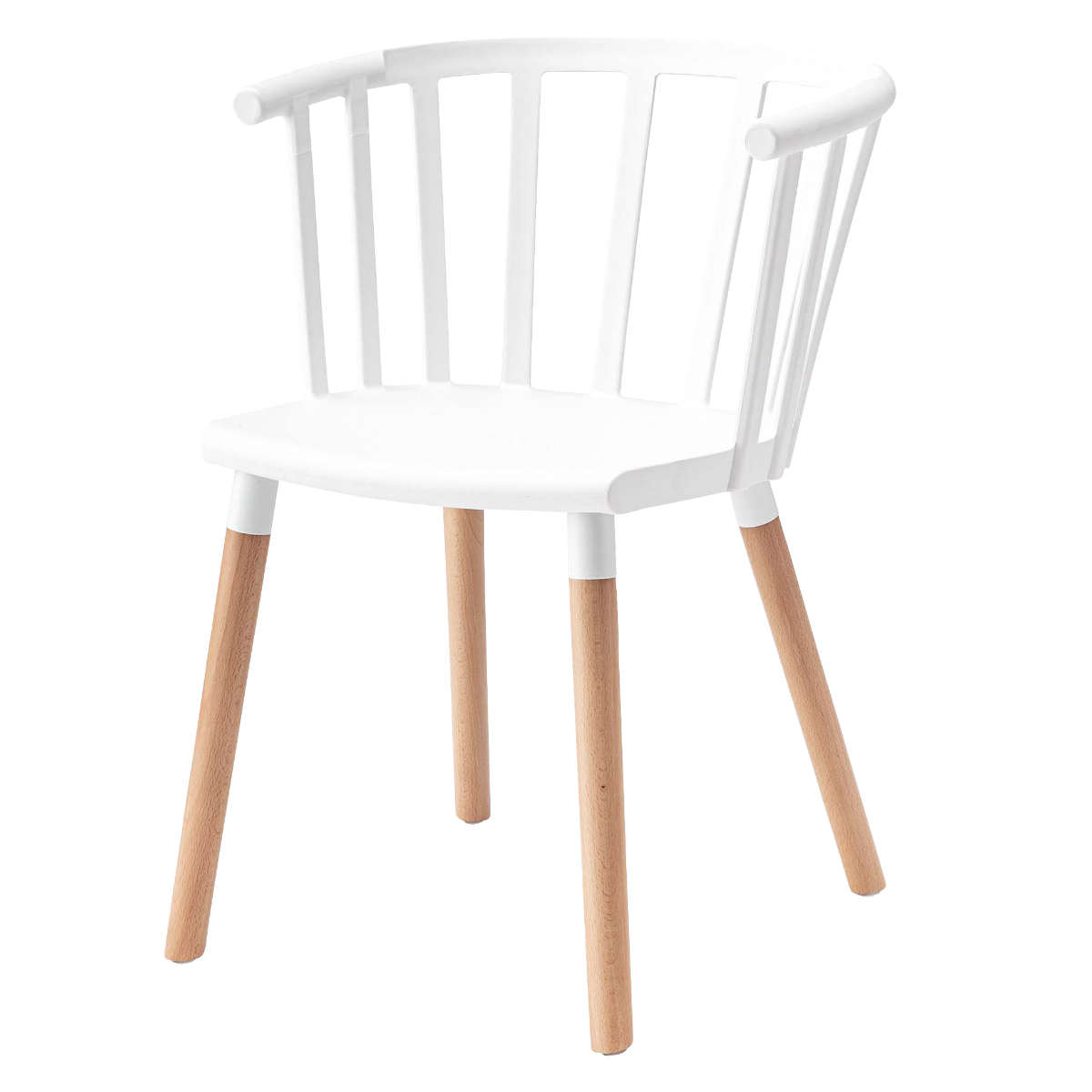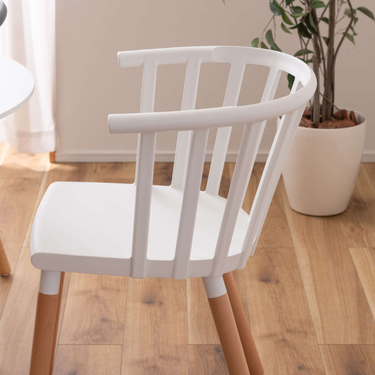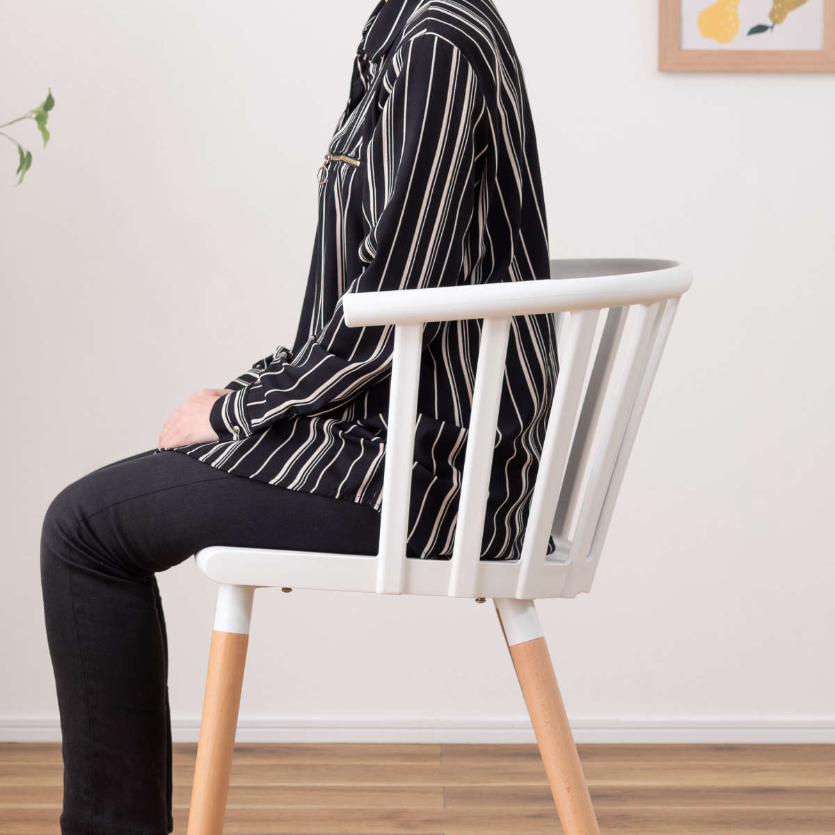 明るいホワイトの座面と、あたたかみのある天然木脚を組み合わせた北欧風デザイン。空間をぱっと明るく見せ、どんなインテリアにも自然と調和します。