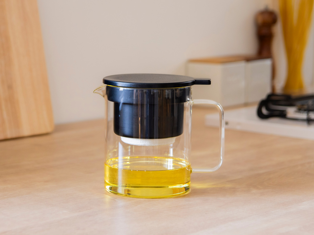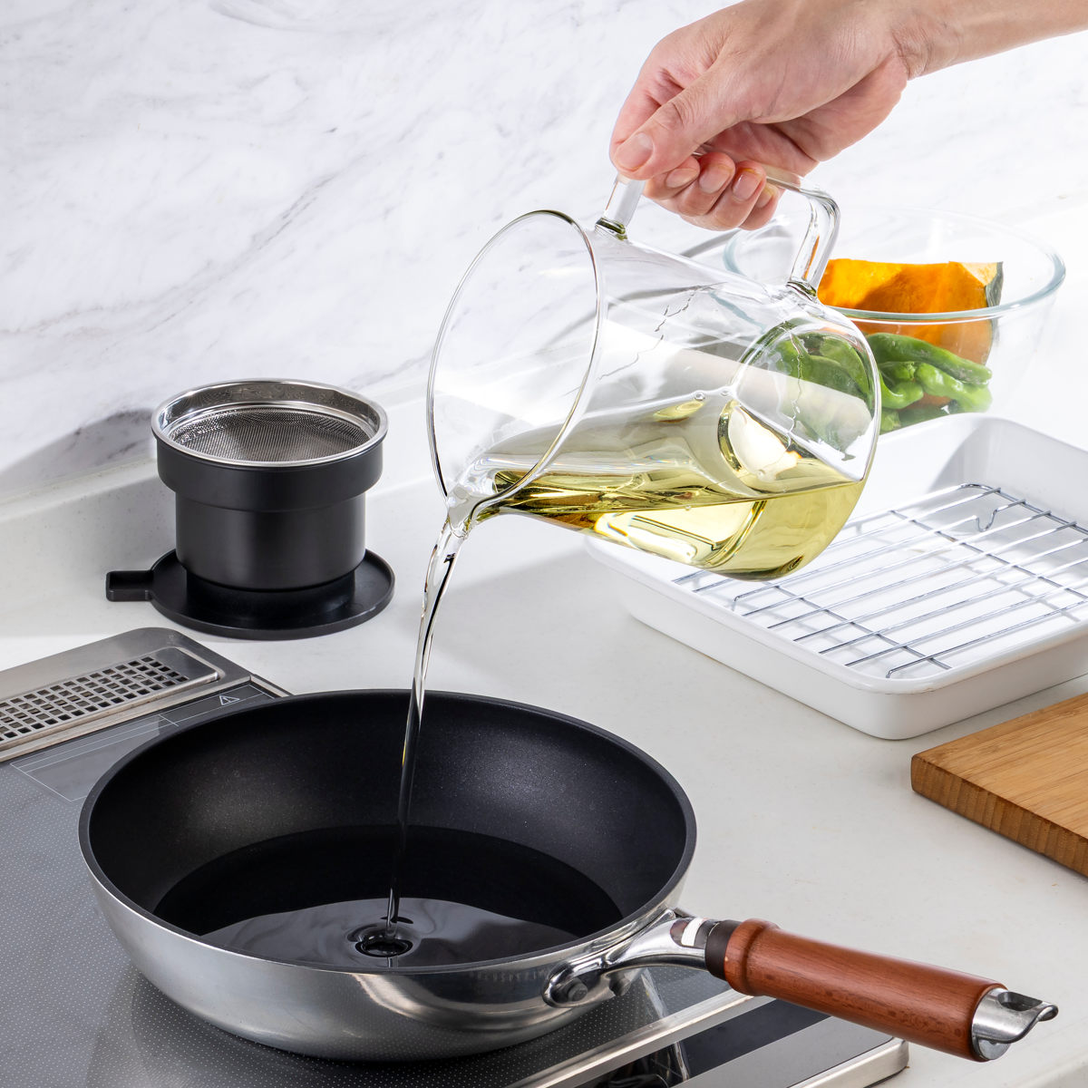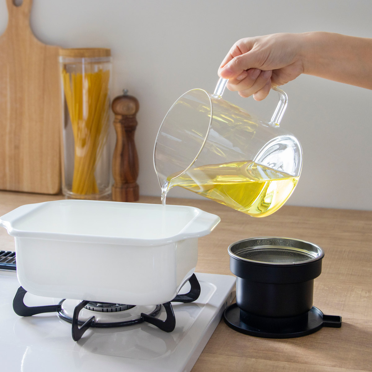どんなキッチンにもなじむ、耐熱ガラス製のオイルポットです。中身が見えるので、油の残量や鮮度をひと目で確認できます。交換のタイミングが分かりやすく、揚げ物料理をよく作るご家庭にもぴったりです。