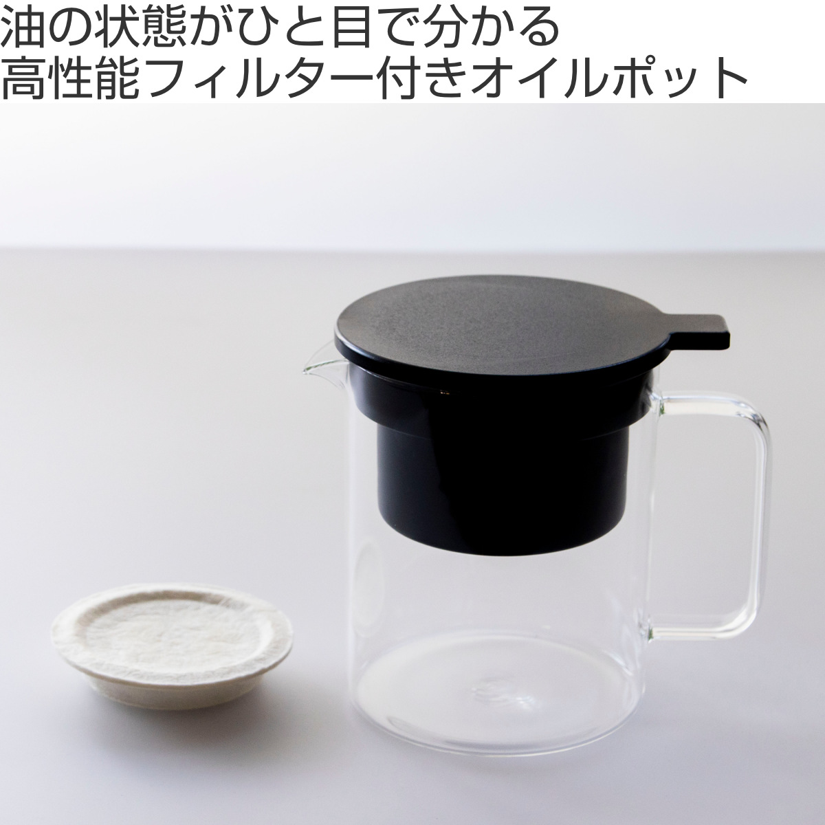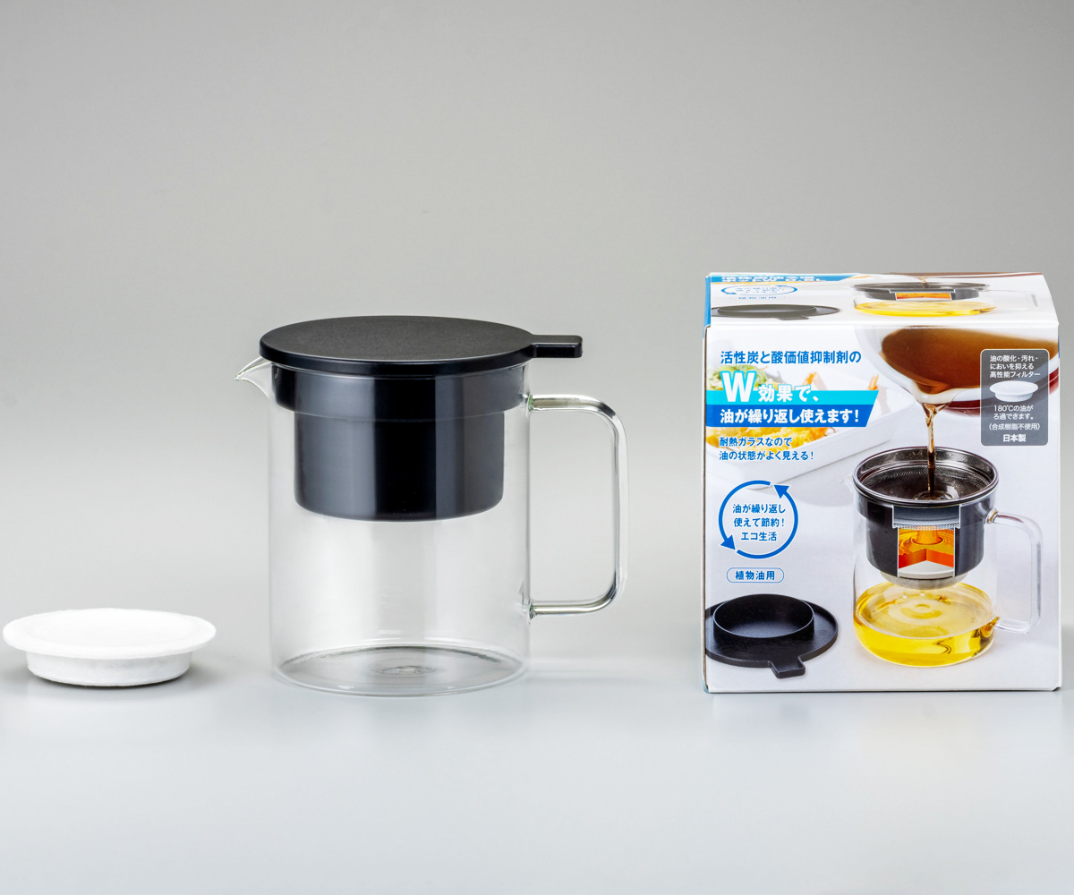 | 材質 | 保存ポット:耐熱ガラス フタ:66ナイロングラスファイバー ろ過ポット:鉄(表面加工:ふっ素樹脂塗膜加工) こしアミ:ステンレス 活性炭油ろ過フィルターW:パルプ、レーヨン、活性炭、ケイ酸マグネシウム |