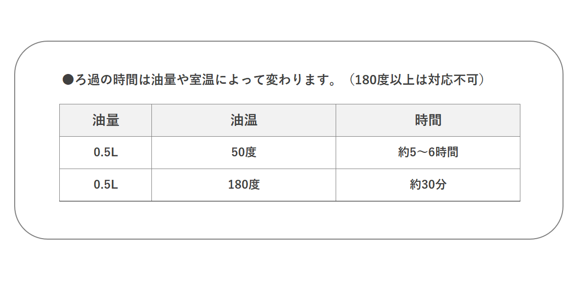 | 注意事項 | ※ろ過の際は油の温度を必ず180度以下に冷ましてからお使いください |