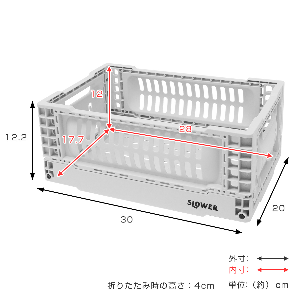 | サイズ | 外寸:約 幅30×奥行20×高さ12.2(cm) 内寸:約 幅28×奥行17.7×高さ12(cm) 折り畳み時の高さ:約 4cm |