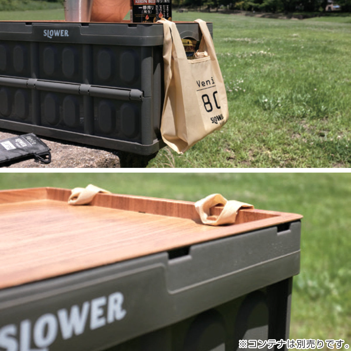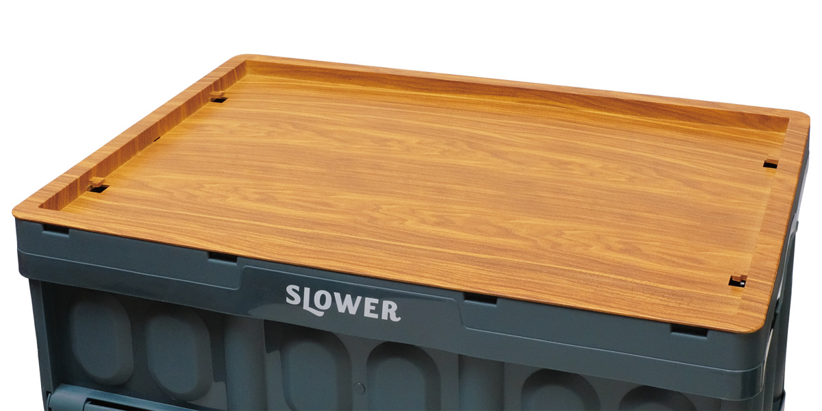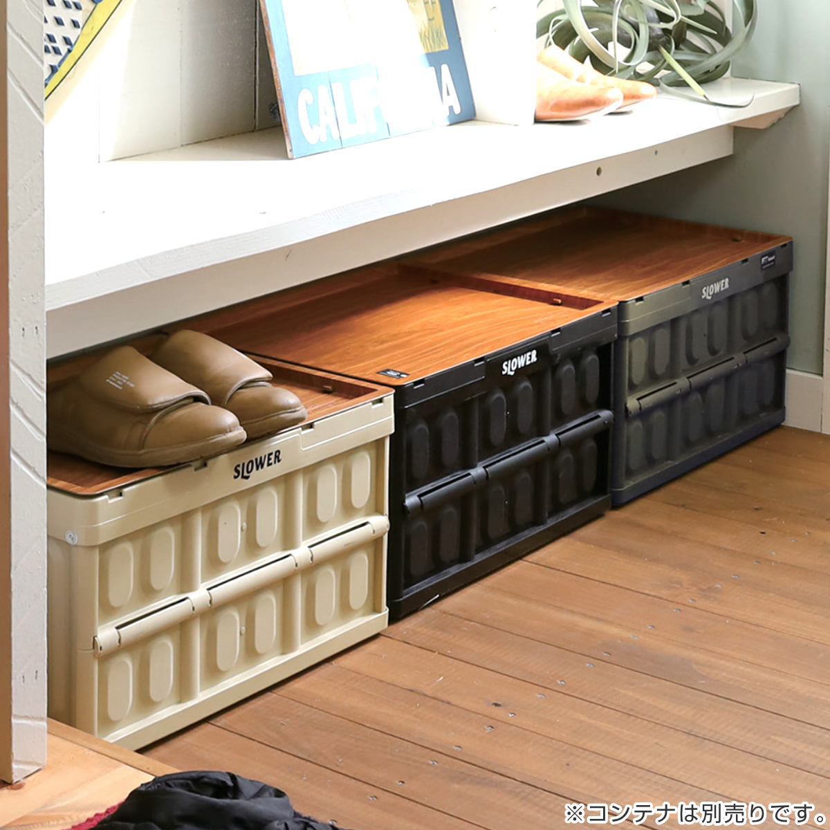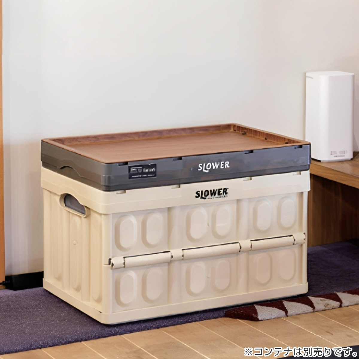 「SLOWER 折りたたみコンテナ 45L エストリル」に合わせて設計されており、上から置くだけでフィットします。収納ボックス上が、有効なテーブルスペースとして生まれ変わります。