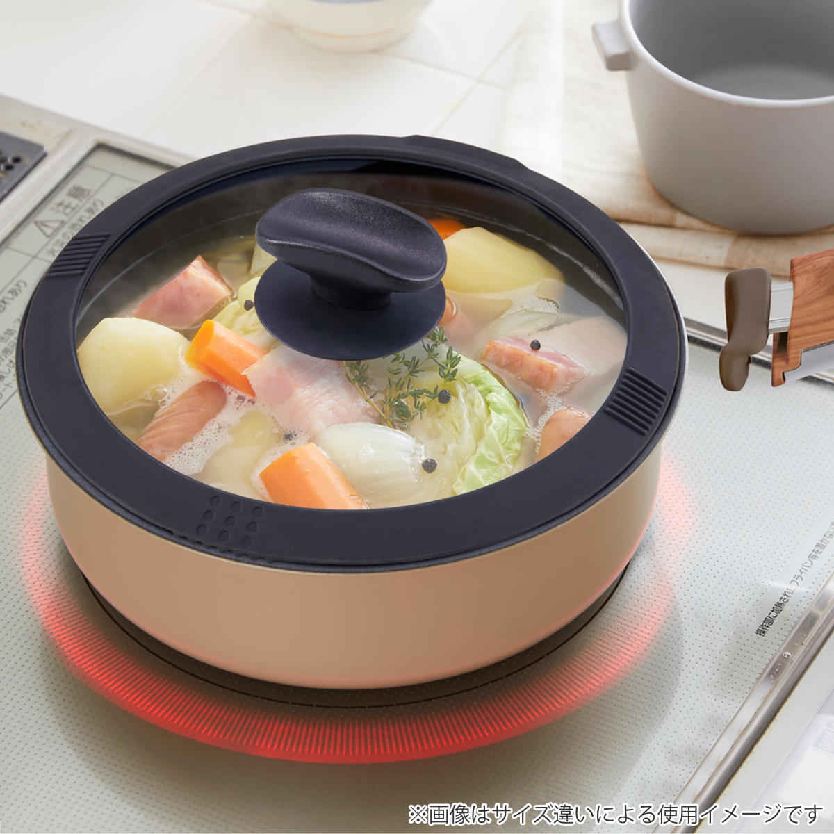 「とれパン」シリーズの片手鍋16cmに使用できるガラス蓋です。調理中も中の様子を確認でき、火加減の調整がしやすいです。湯切り口付きで、ツマミ上部の凹みに菜箸を置けるなど使い勝手にも配慮されています。