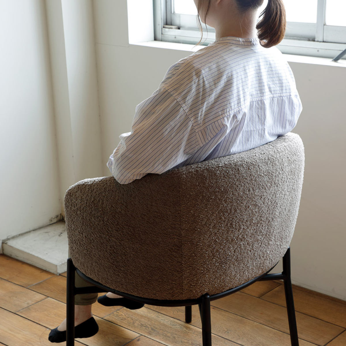 チェアの座面は、幅と奥行が広めのゆったりとしたサイズ感です。囲われた低めの背はひじ掛けとしても使え、自然と体をあずけてくつろげる座り心地です。
