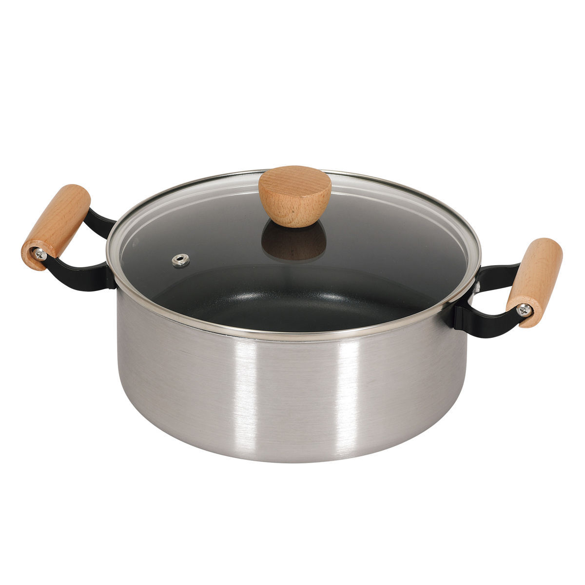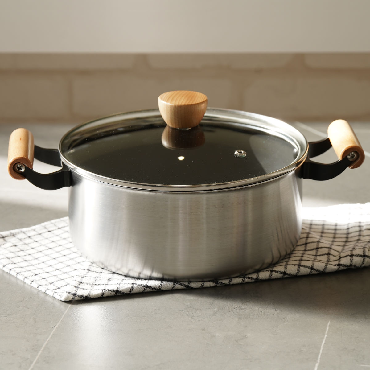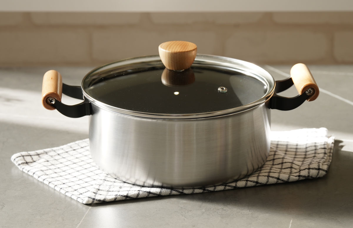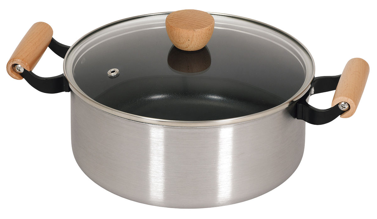 | 材質 | 【本体】ステンレス鋼(クロム16%)、アルミニウム合金 表面加工(内面):フッ素樹脂塗膜加工 取っ手:天然木 【蓋】強化ガラス(全面物理強化) 縁リング:ステンレス鋼 つまみ:天然木 |