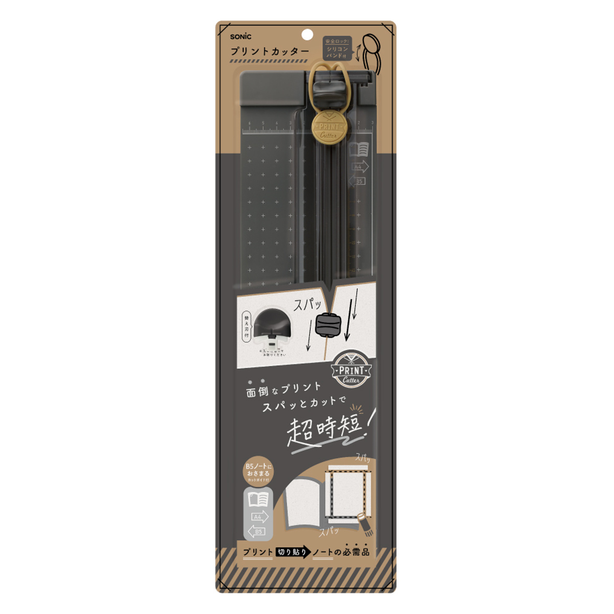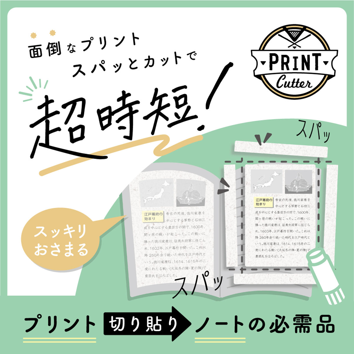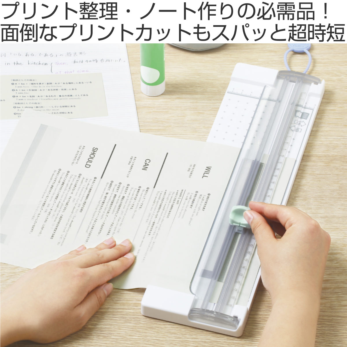 学校や塾で配布されるプリントの整理やノートづくりは、意外と手間がかかるもの。そんな面倒なプリント整理を、ガイドに沿ってセットするだけで、四辺をきれいにカットでき、一般的なB5サイズのノートへの貼り付けが時短できます。