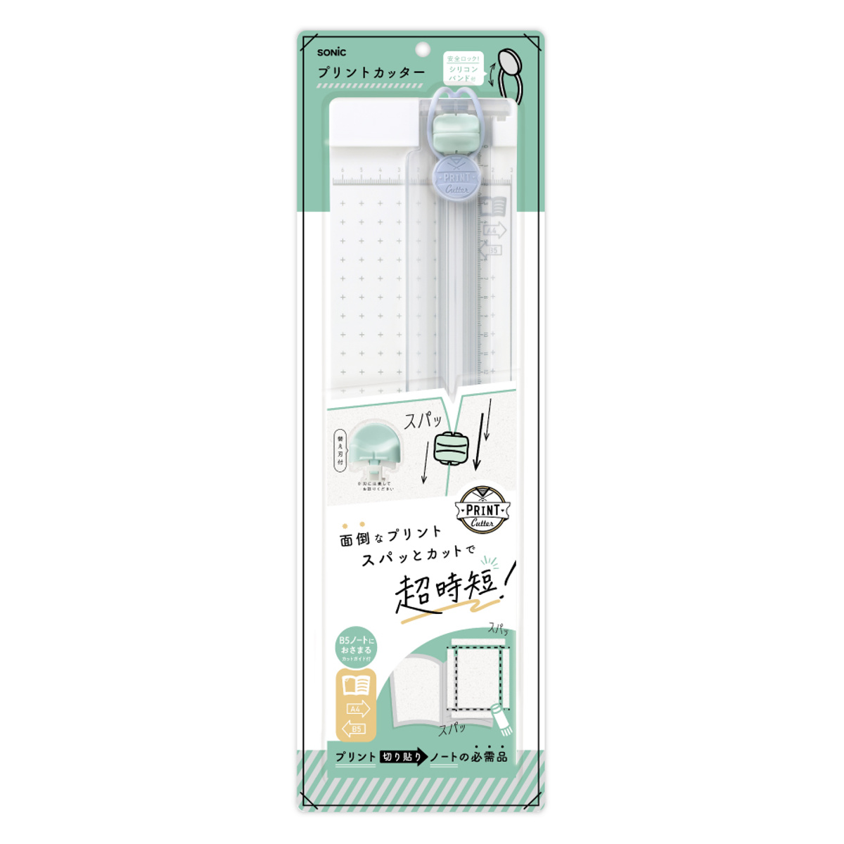 学校や塾で配布されるプリントの整理やノートづくりは、意外と手間がかかるもの。そんな面倒なプリント整理を、ガイドに沿ってセットするだけで、四辺をきれいにカットでき、一般的なB5サイズのノートへの貼り付けが時短できます。