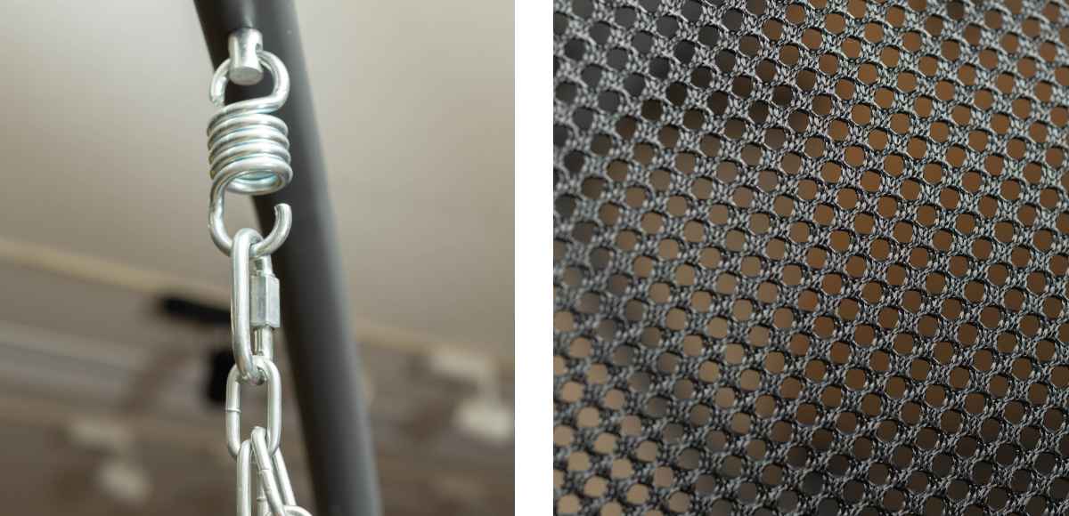 重厚で安定感のあるスチール製のフレームが、チェア本体をしっかりと支えます。チェアのメッシュ部分やクッションはポリエステル製で通気性が良く、摩耗しにくい丈夫な素材です。