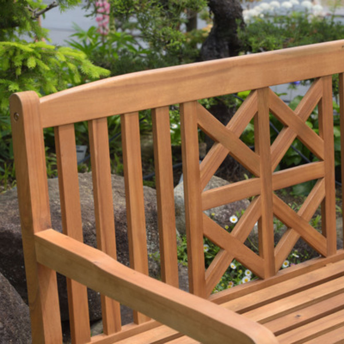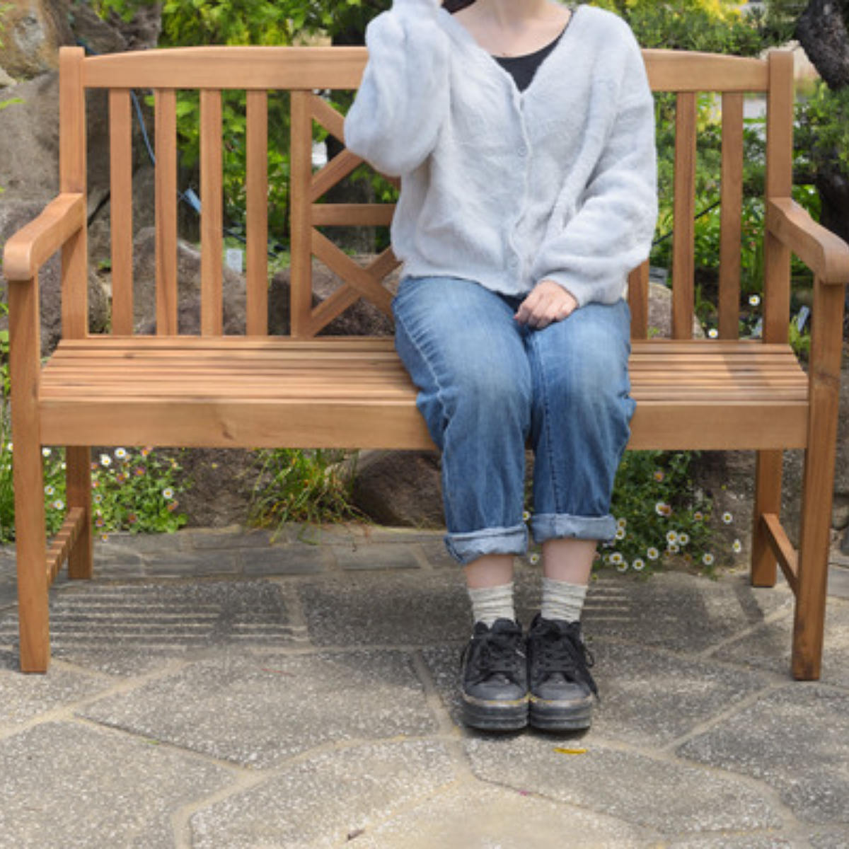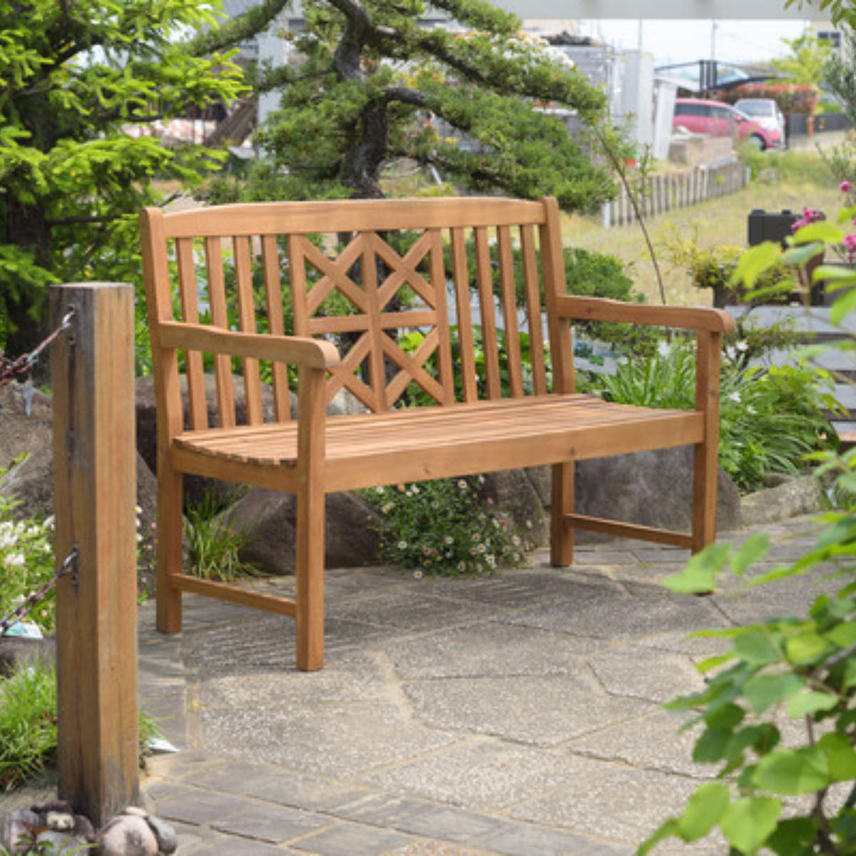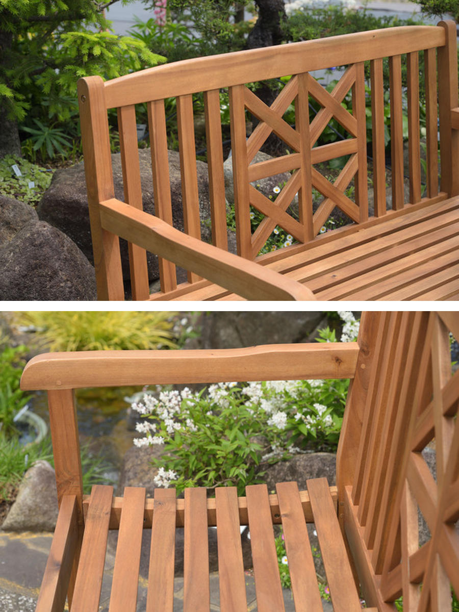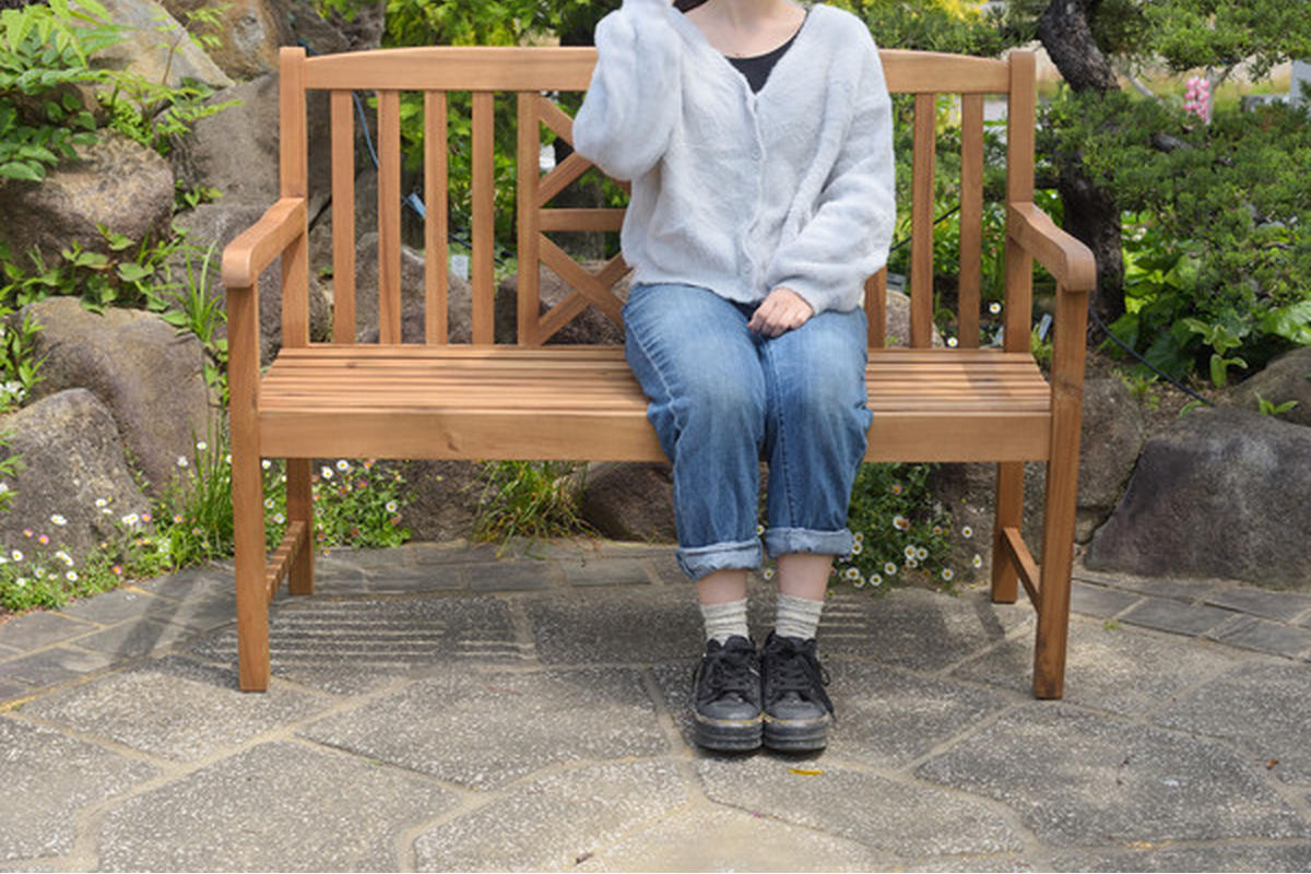 ナチュラルな風合いとシンプルデザインで、お庭やバルコニーの空間に馴染む2人掛けベンチです。天然木ならではの木の温もりと使い込むほどに増す味わいが、リラックスタイムをより心地よく演出します。