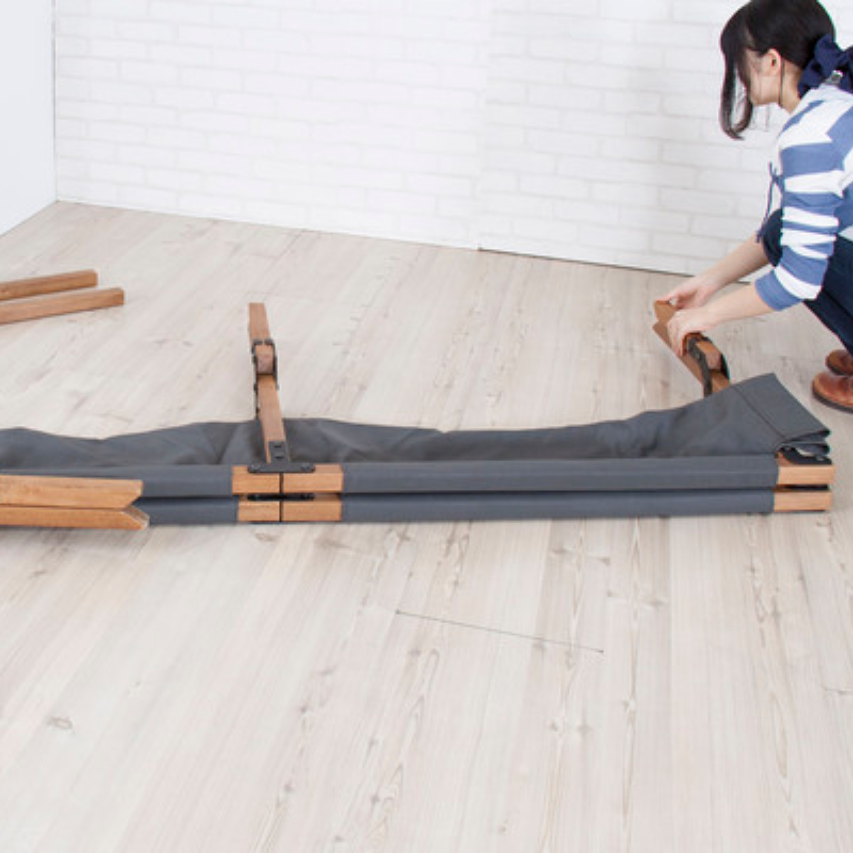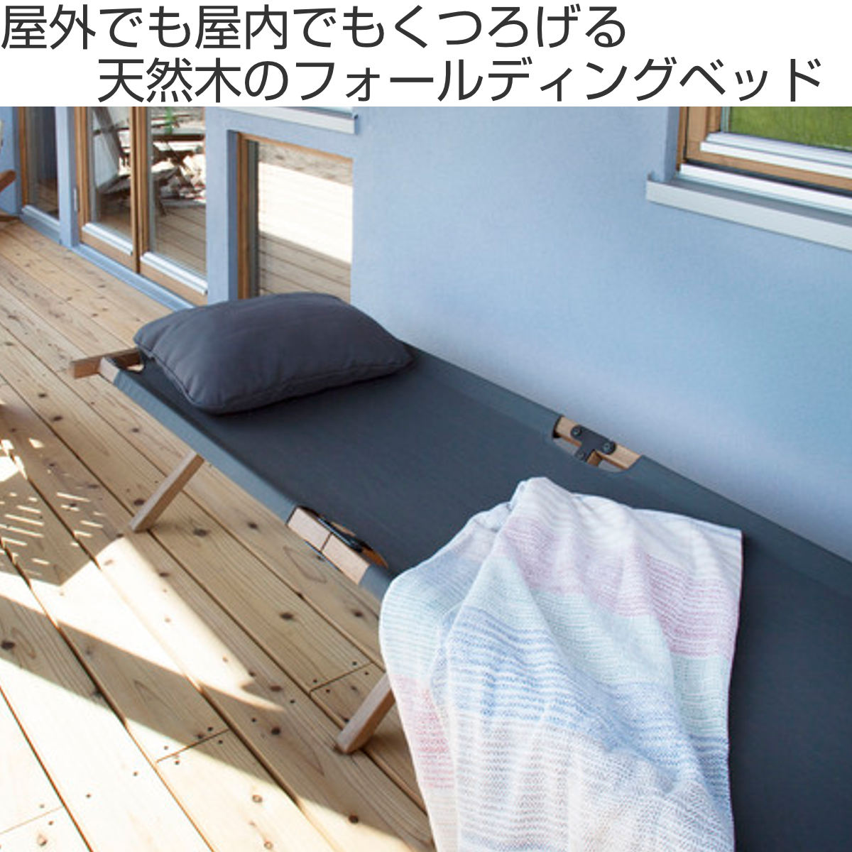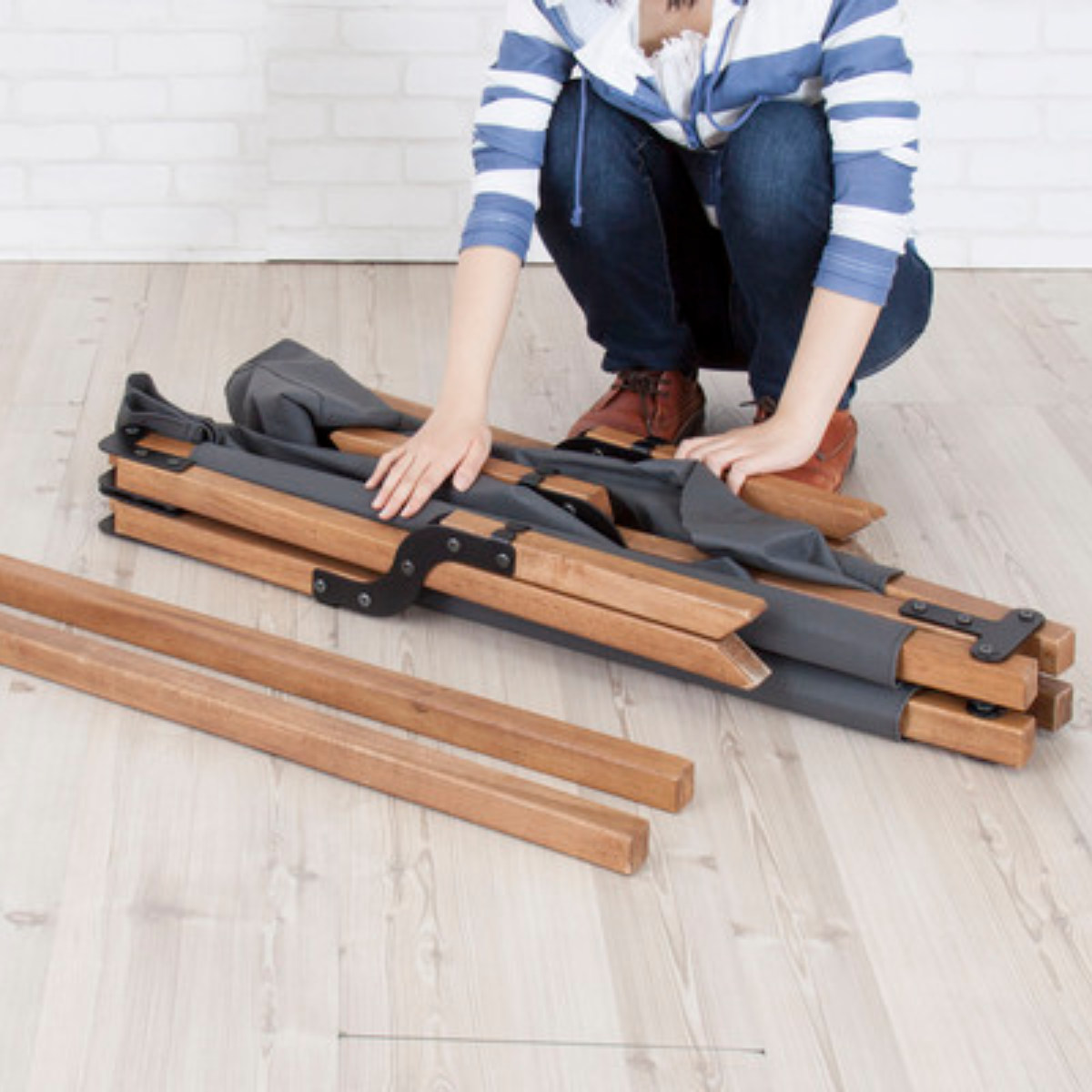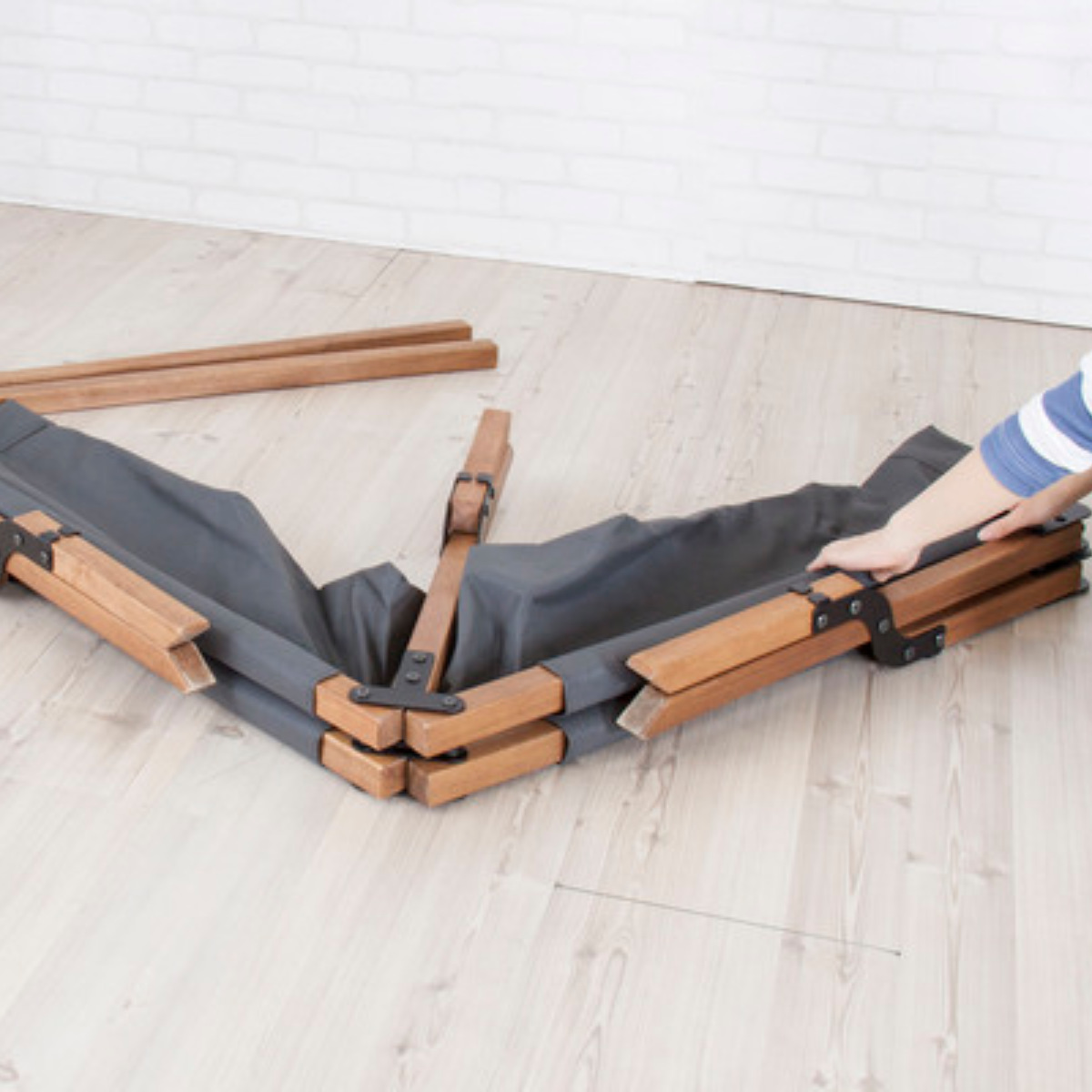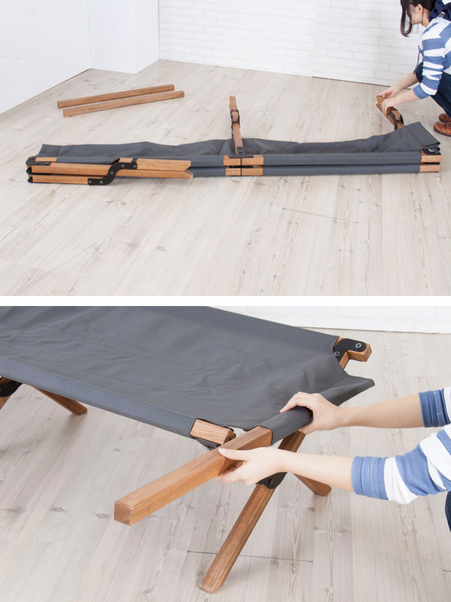 ベランダやバルコニー、ウッドデッキ、キャンプなど屋内外問わず使える、折りたたみ式フォールディングベッドです。天然木の温もりを感じられるナチュラルデザインで、インテリアにも自然にも馴染みます。
