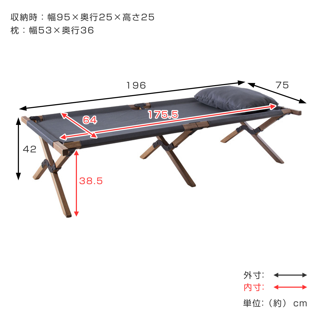 | サイズ | 約 幅196×奥行75×高さ42(cm) 収納時:約 幅95×奥行25×高さ25(cm) 枕:約 幅53×奥行36(cm) |