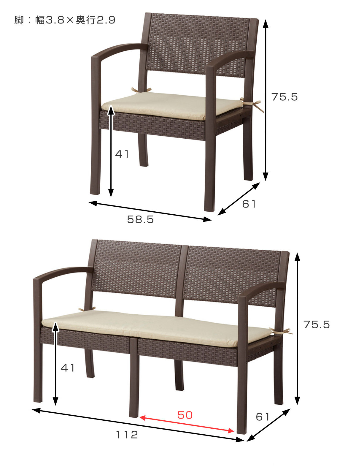 | サイズ | 1Pソファ:約 幅58.5×奥行61×高さ75.5×座面高41(cm) 2Pソファ:約 幅112×奥行61×高さ75.5×座面高41(cm) テーブル:約 幅58×奥行51×高さ42(cm) |