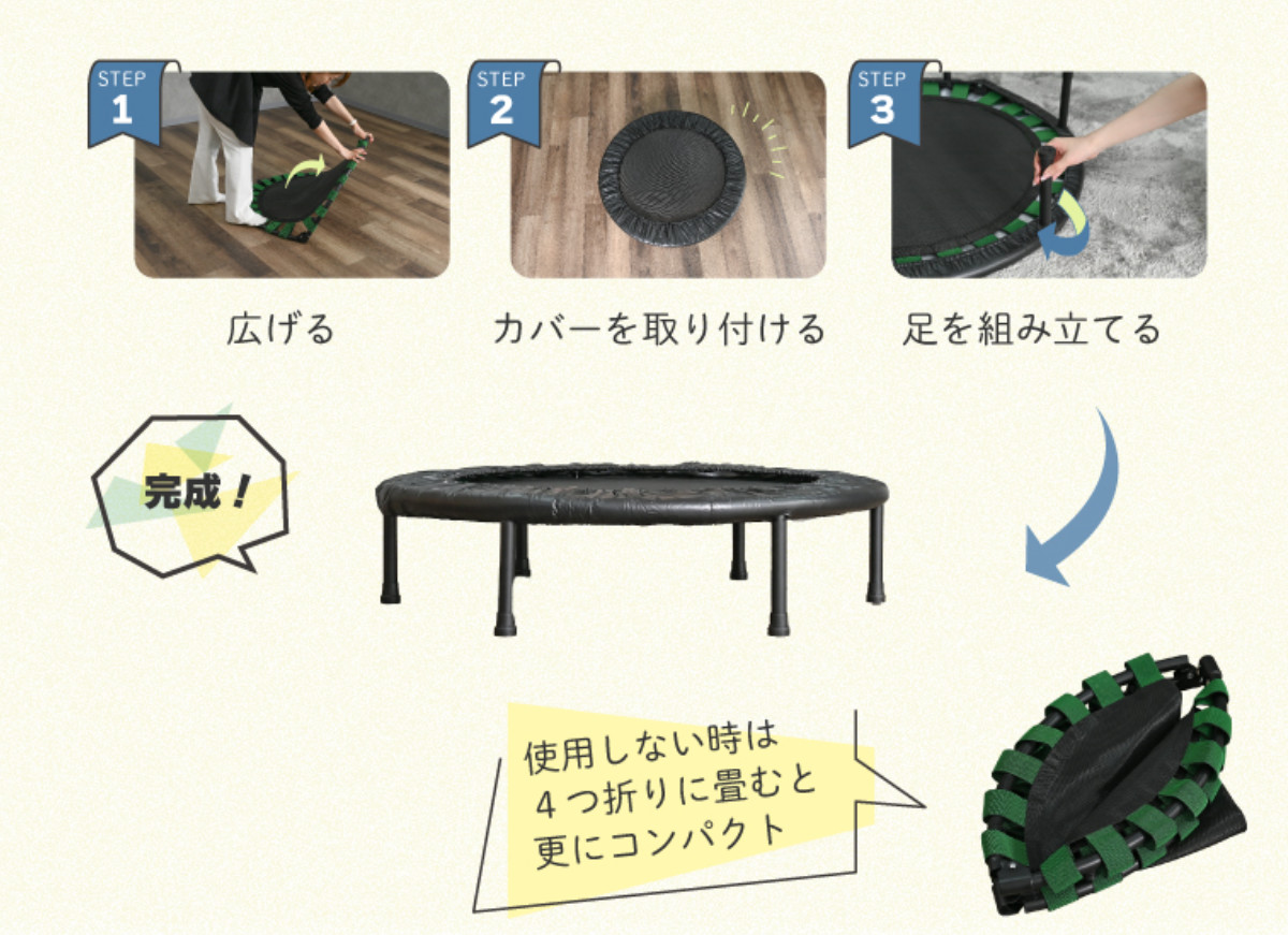 3ステップで簡単に組立。使わない時は4つに折り畳んでお部屋の隅やクローゼットに収納できます。