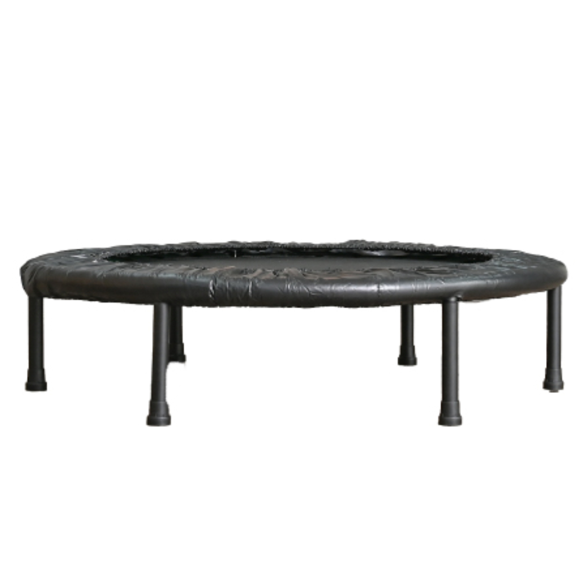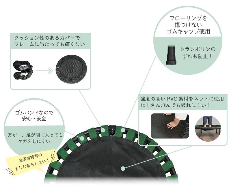 クッションカバー付でフレームに当たっても痛くなりにくく、ゴムバンド仕様で足が間に入ってもケガをしにくい設計です。金属音特有のきしむ音も抑えられており、床を傷つけにくいゴムキャップ付きでズレも防止します。丈夫なPVCネットを使用し、たくさん跳んでも破れにくいトランポリンです。