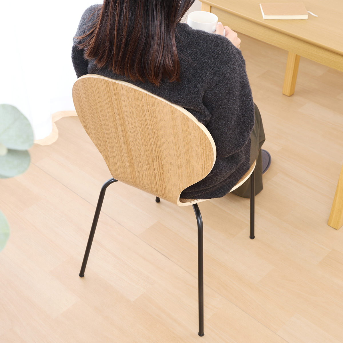 背中を優しく包み込むカーブ形状により、無理のない姿勢を保ちやすく、食事や作業の時間も心地よく座れます。