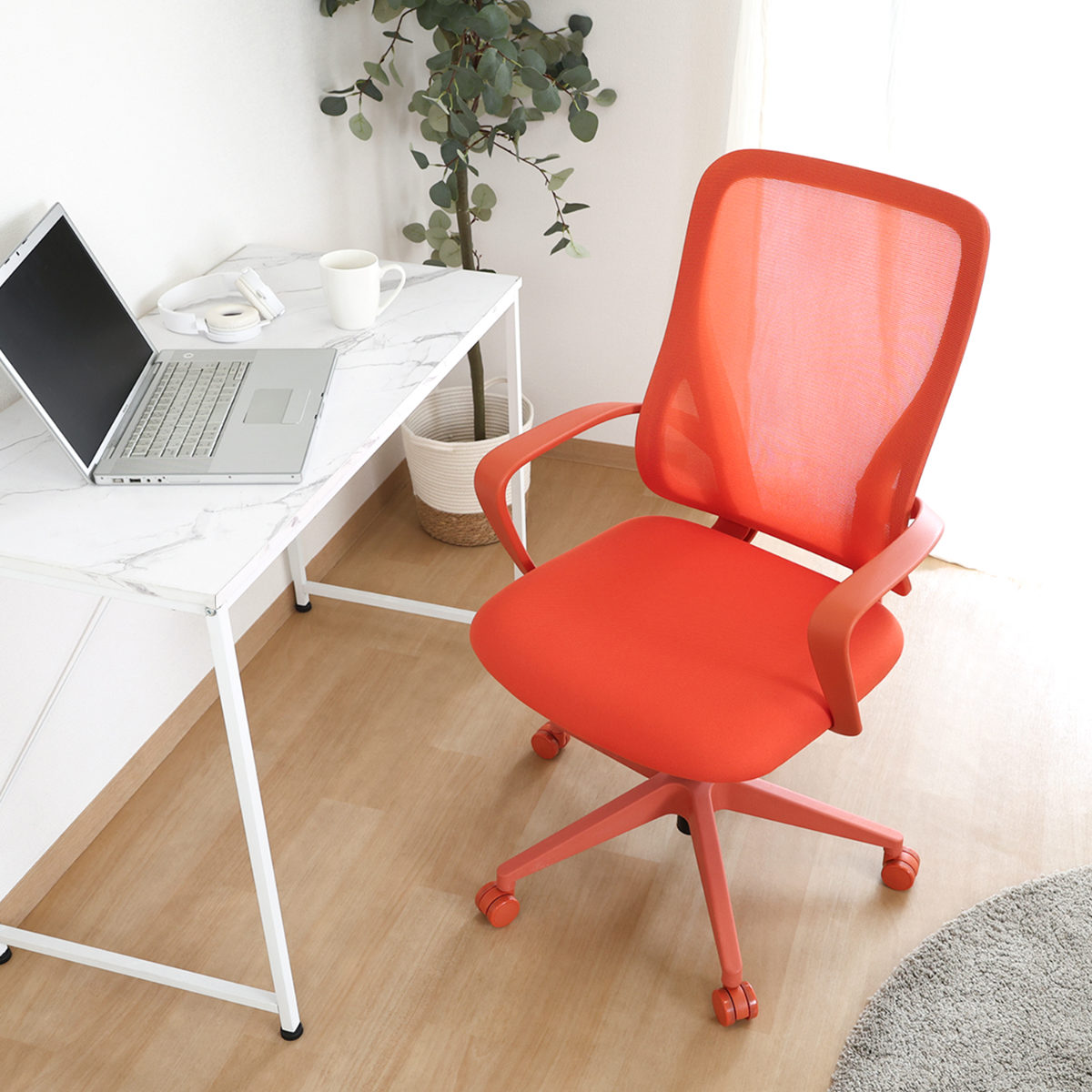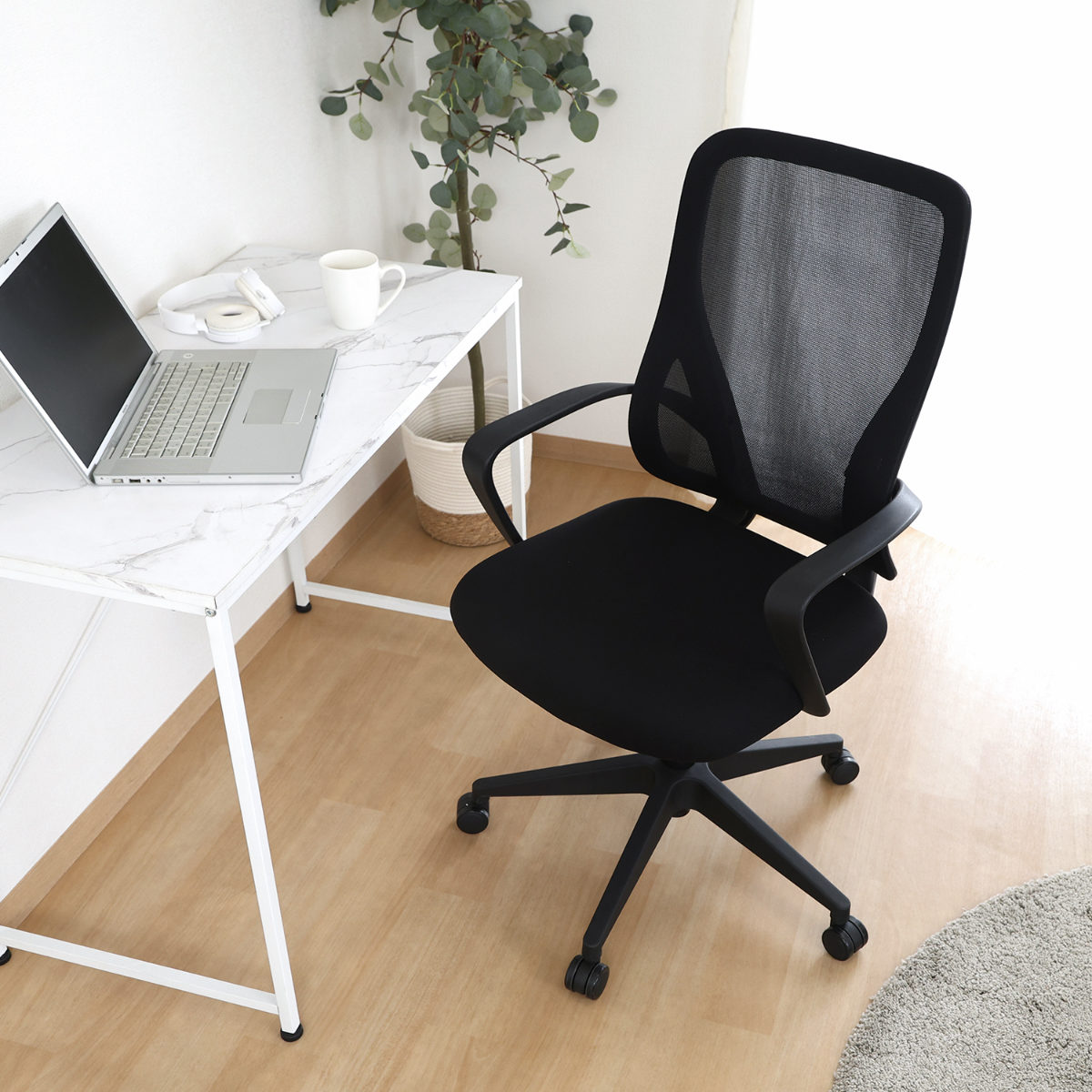通気性の良いメッシュ素材と体にフィットする形状で、長時間でも快適に座れるオフィスチェア。肘付き・キャスター付きで、作業や移動もスムーズに行えます。