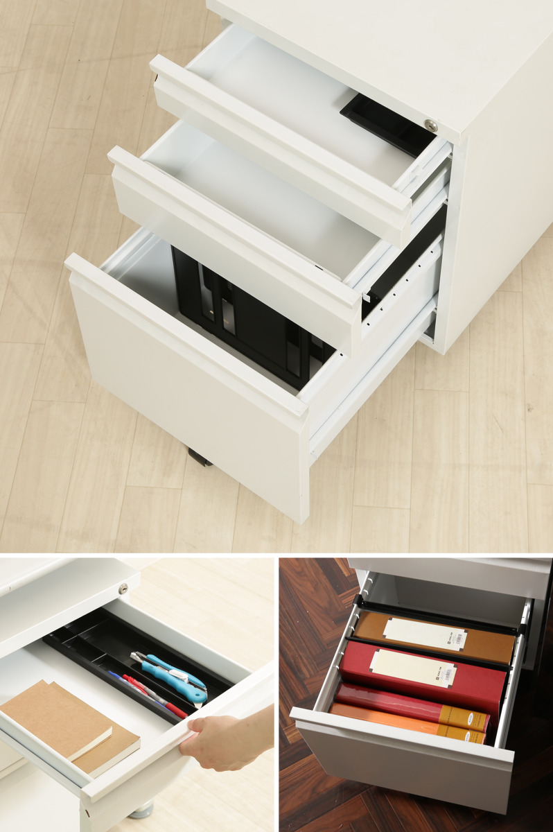 用途によって使い分けできる3段式です。仕切り板やペントレーが付属しているので、文具や書類などを細かく分けて整理できます。一番下の段はA4サイズのファイルが入るサイズです。
