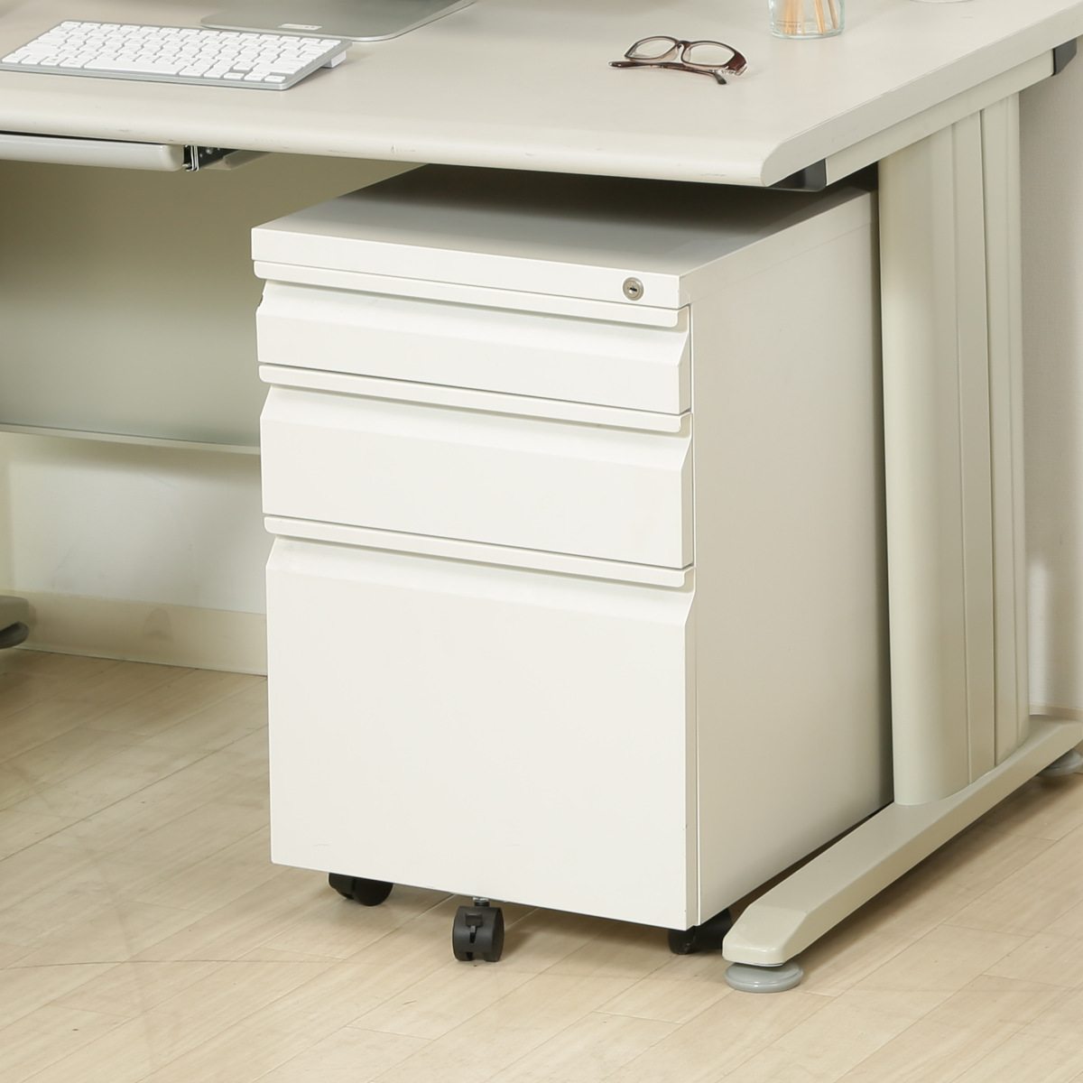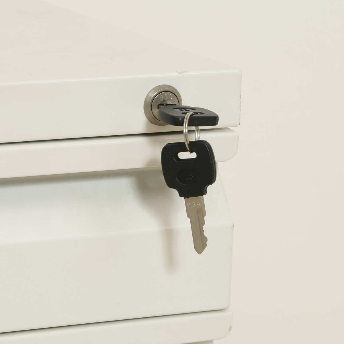 一か所施錠するだけですべての引き出しがロックできるオールロック機能を搭載しています。オフィスでの盗難防止やプライバシー保護に役立ちます。鍵は2個付属しています。