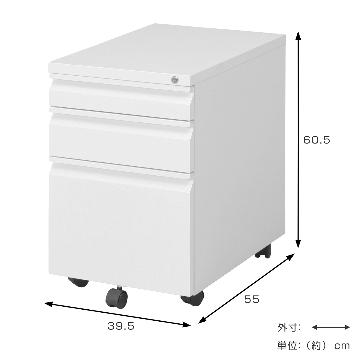 | サイズ | 約 幅39.5×奥行55×高さ60.5(cm) 引出有効内寸(上段):31.5x42x6.5cm 引出有効内寸(中段):31.5x42x10cm 引出有効内寸(下段):31.5x42x28cm |
