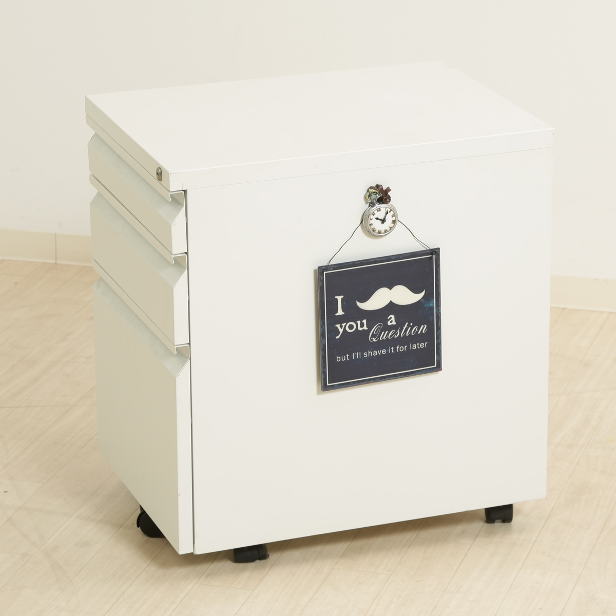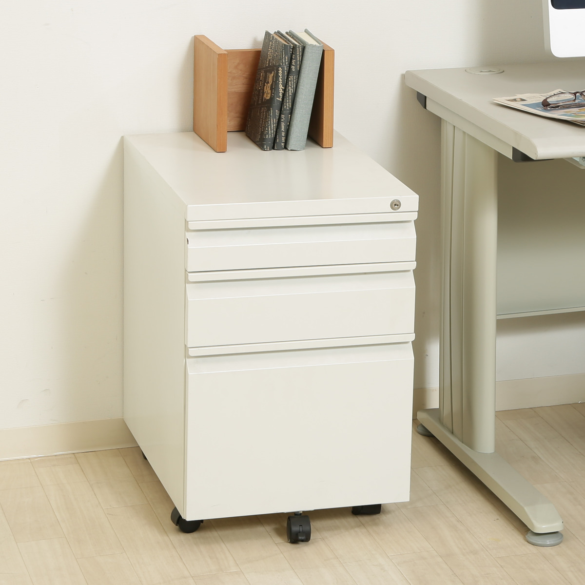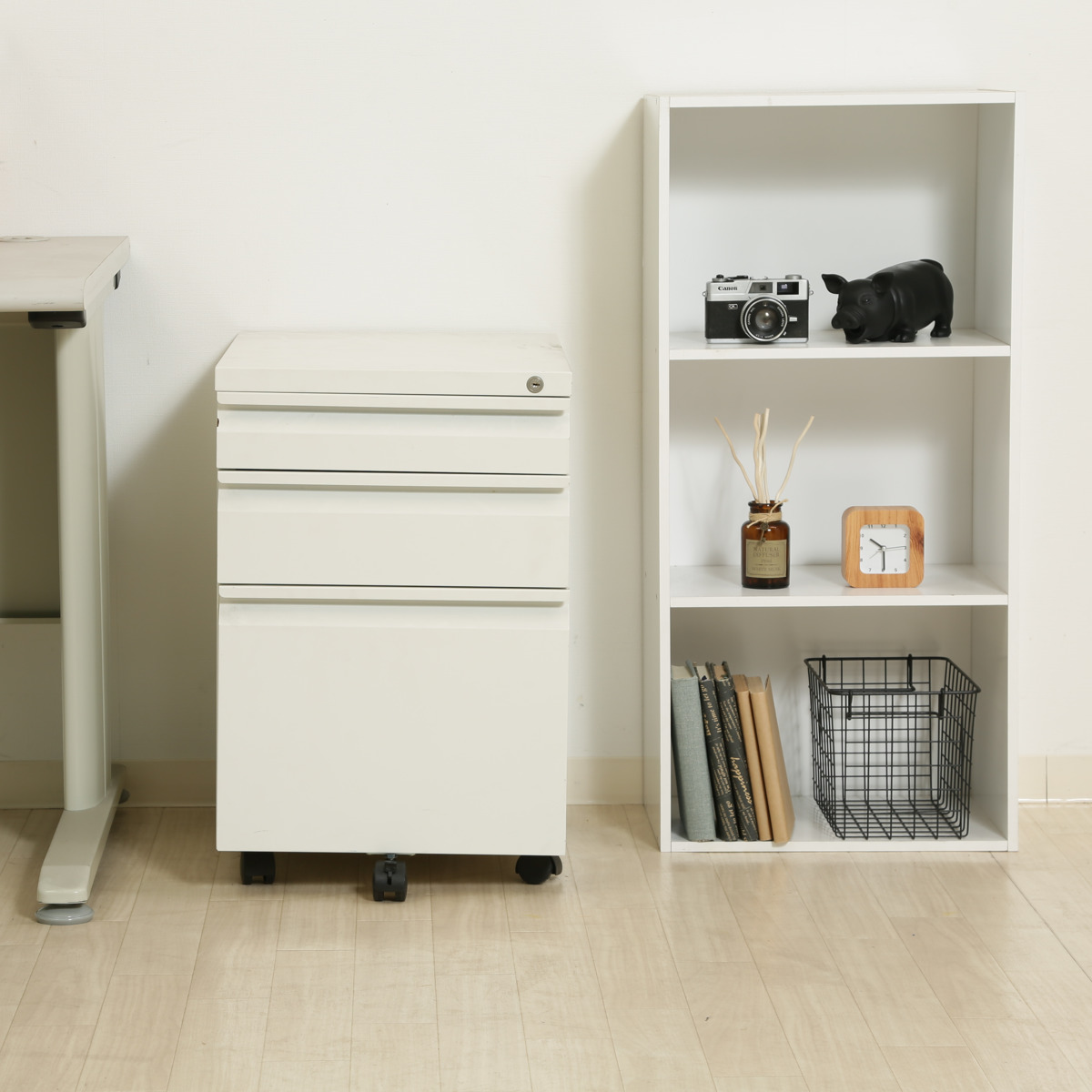 デスクサイドやデスク下で使えるシンプルな3段式ワゴンです。散らかりがちなデスク周りの小物や資料、ファイルなどを整理収納するのにぴったりです。ホワイトカラーがお部屋やオフィスをパッと明るく見せてくれます。