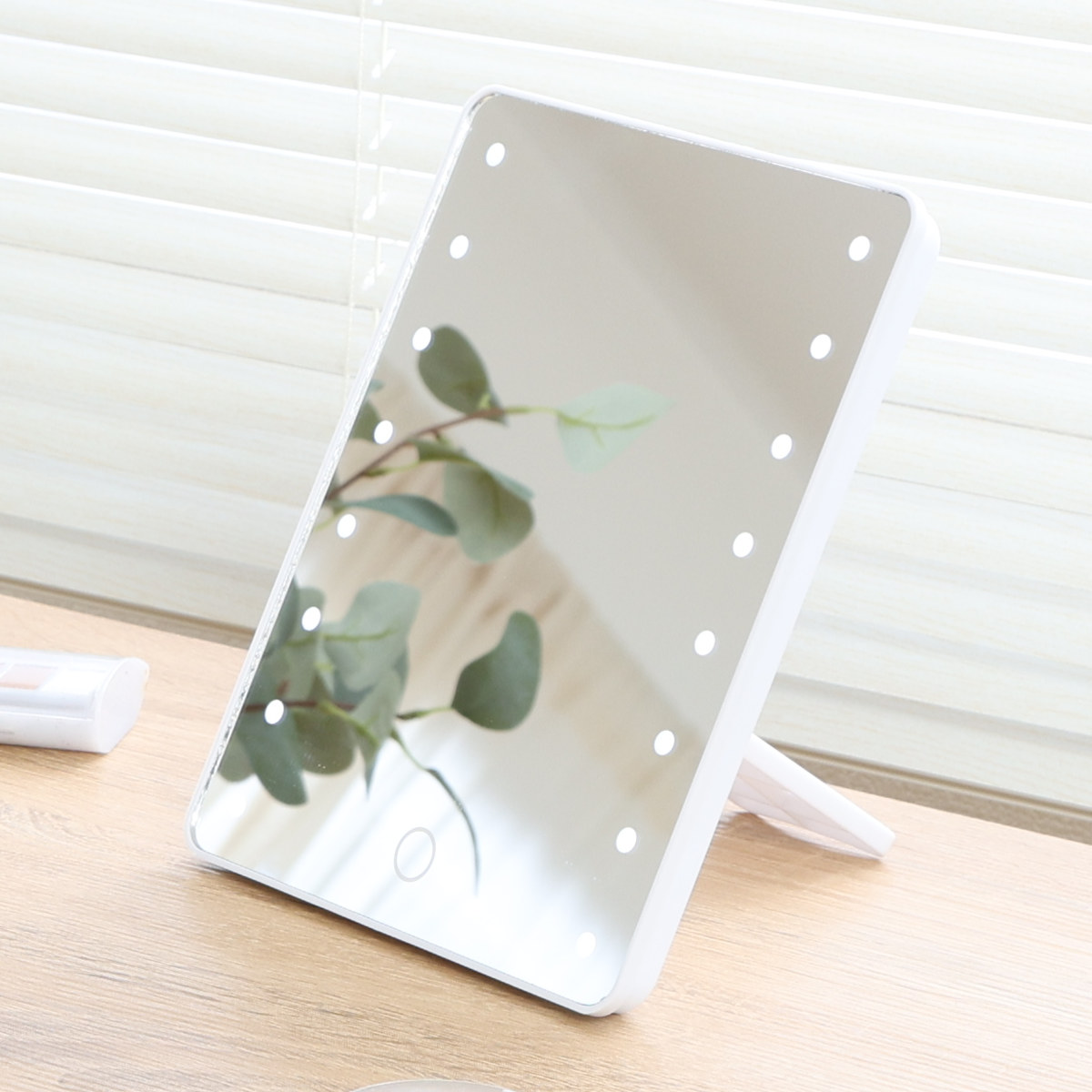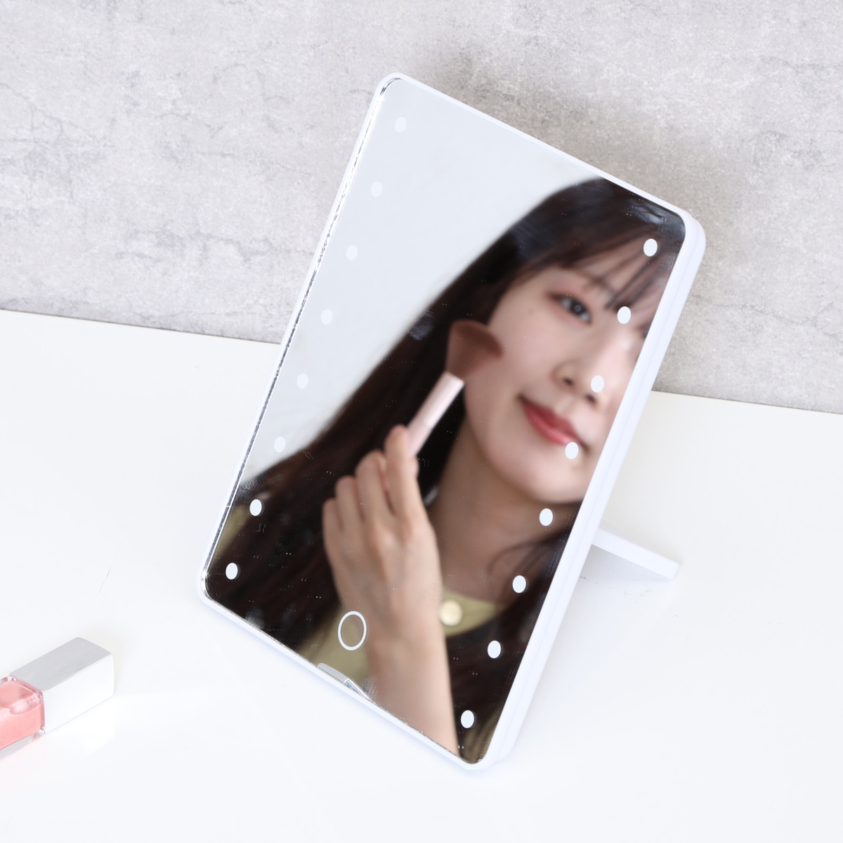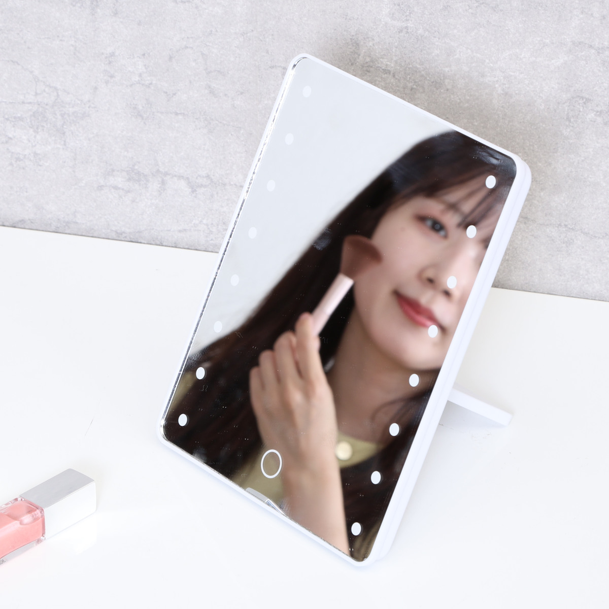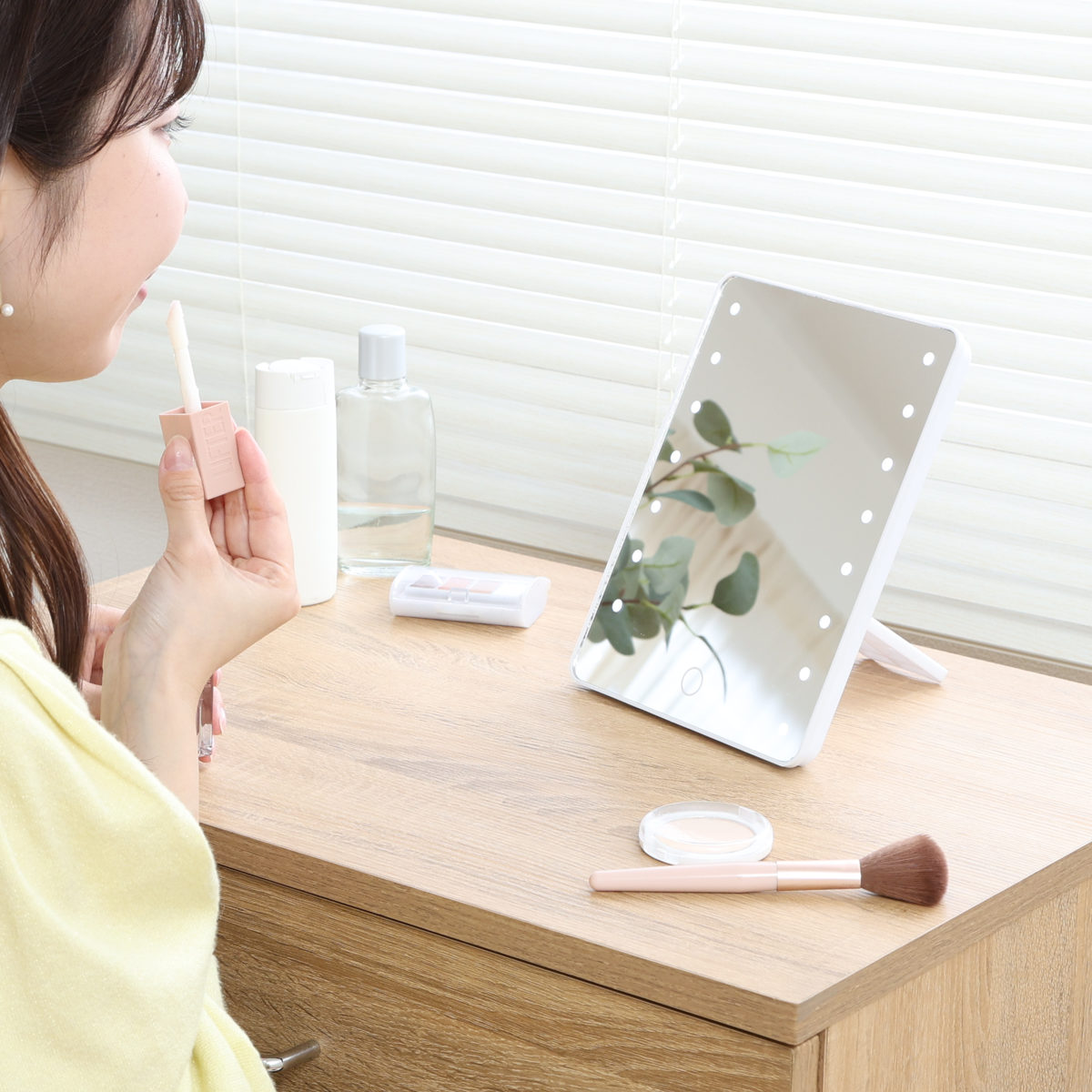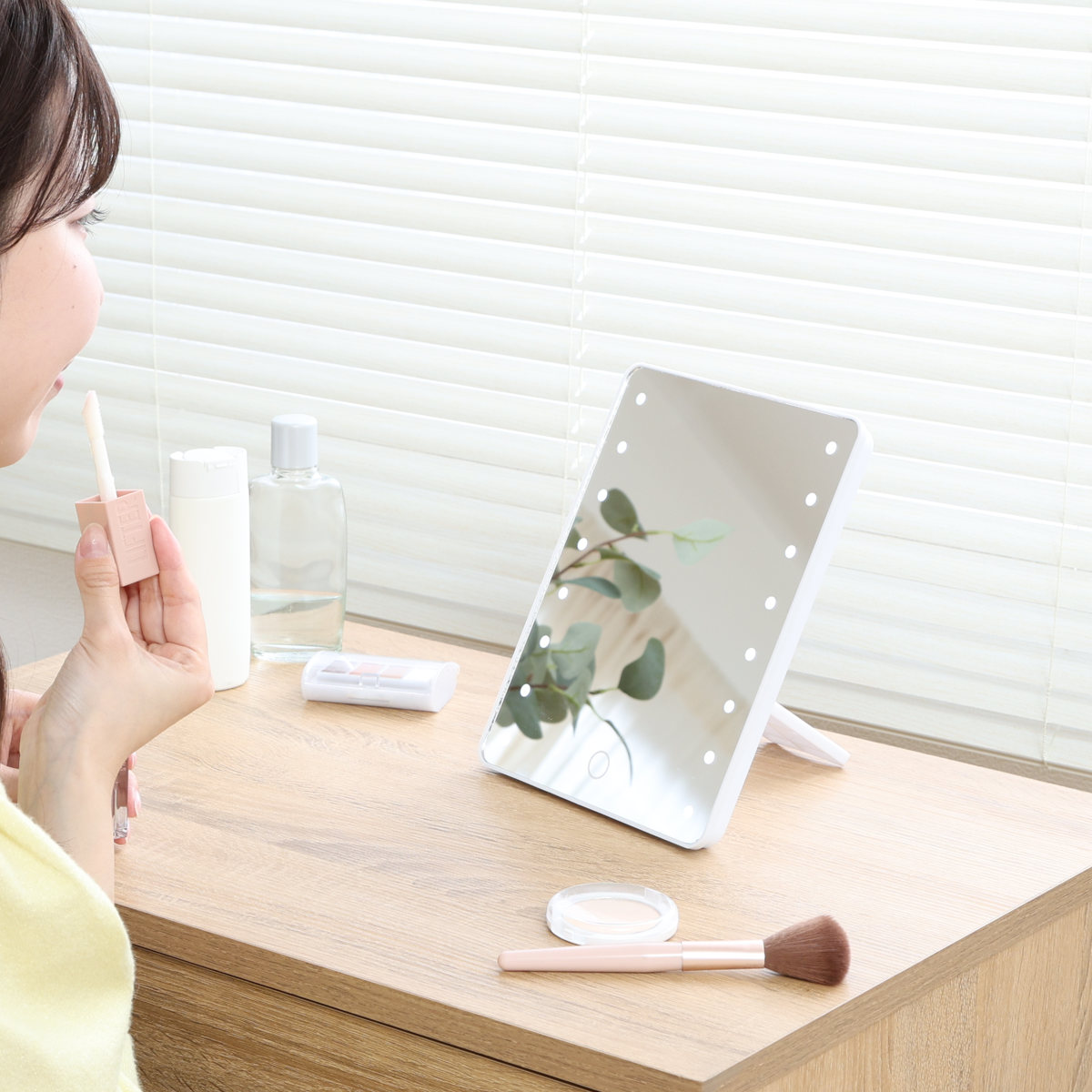 鏡のフチに16個のLEDライトが埋め込まれた卓上ミラーです。自然光が入りにくいお部屋や、時間帯によって明るさが足りない時でも顔全体をムラなく照らし、細かな部分までしっかり確認できます。