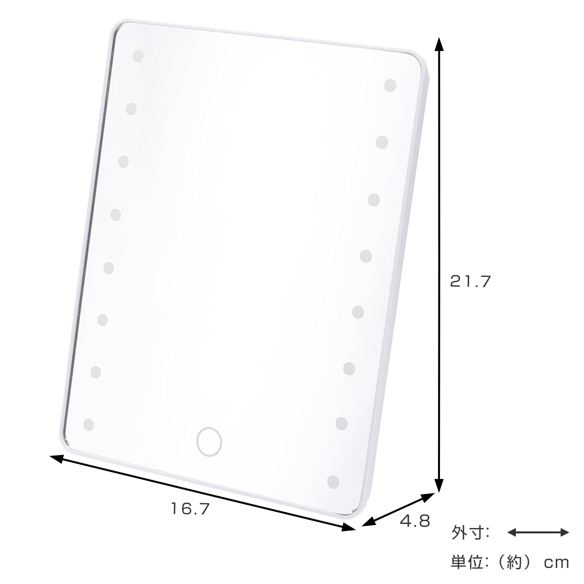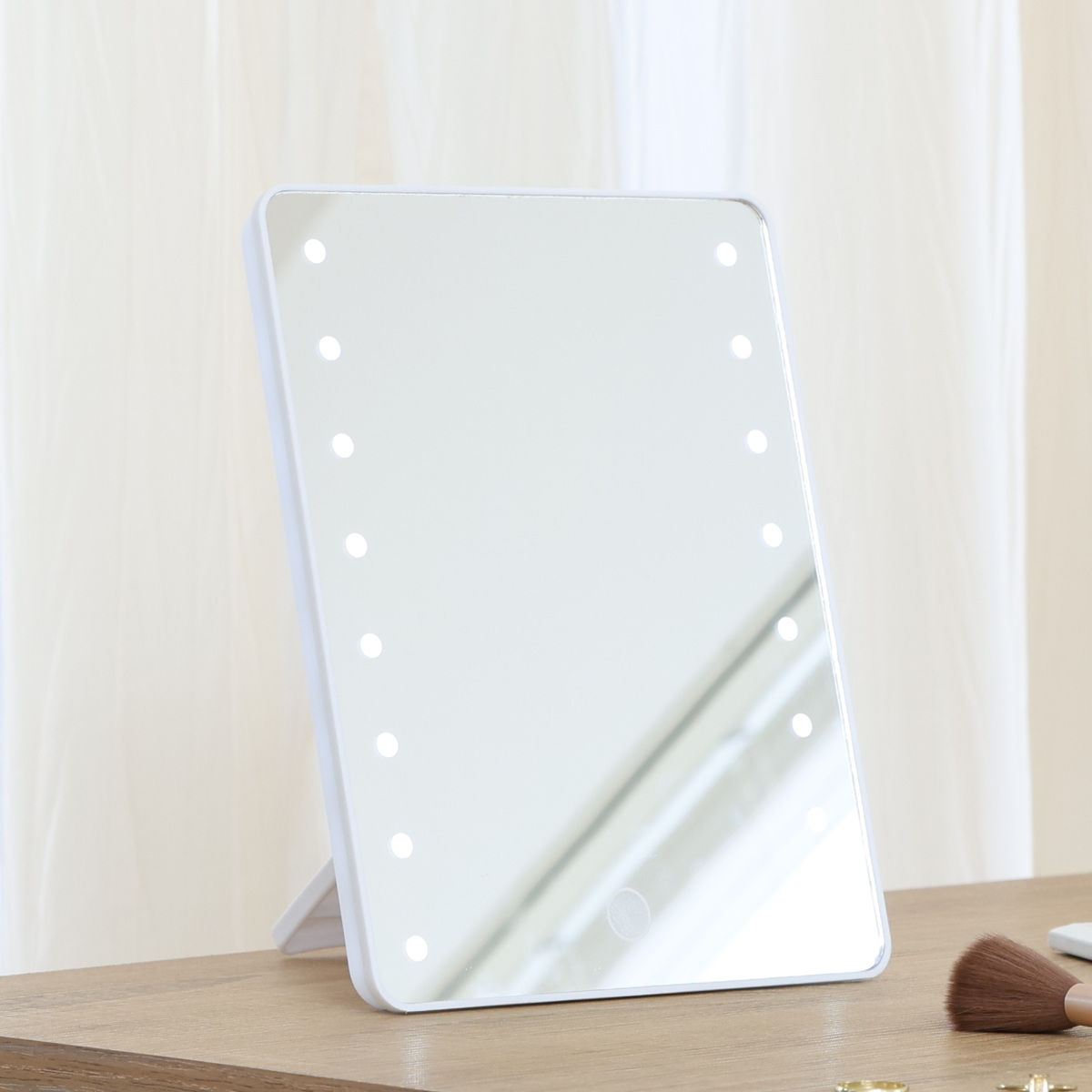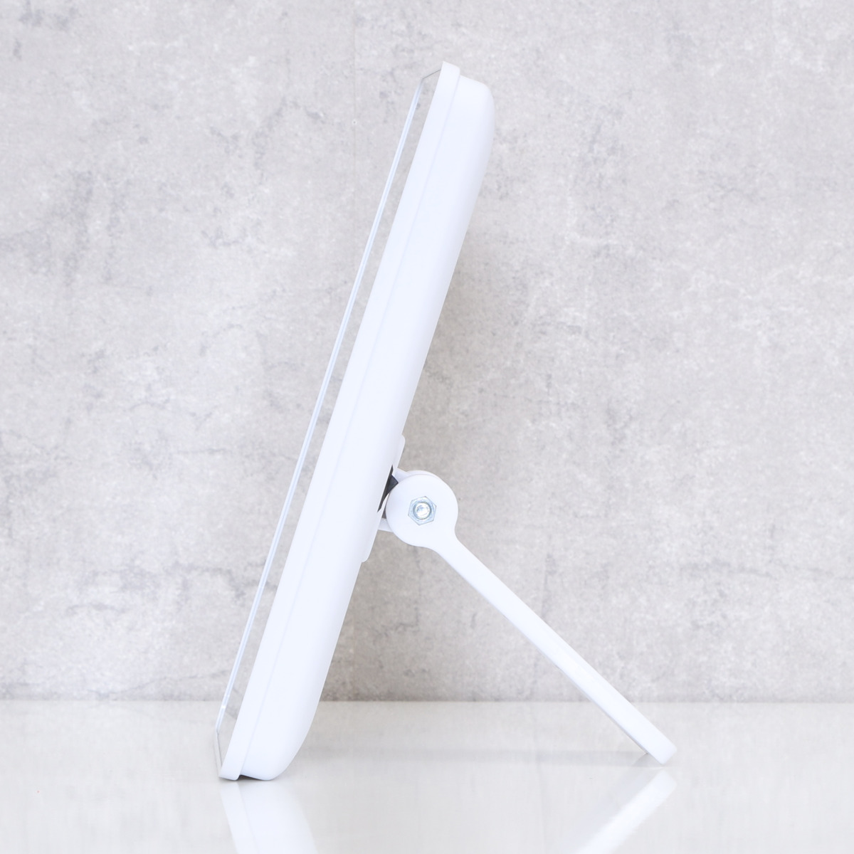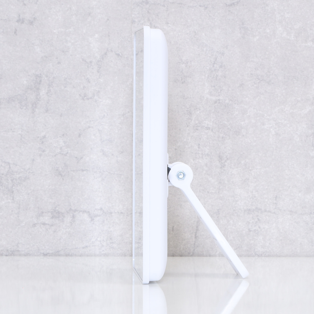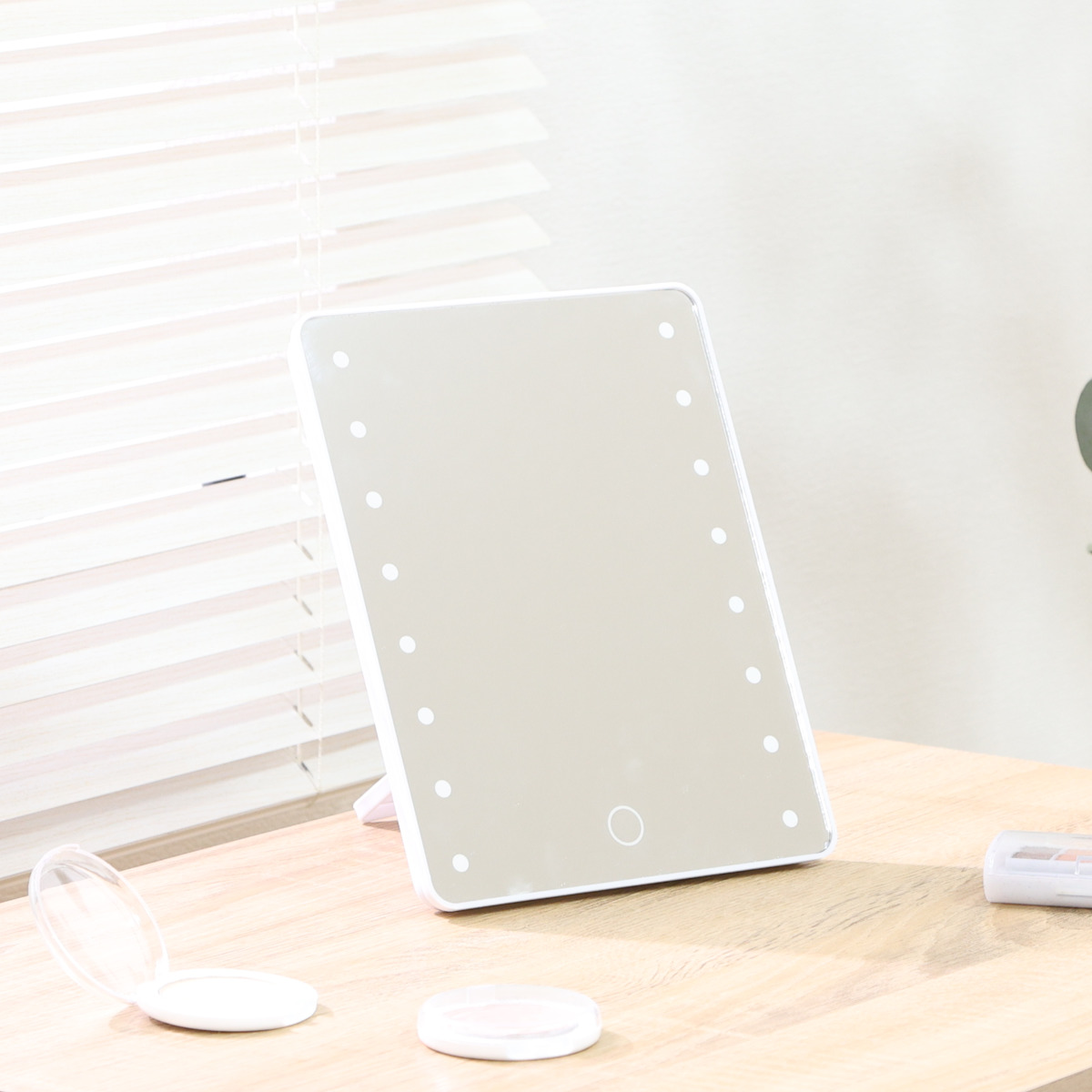 鏡のフチに16個のLEDライトが埋め込まれた卓上ミラーです。自然光が入りにくいお部屋や、時間帯によって明るさが足りない時でも顔全体をムラなく照らし、細かな部分までしっかり確認できます。