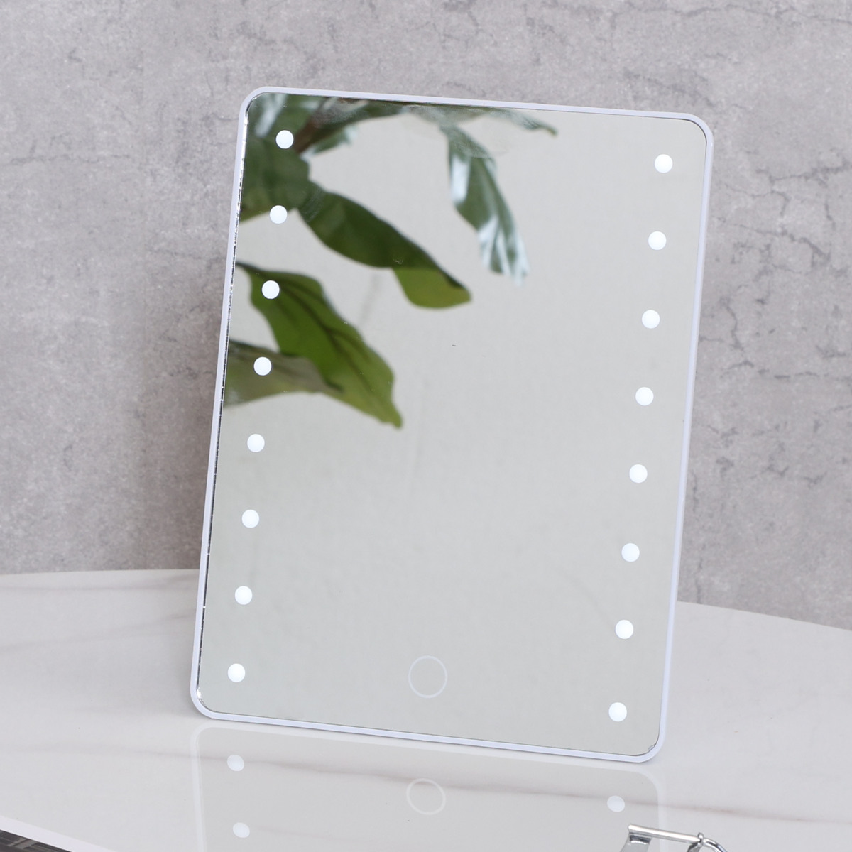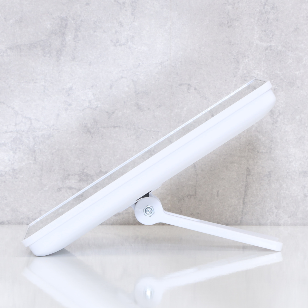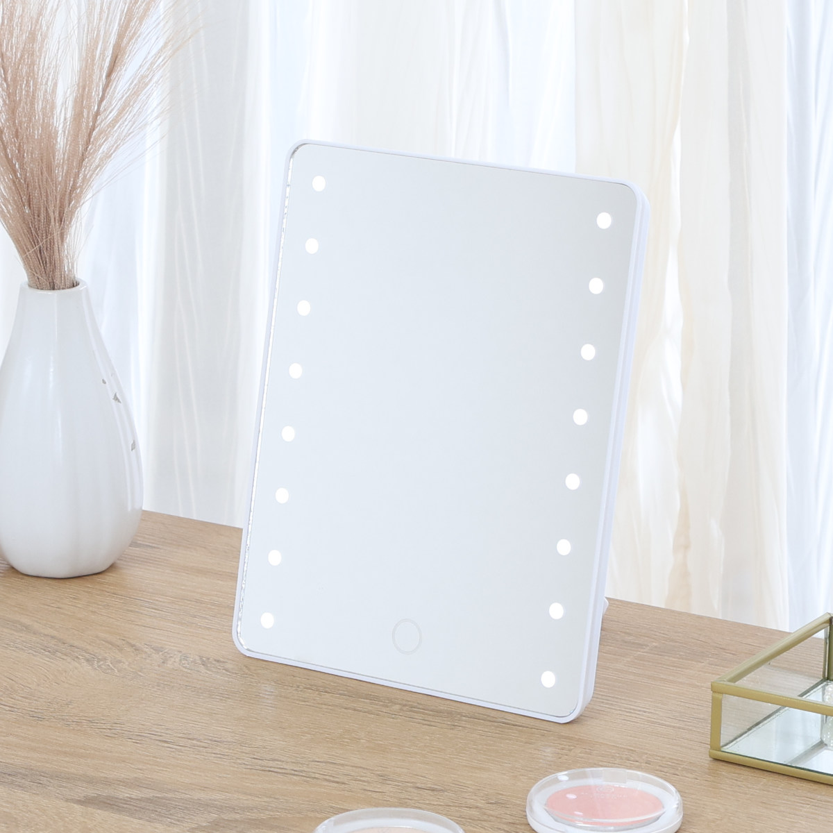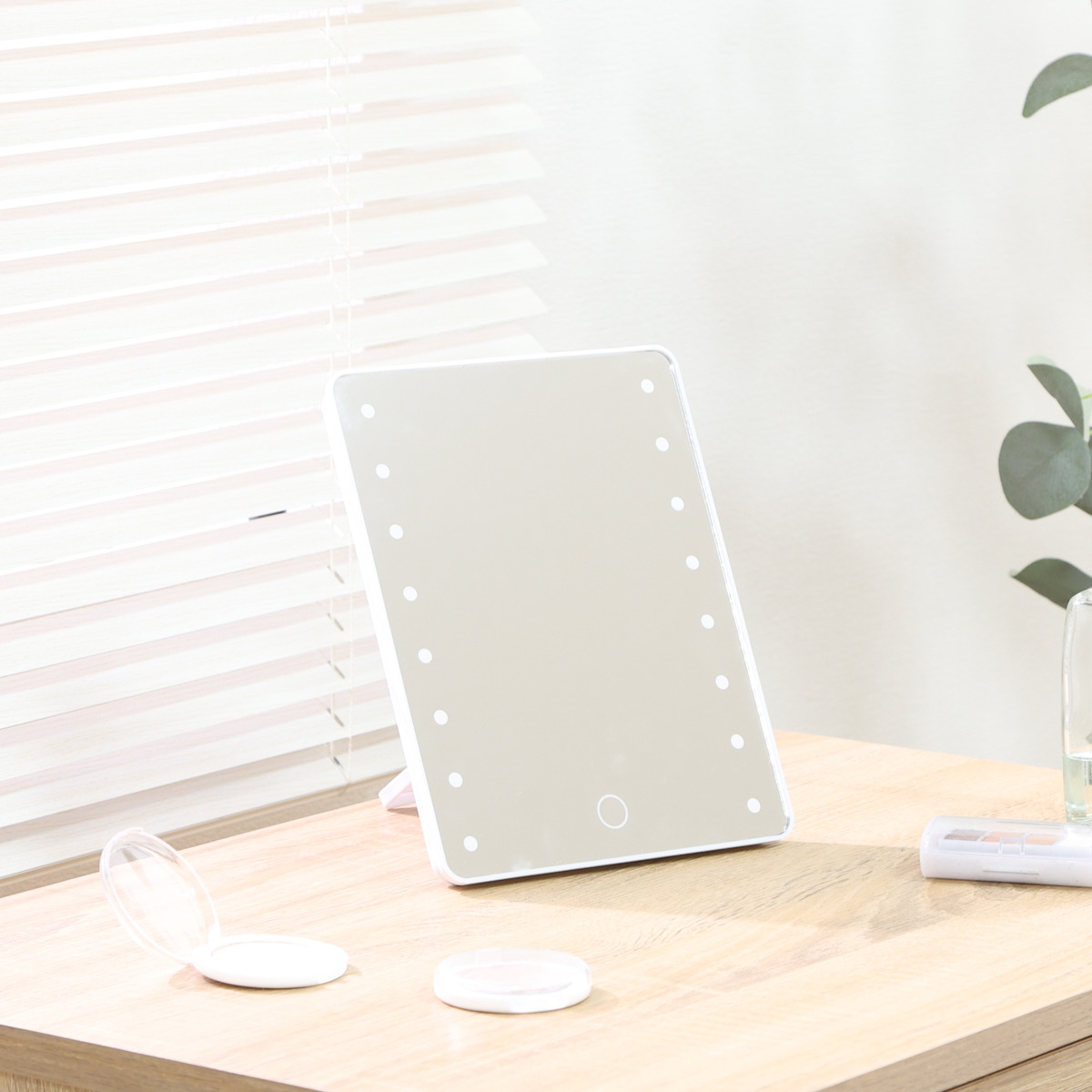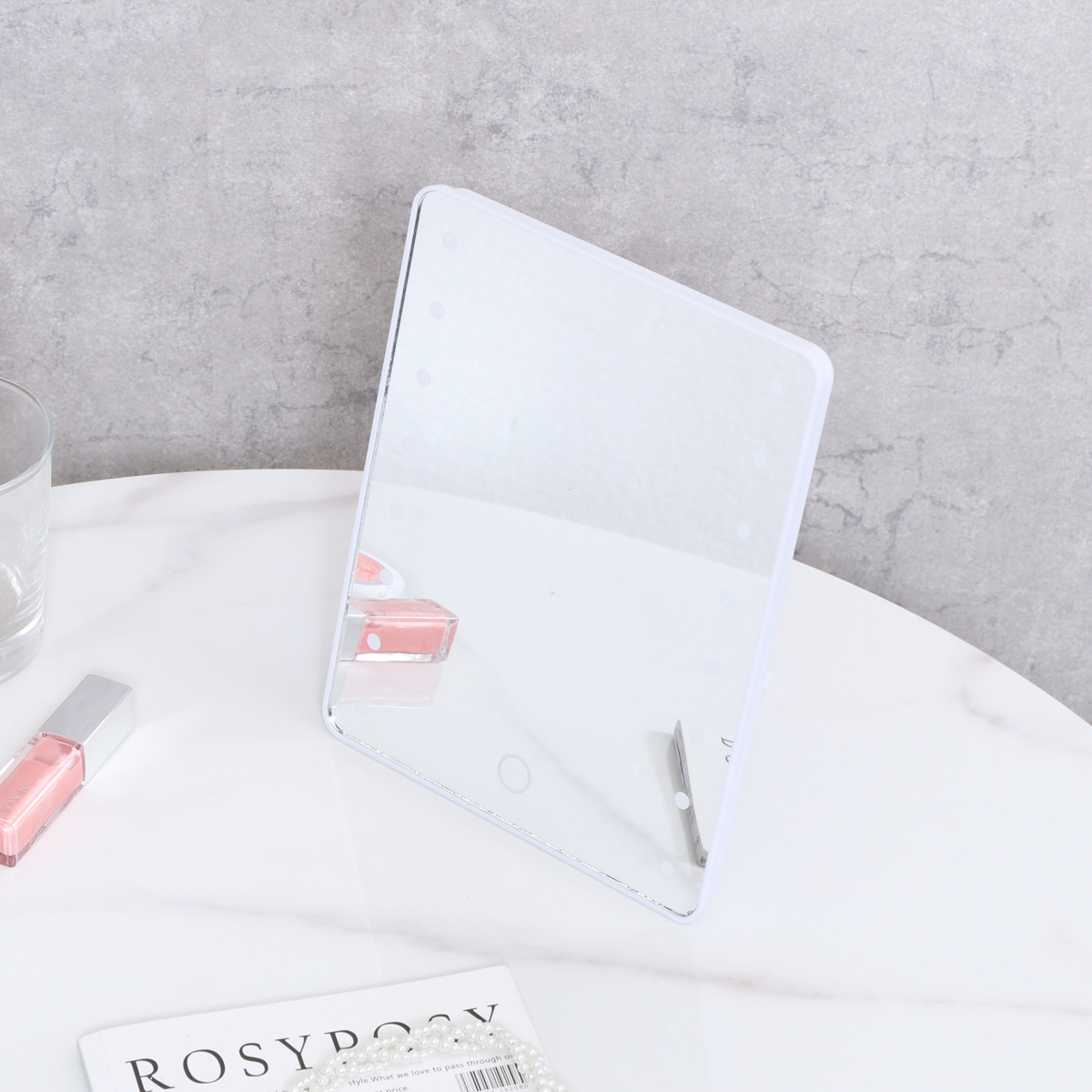 鏡のフチに16個のLEDライトが埋め込まれた卓上ミラーです。自然光が入りにくいお部屋や、時間帯によって明るさが足りない時でも顔全体をムラなく照らし、細かな部分までしっかり確認できます。