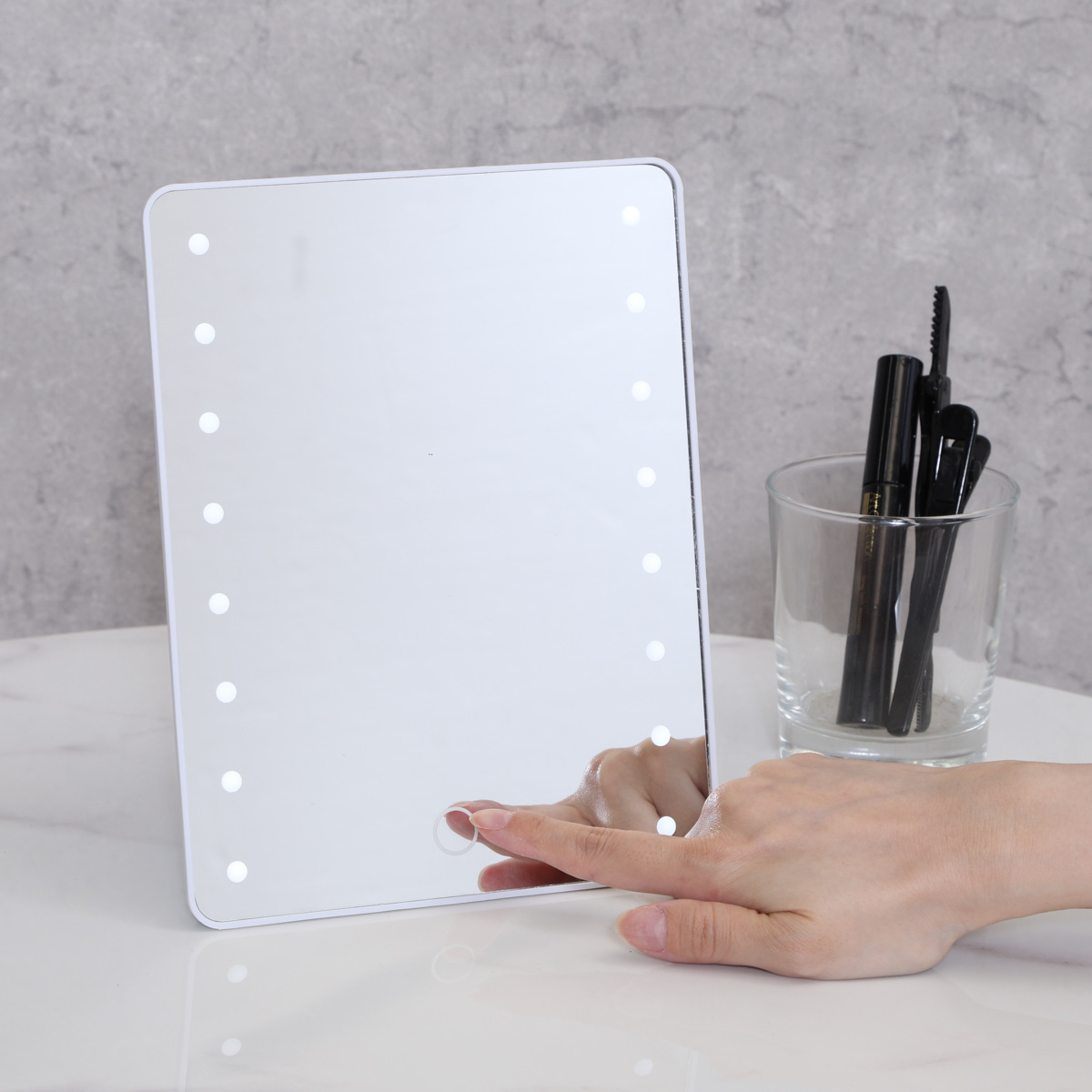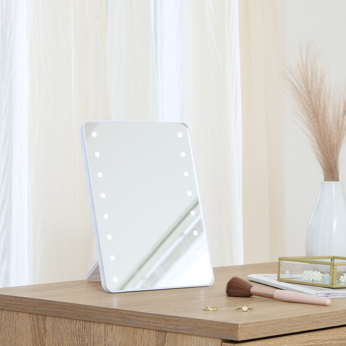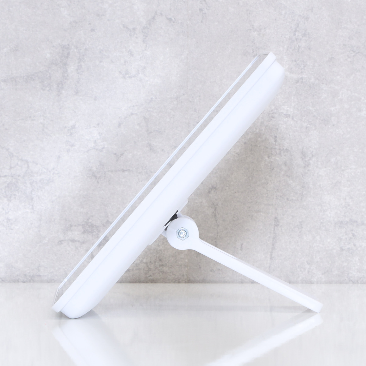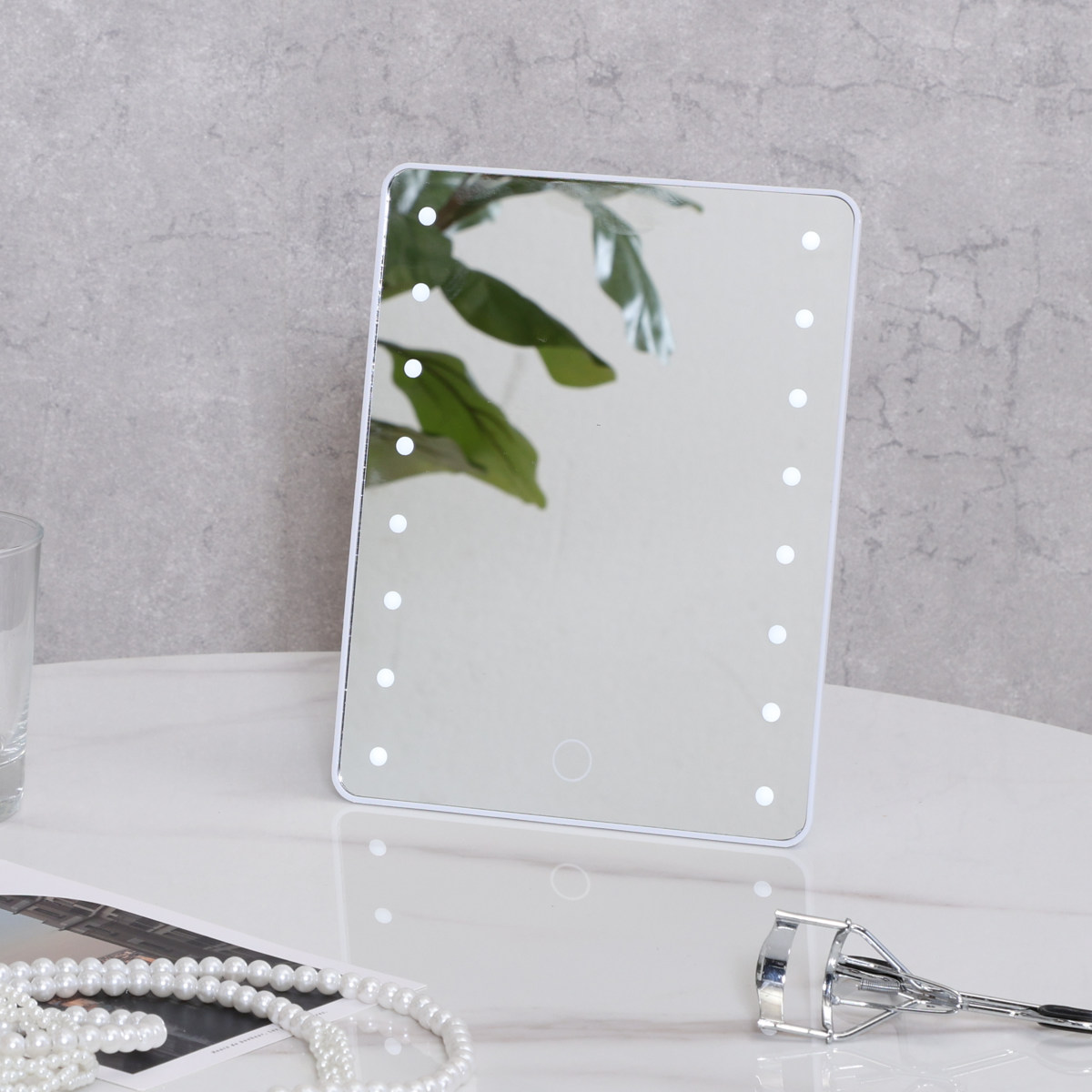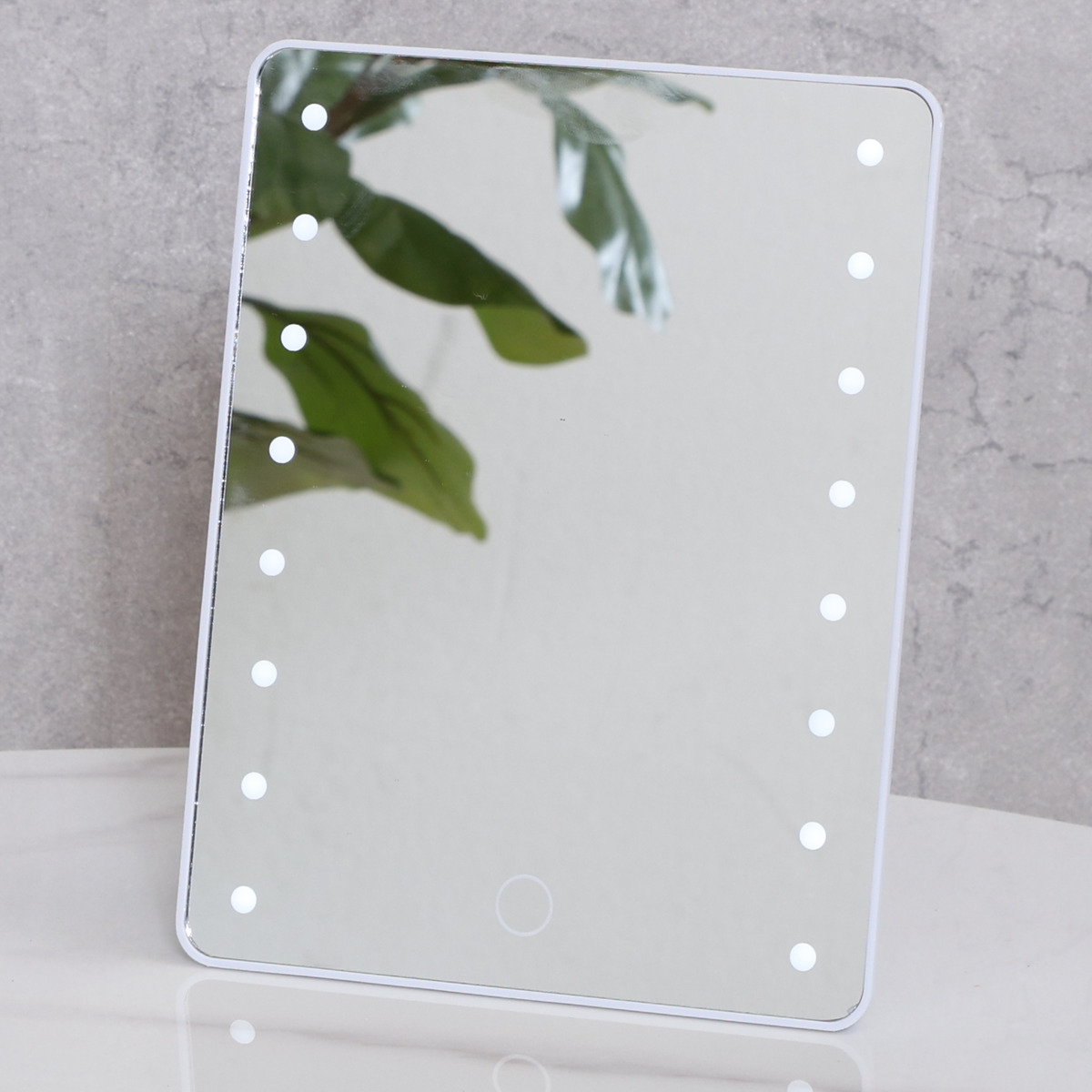 鏡のフチに16個のLEDライトが埋め込まれた卓上ミラーです。自然光が入りにくいお部屋や、時間帯によって明るさが足りない時でも顔全体をムラなく照らし、細かな部分までしっかり確認できます。