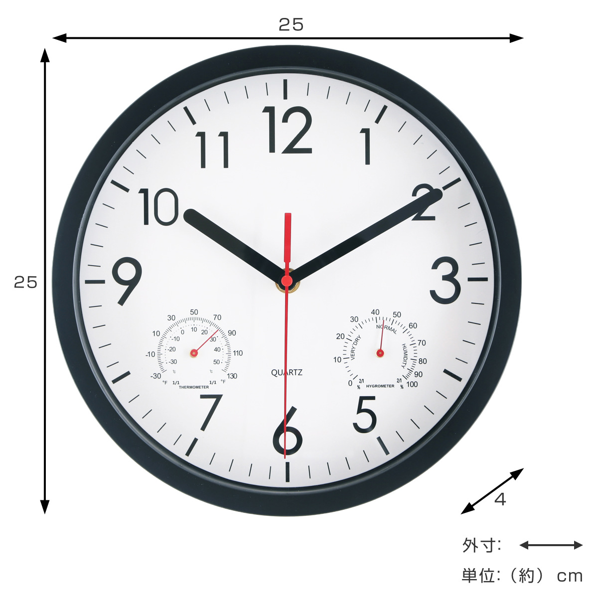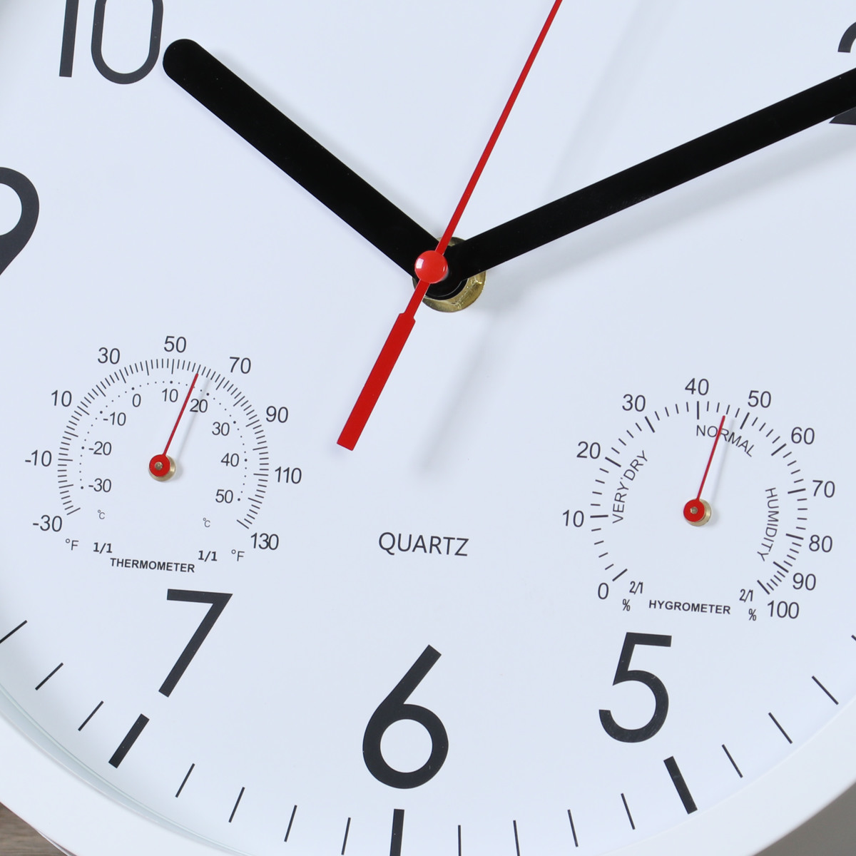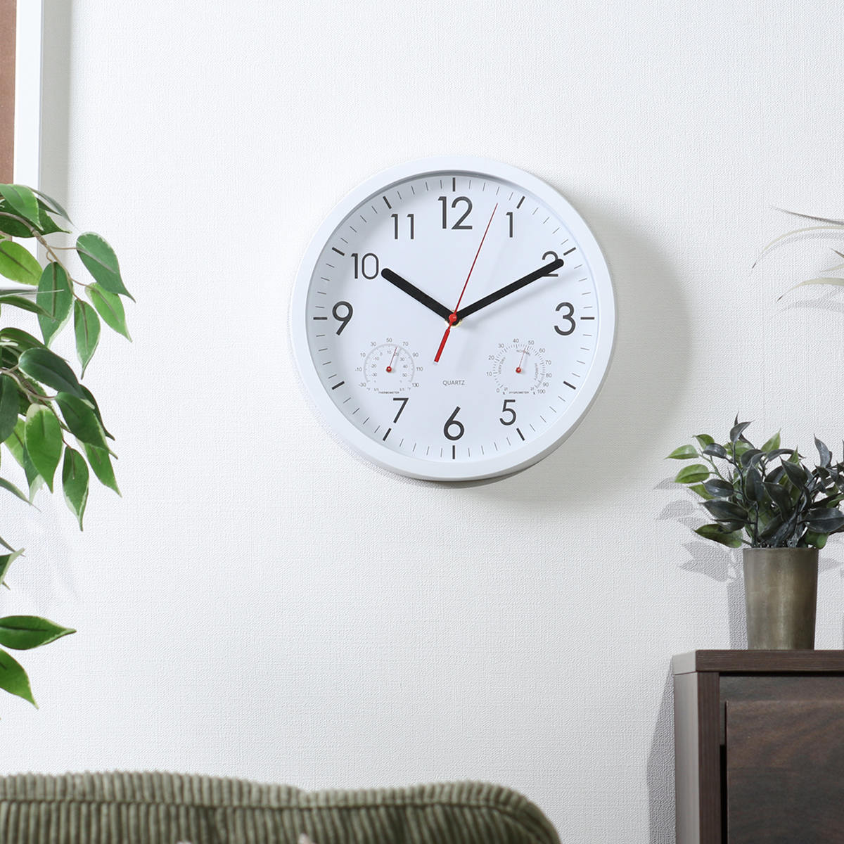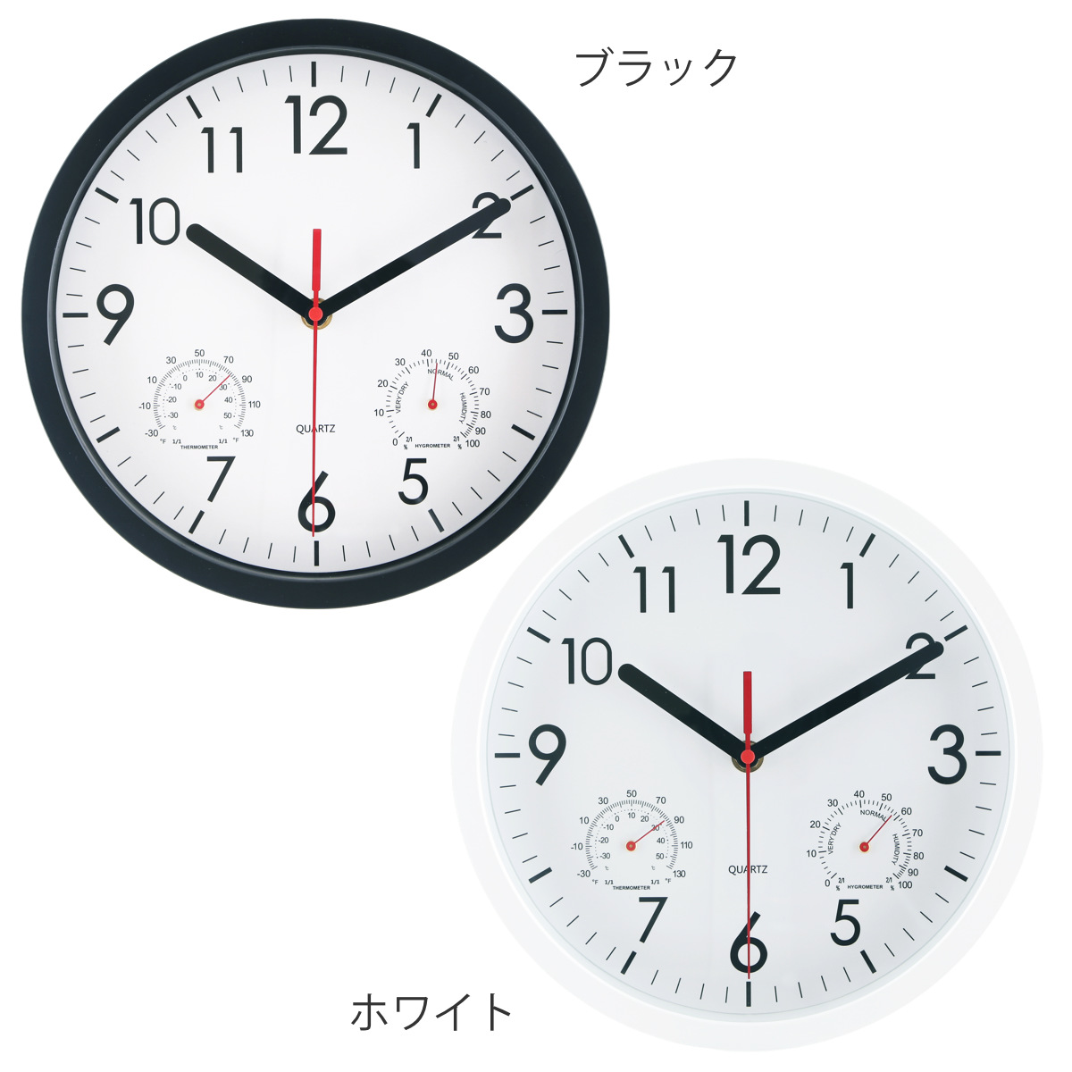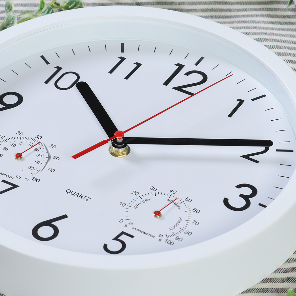 文字盤の左右には、それぞれ温度計と湿度計がついています。時計一つでお部屋の環境をチェックできます。
