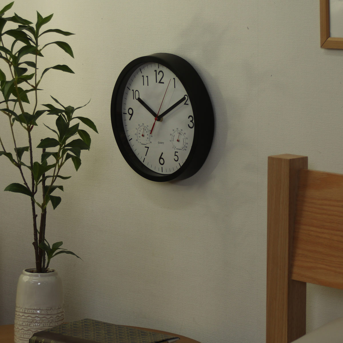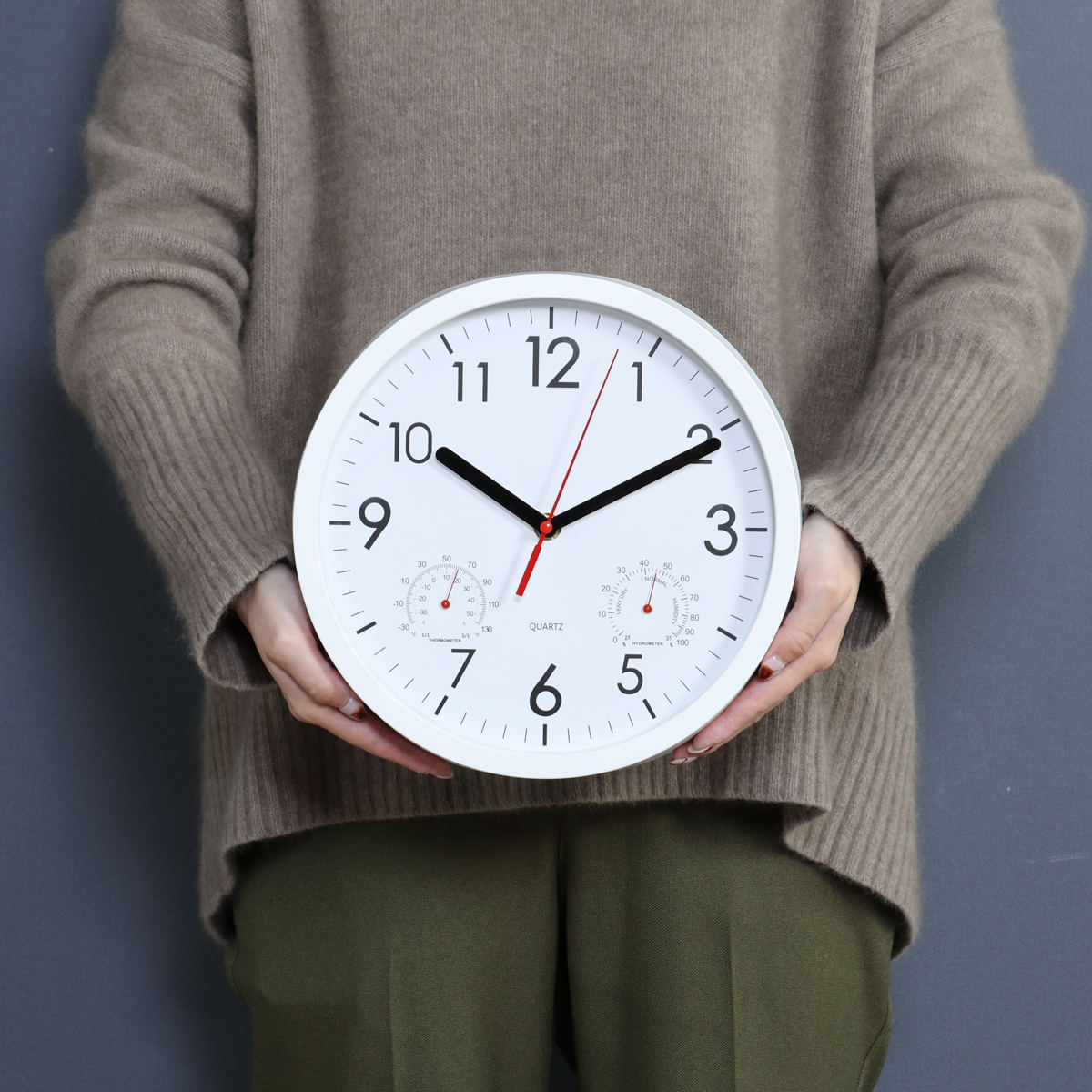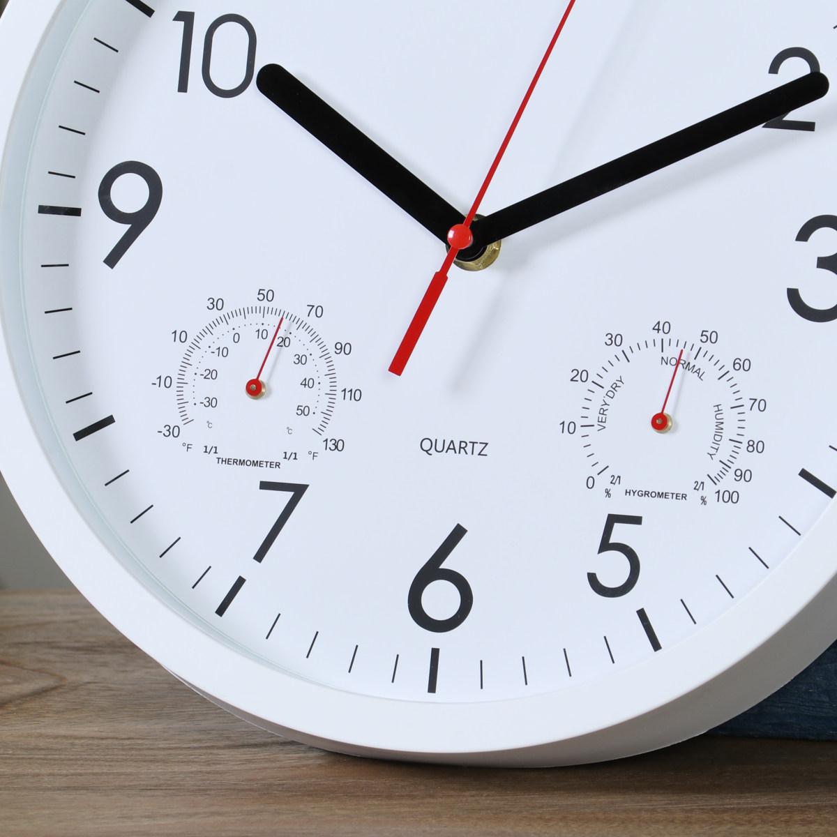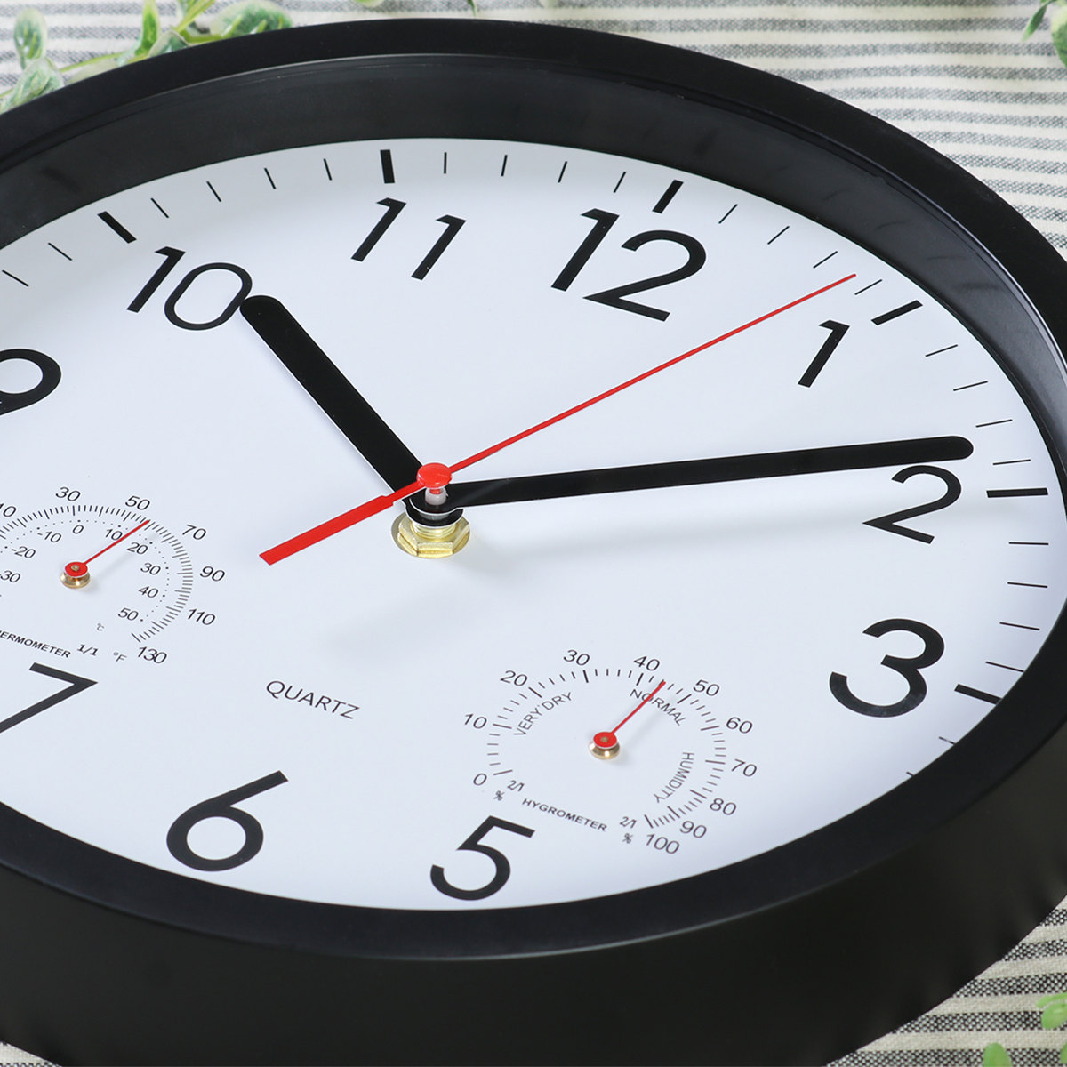文字盤の左右には、それぞれ温度計と湿度計がついています。時計一つでお部屋の環境をチェックできます。
