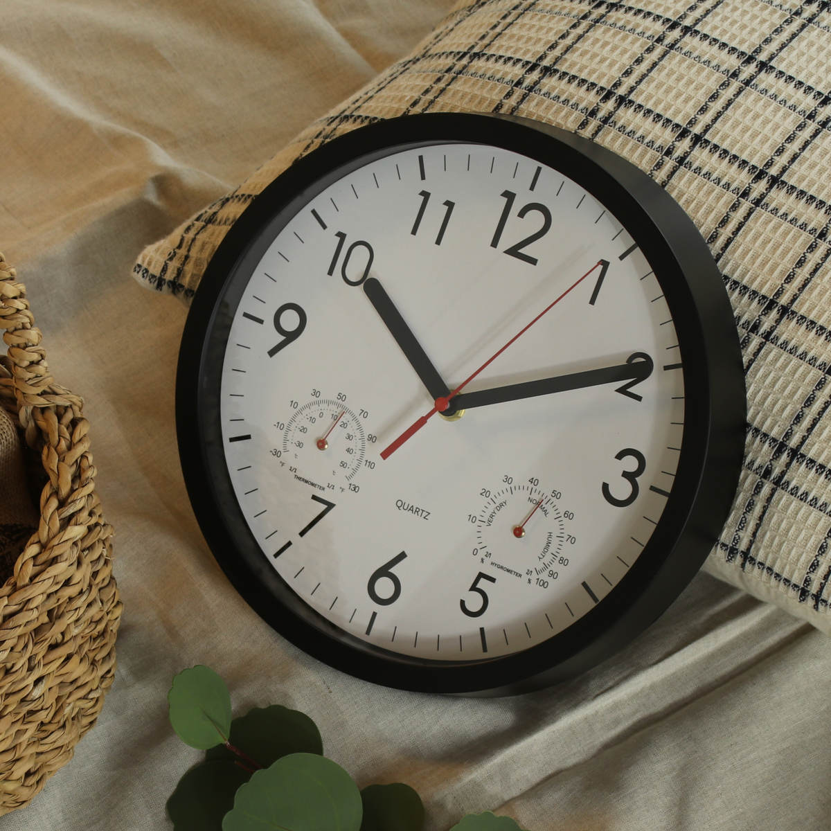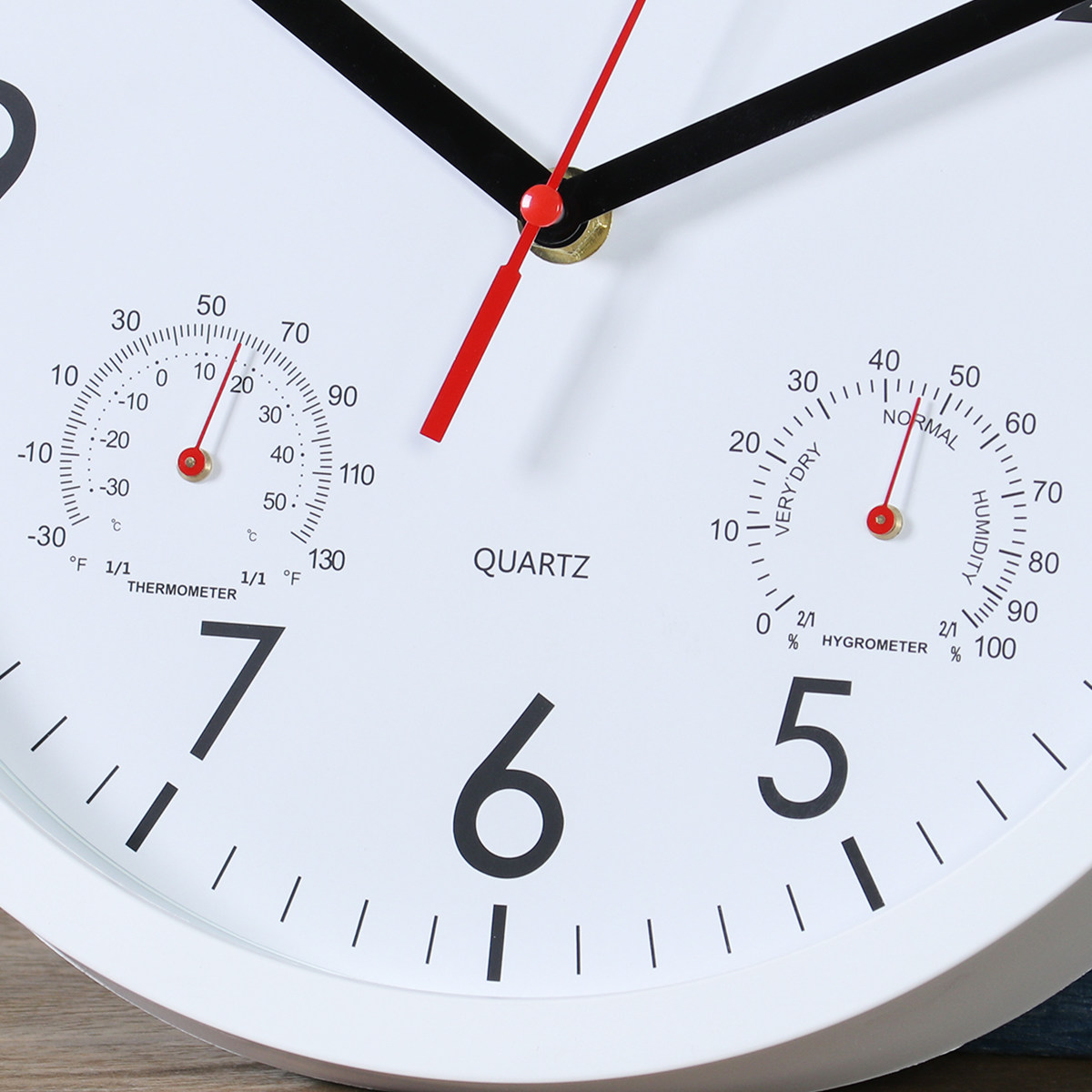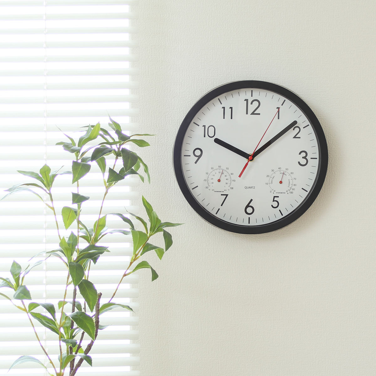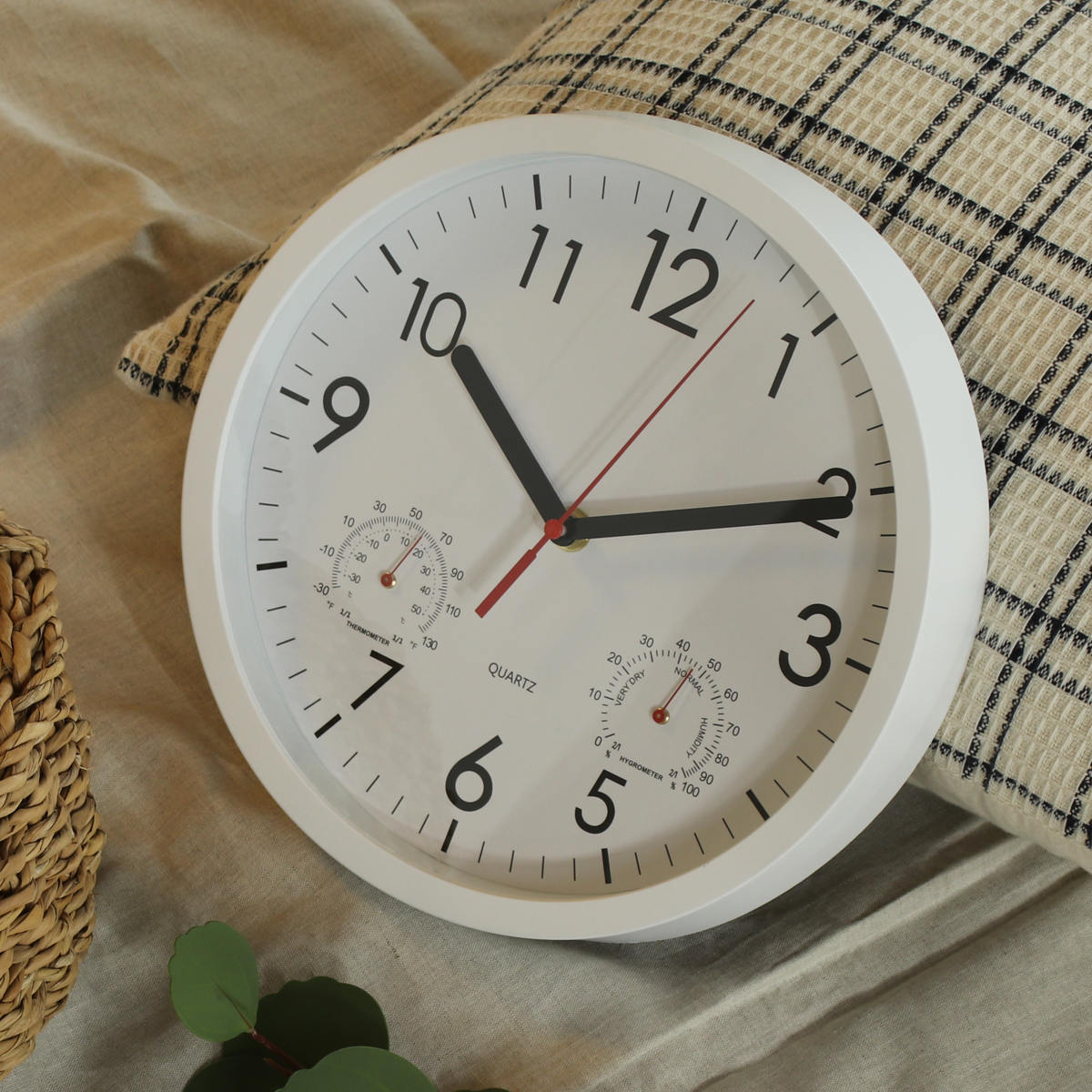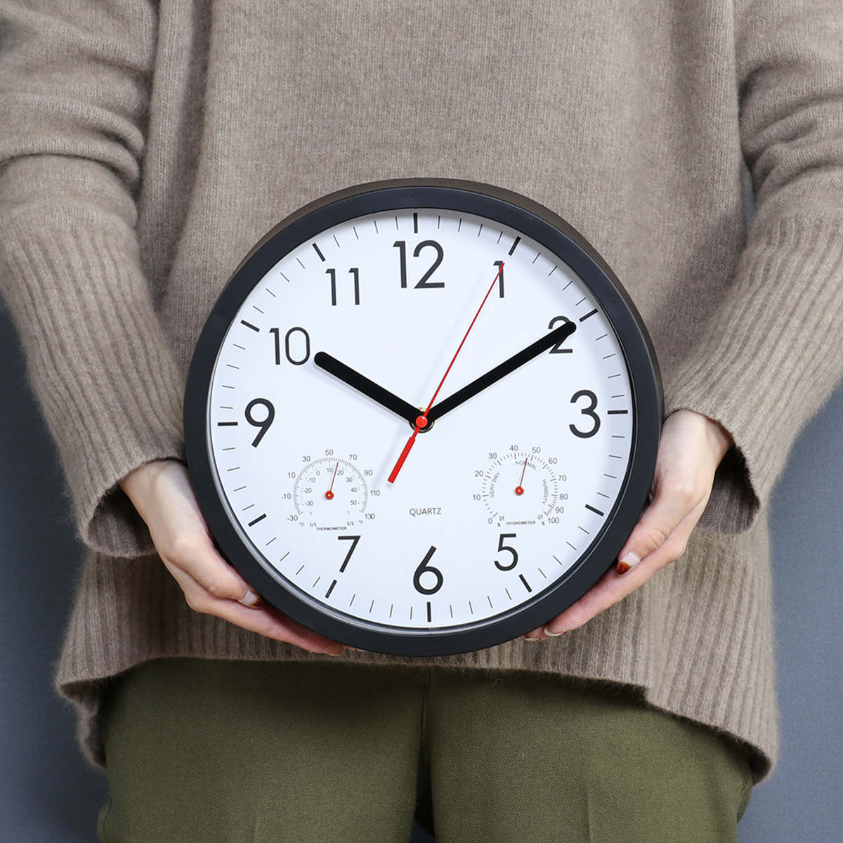 文字盤の左右には、それぞれ温度計と湿度計がついています。時計一つでお部屋の環境をチェックできます。