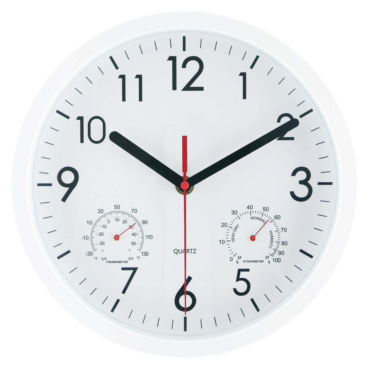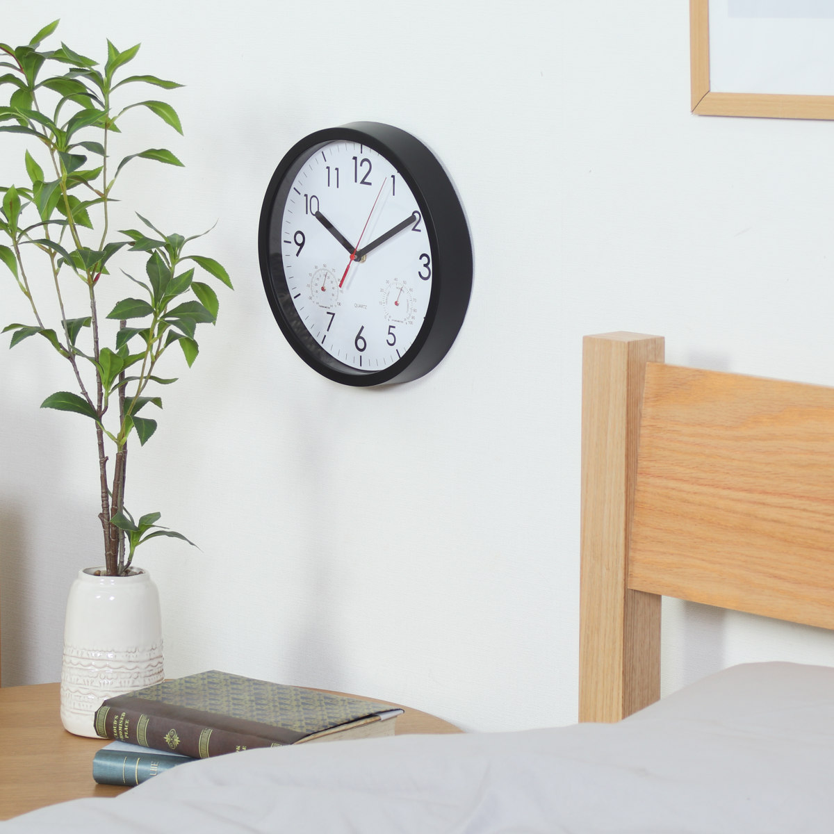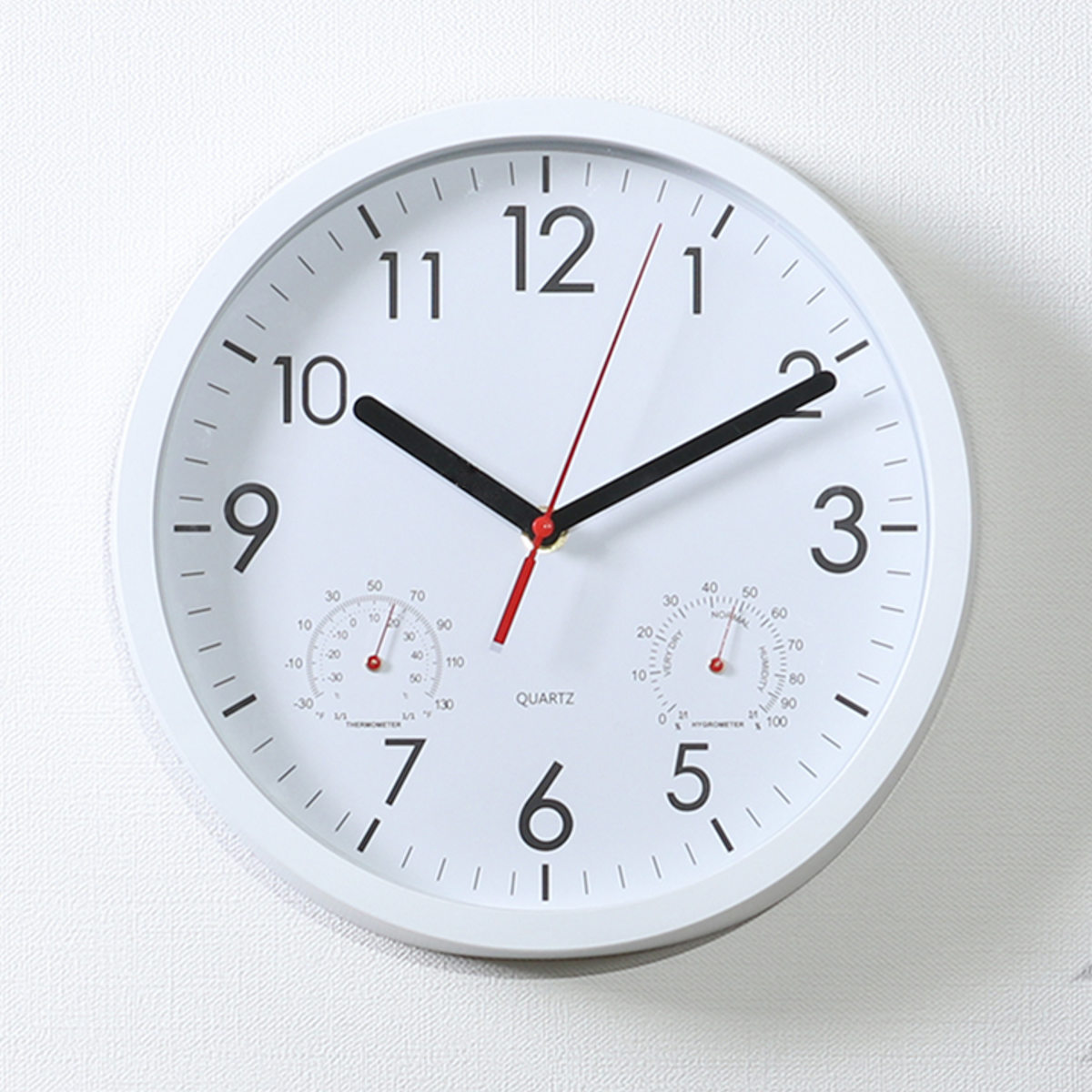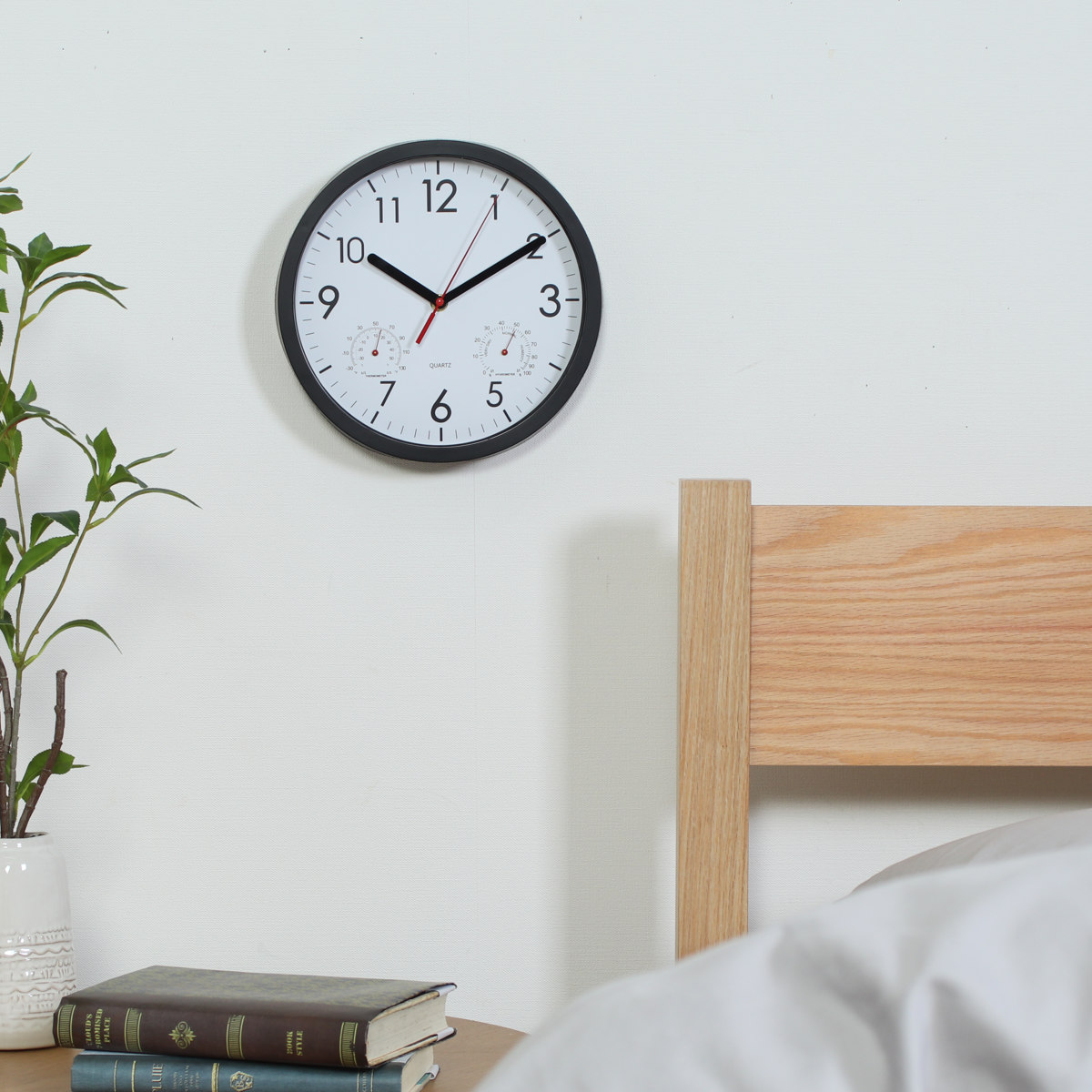 文字盤の左右には、それぞれ温度計と湿度計がついています。時計一つでお部屋の環境をチェックできます。