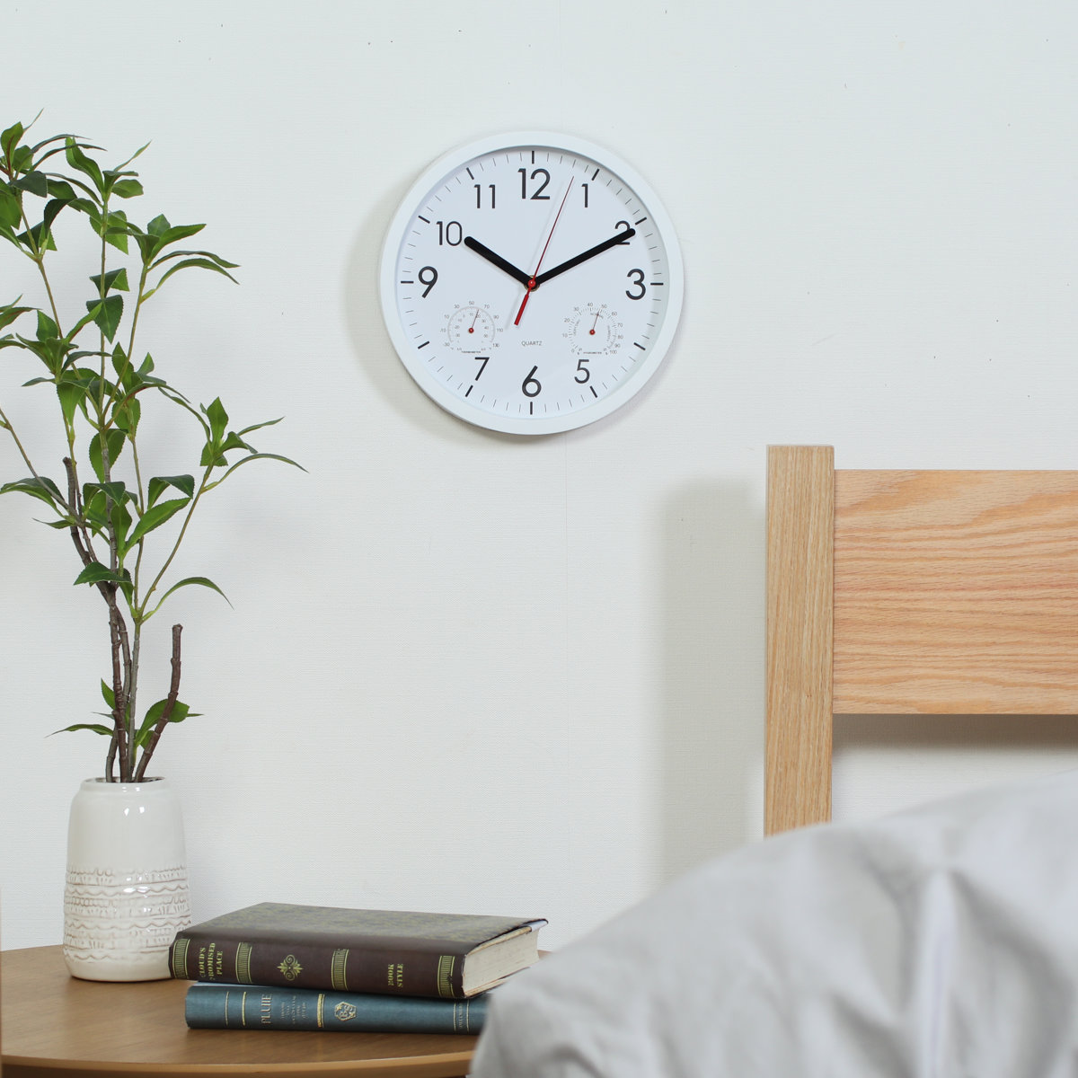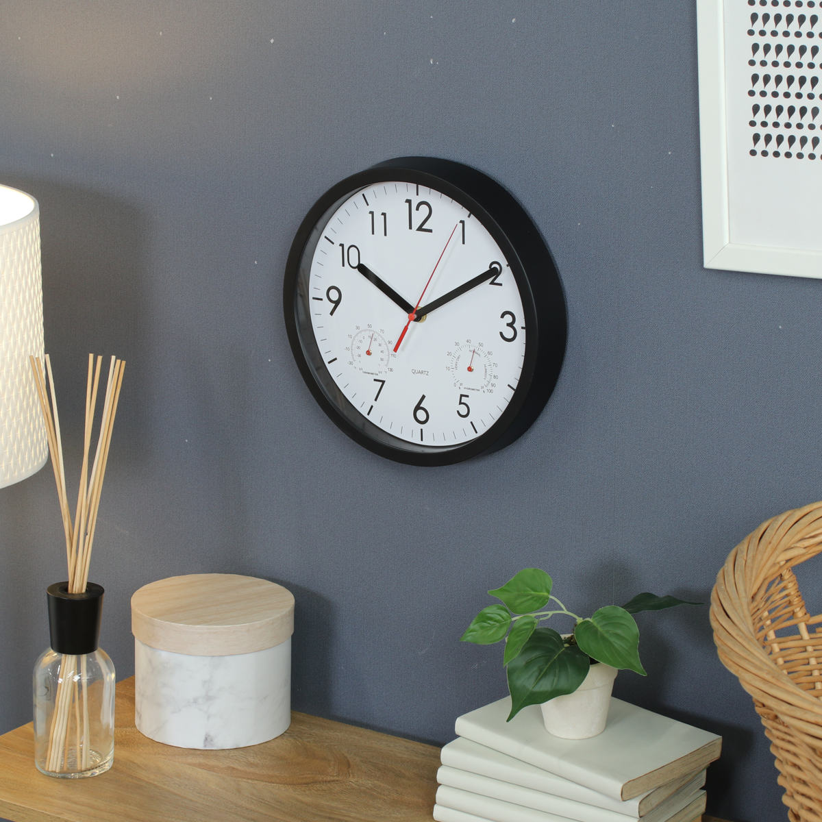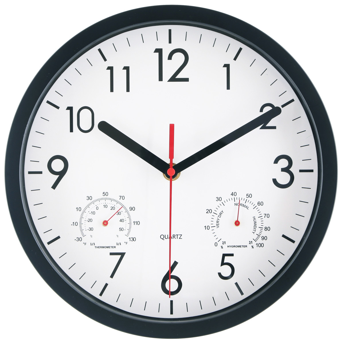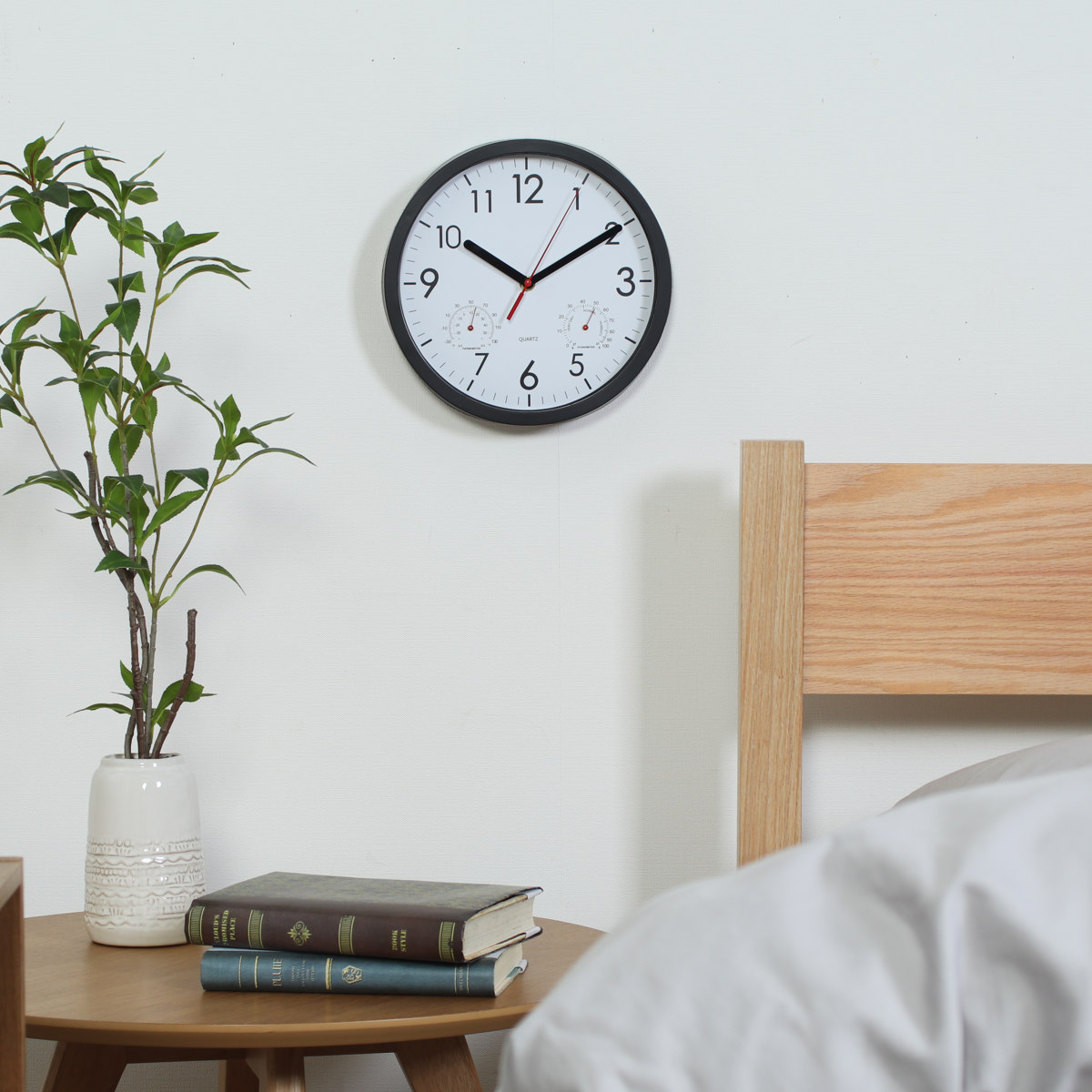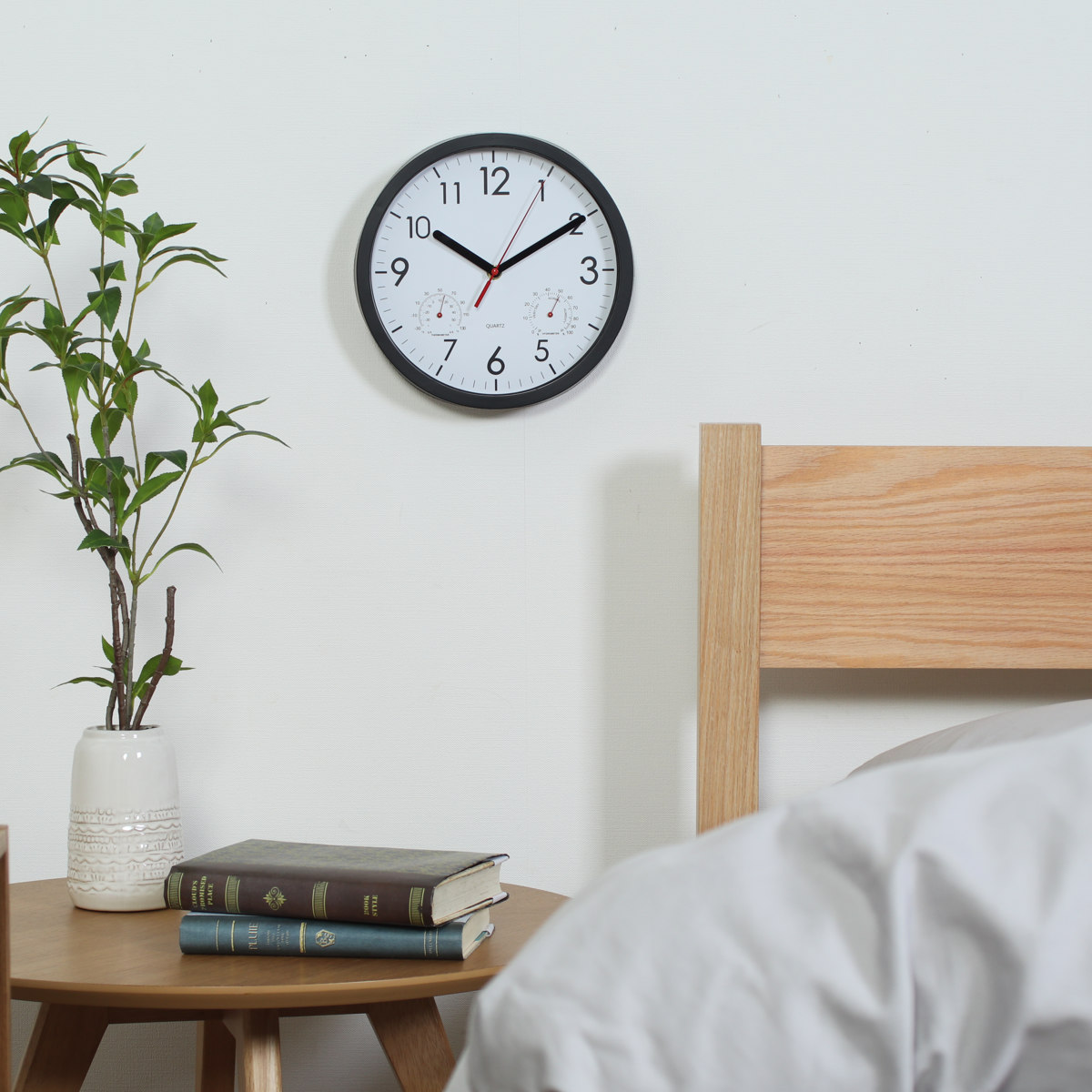 文字盤の左右には、それぞれ温度計と湿度計がついています。時計一つでお部屋の環境をチェックできます。